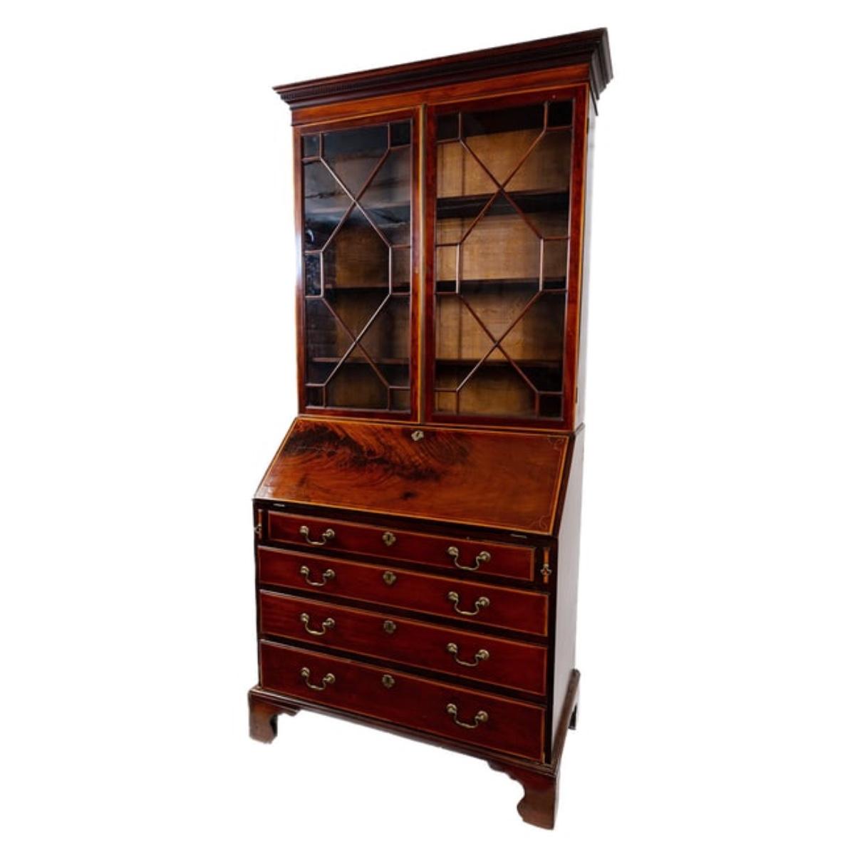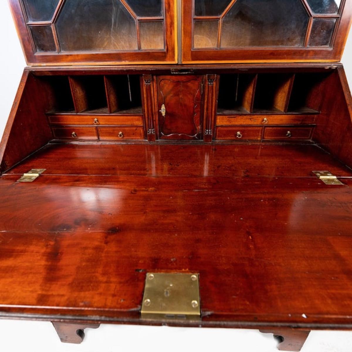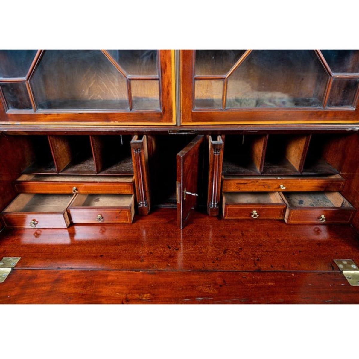 George III Style English Bureau-Bookcase in Mahogany of Rich Color and Patina with Overall Satinwood Banding. The slant front displays beautifully flamed mahogany and opens to reveal a fitted interior with two document drawers and six pigeon holes over six shelves; original brasses throughout; shaped bracket feet; overall desirable size and scale. Small Veneer damage on bottom of left glass door please refer to photos. Last half of nineteenth century measuring 86.5" high x 42.25" wide x 21" deep