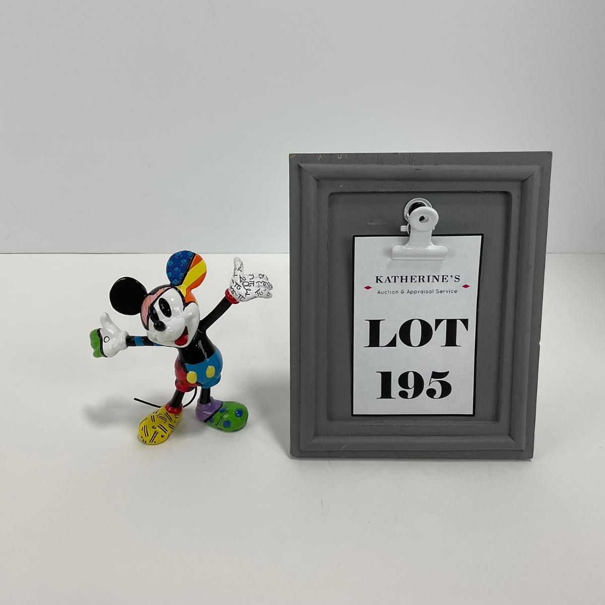 One small Romero Britto Disney mini Mickey Mouse “Arms Up” figurine in great shape and signed. Please see photos for details and condition. Any condition statement is given as a courtesy to a client, is an opinion, and should not be treated as a statement of fact. Reference to condition written, oral or within a condition report shall not be regarded as a full account of condition and may not include all defects, alterations, or restorations. Absence of a condition report does not imply a lot is flawless or lacking imperfections or damage. Katherine’s Auction & Appraisal Service shall have no responsibility for any error or omission. Returns shall not be accepted on the basis of condition. ::: Shipping is available on this lot. If you require shipping you must let us know at the close of the auction. We will coordinate with you after the item has been won. Shipping fees will include insurance up to or exceeding the value of all items being mailed. If you have any questions regarding this lot please contact the auctioneer either via this website, by direct email or by phone. PICK UP TIMES and other important information can be found in the TERMS and DESCRIPTION of the auction. Please take a look for pertinent information. Thanks!