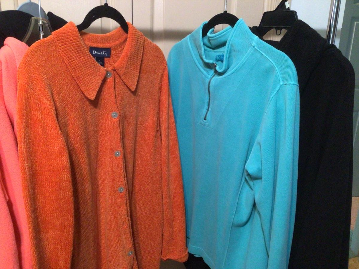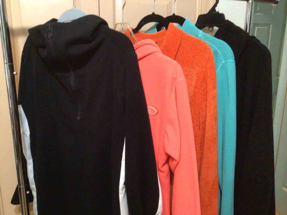 Lot of zip up pullover sweatshirts, jackets, poncho and more. Sizes range from M-XL.