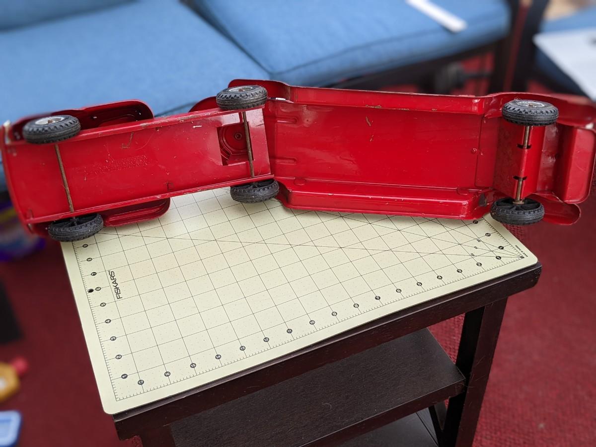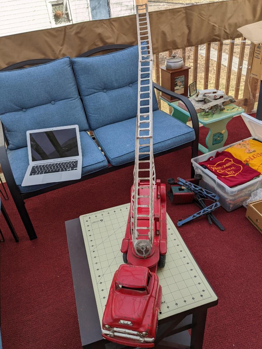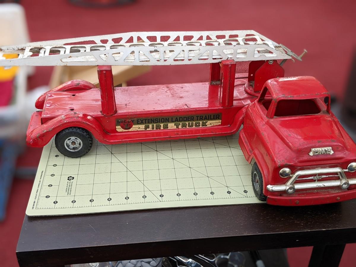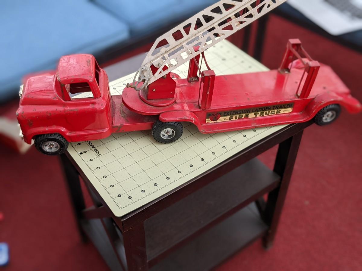 1950 BUDDY L GMC 550 Extension Ladder Trailer Fire Truck 28" Red Steel Moline IL