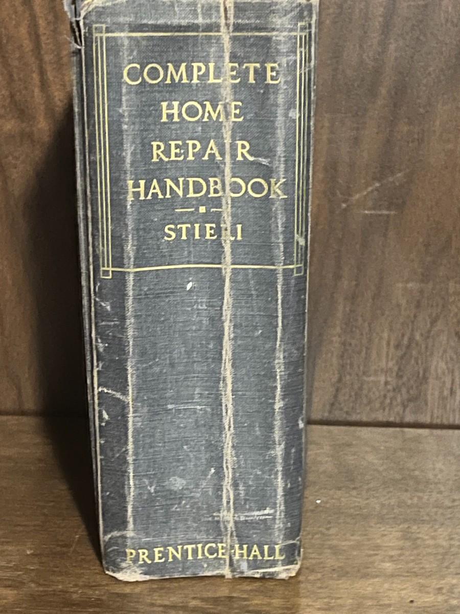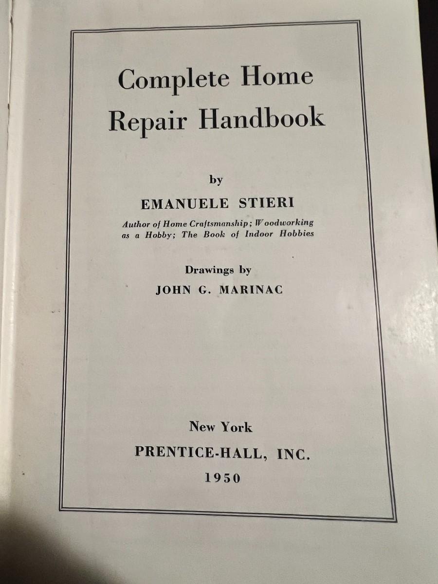 Original 1950 hardcover edition of Complete Home Repair Handbook by Emanuele Stieri, published by Prentice-Hall. Illustrated throughout with drawings by John G. Marinac. This thick, practical volume covers nearly all aspects of mid-century home maintenance—carpentry, plumbing, electrical work, roofing, tools, interior repair, and DIY projects.