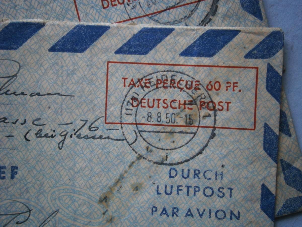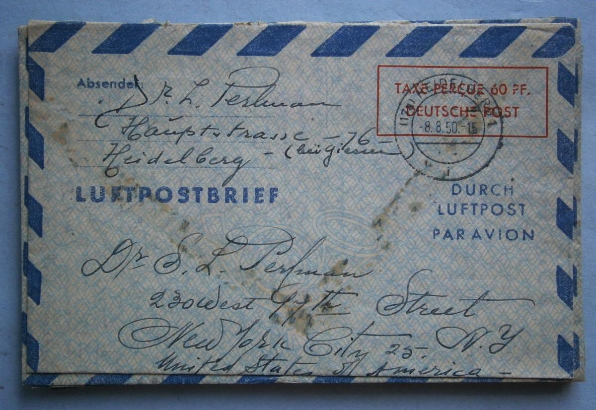 1950 Airmail Letter - Taxe Percue German Post Heidelberg to NYC5 ,3/4 x 3 x 3 3/4 in.