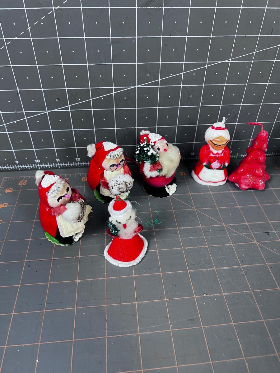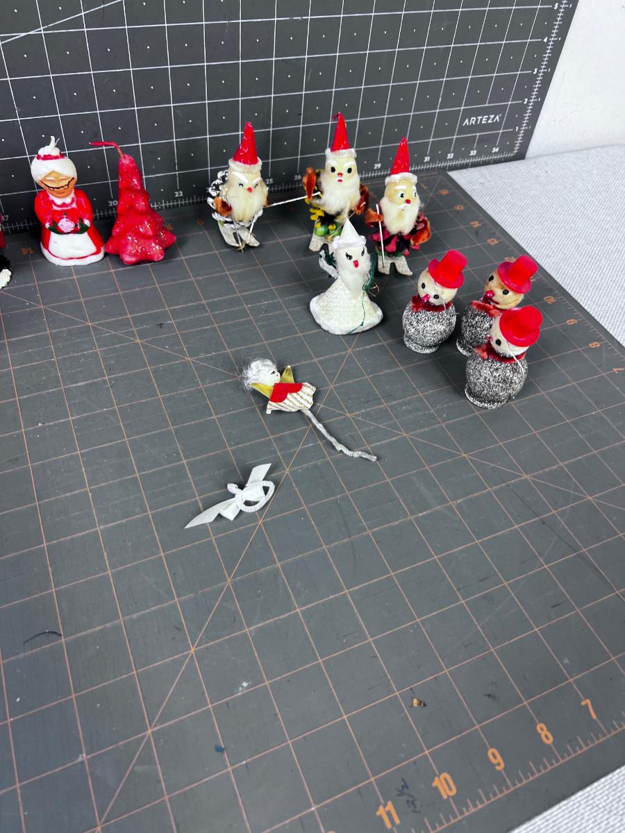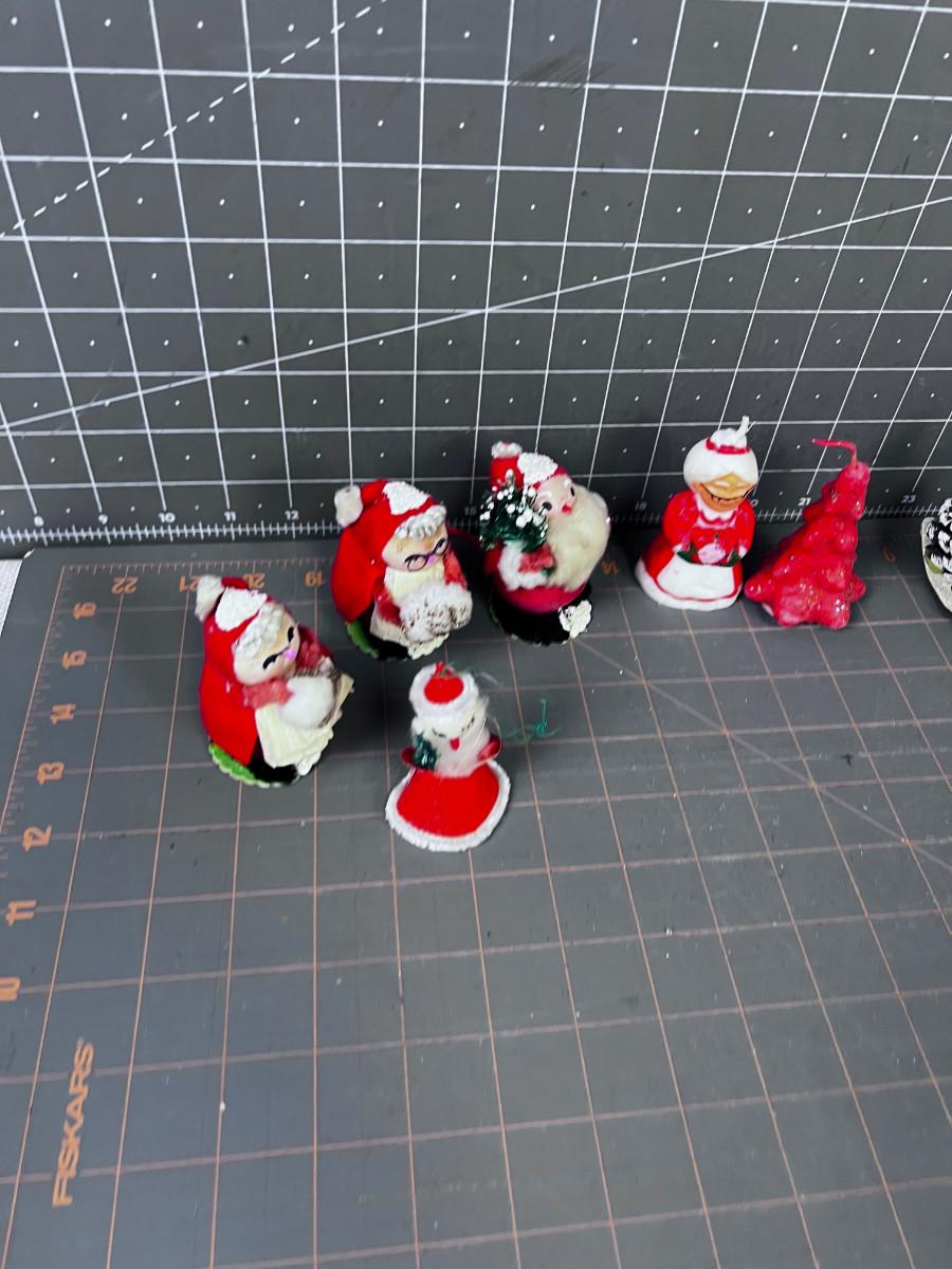 1950's & 60's Christmas Décor: Santa, Candles, Pinecone, Glitter Snowman.