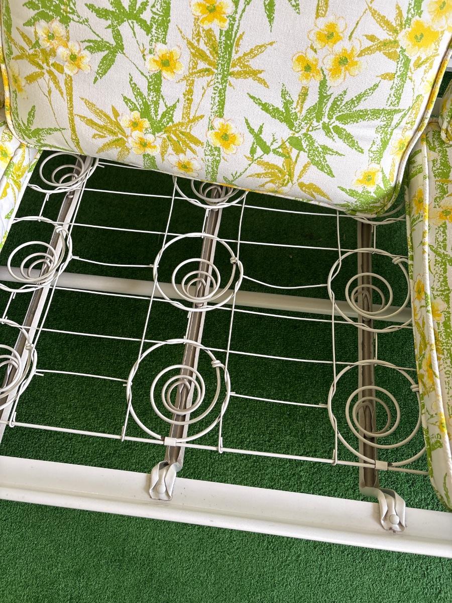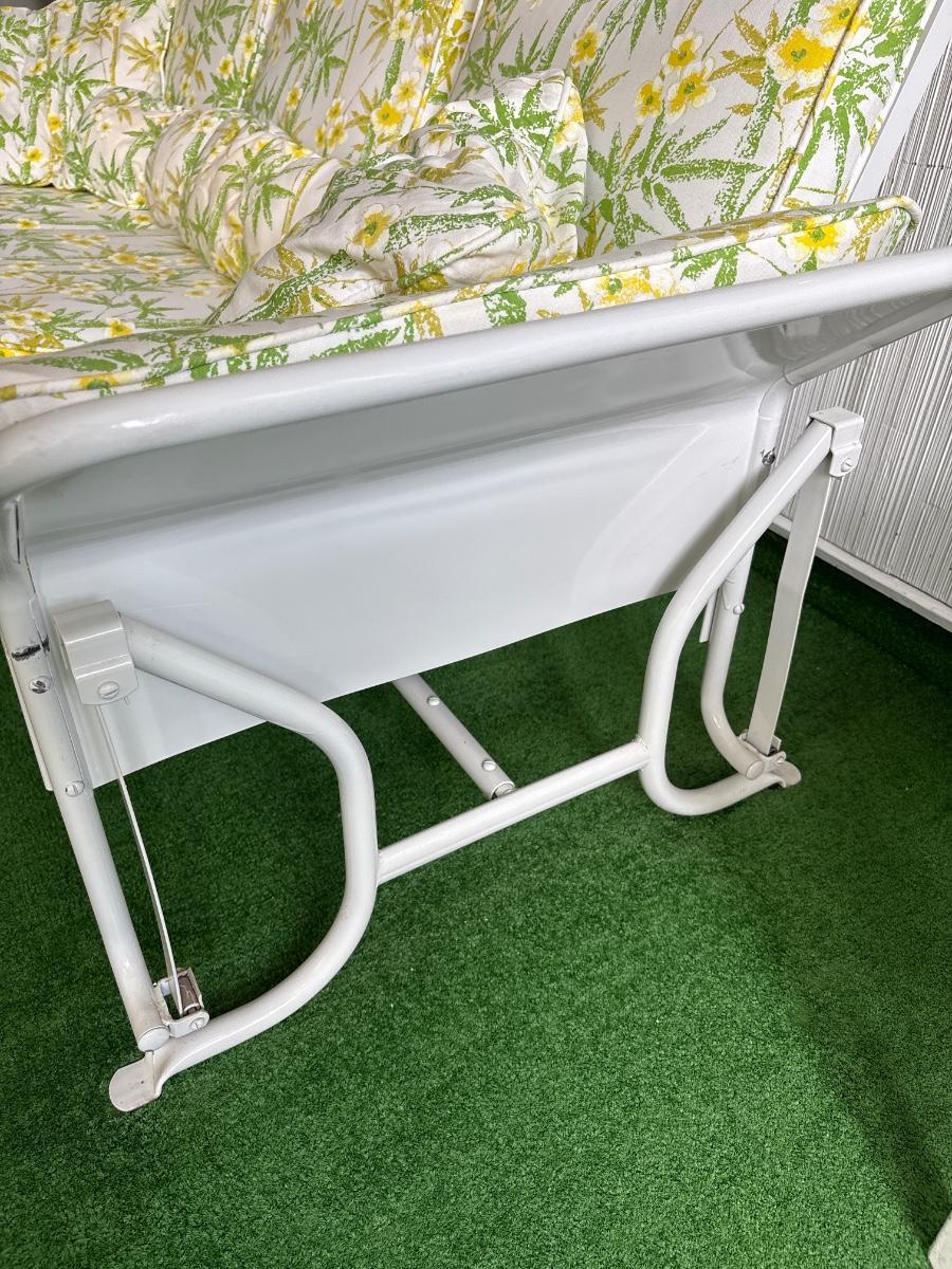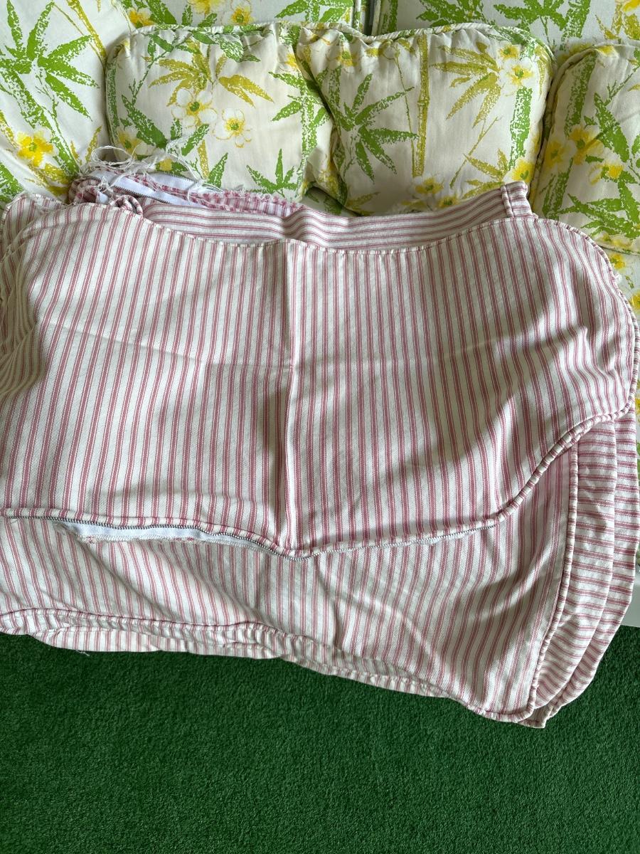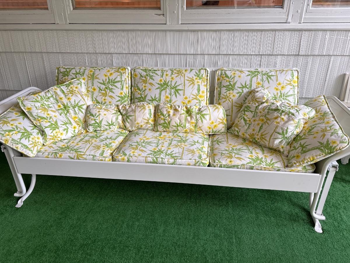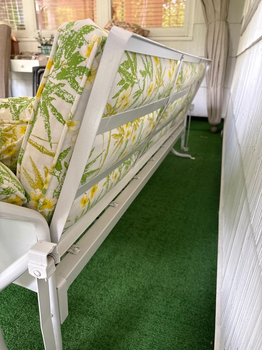 Comes with striped cushion covers. In excellent condition.. 82” long x 30” deep