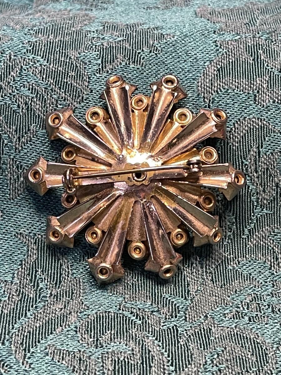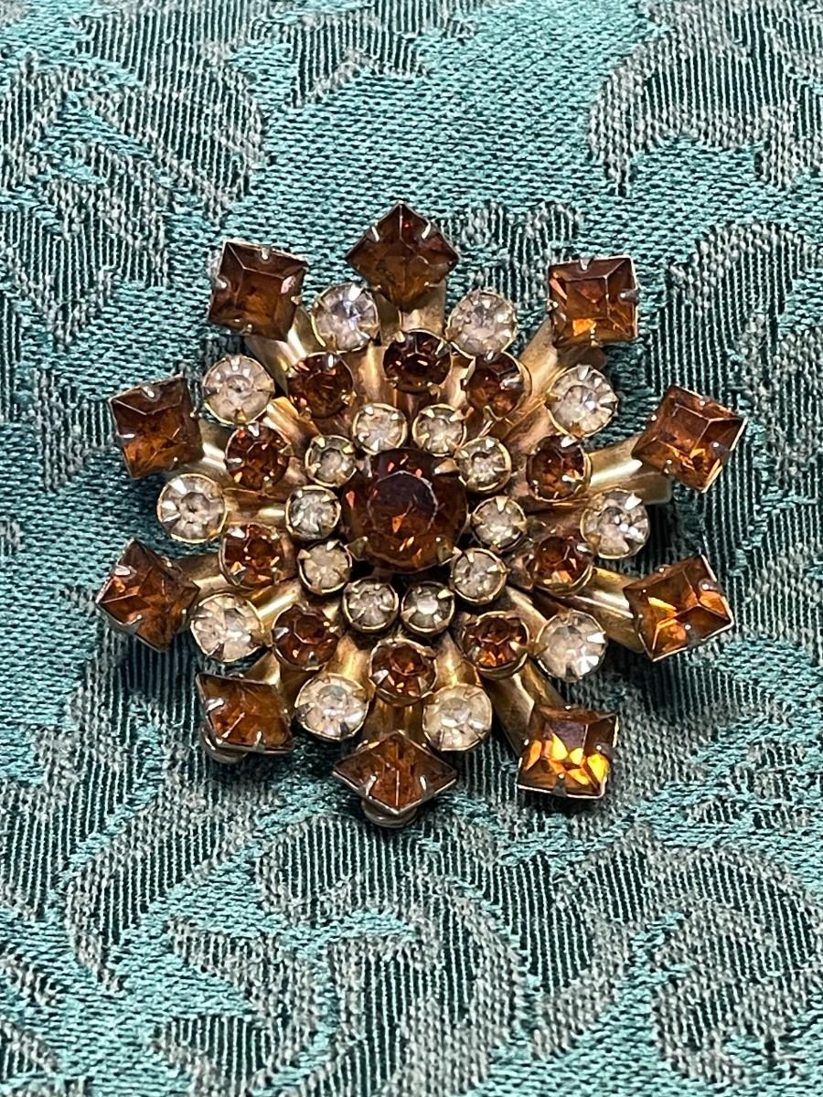 Gorgeous amber and clear Austrian crystals create a sparkle and shine perfect for your fall wardrobe. This piece hass all of the stones intact and measures about 2" in diameter. There are no markings to indicate the maker.