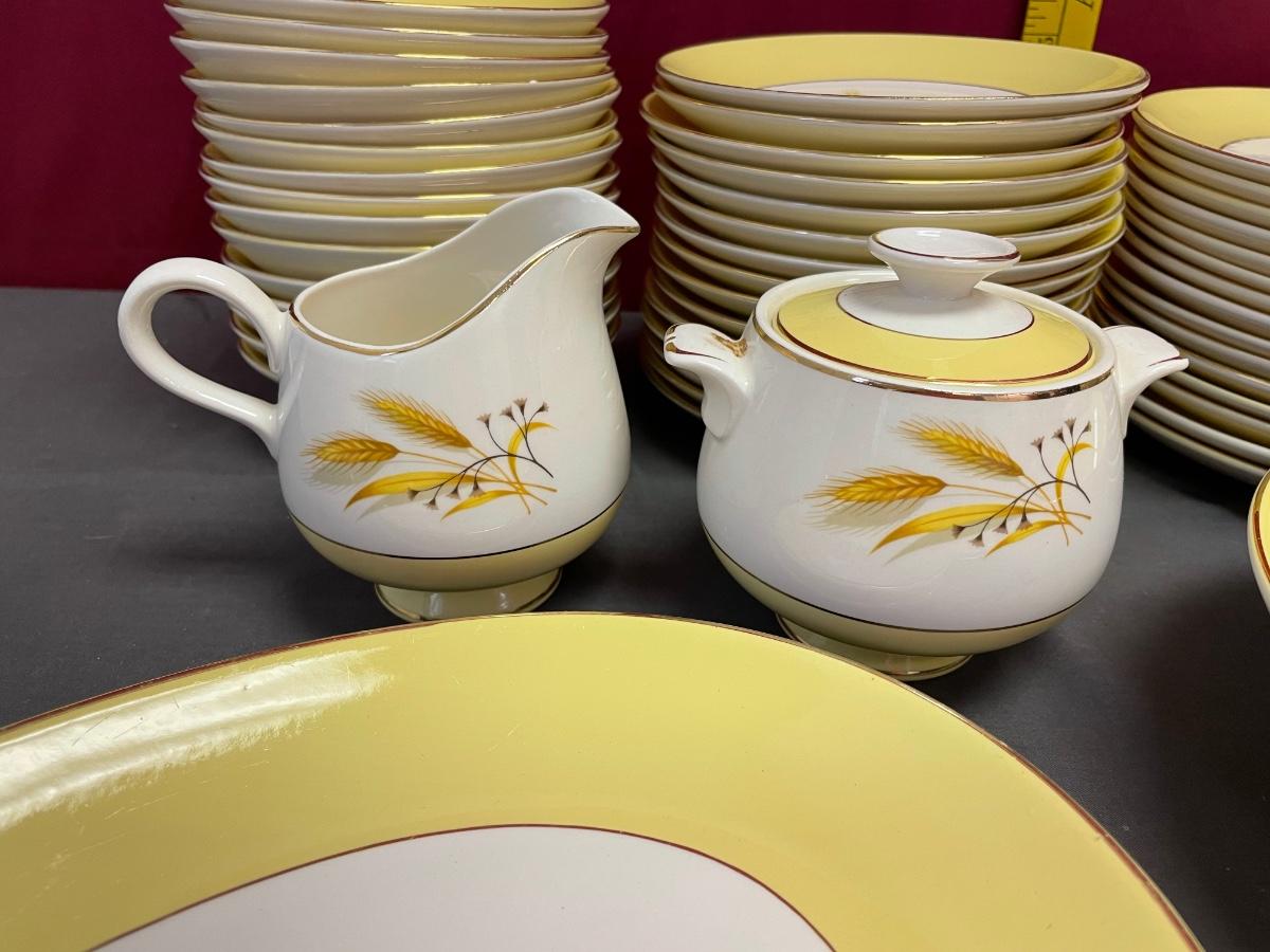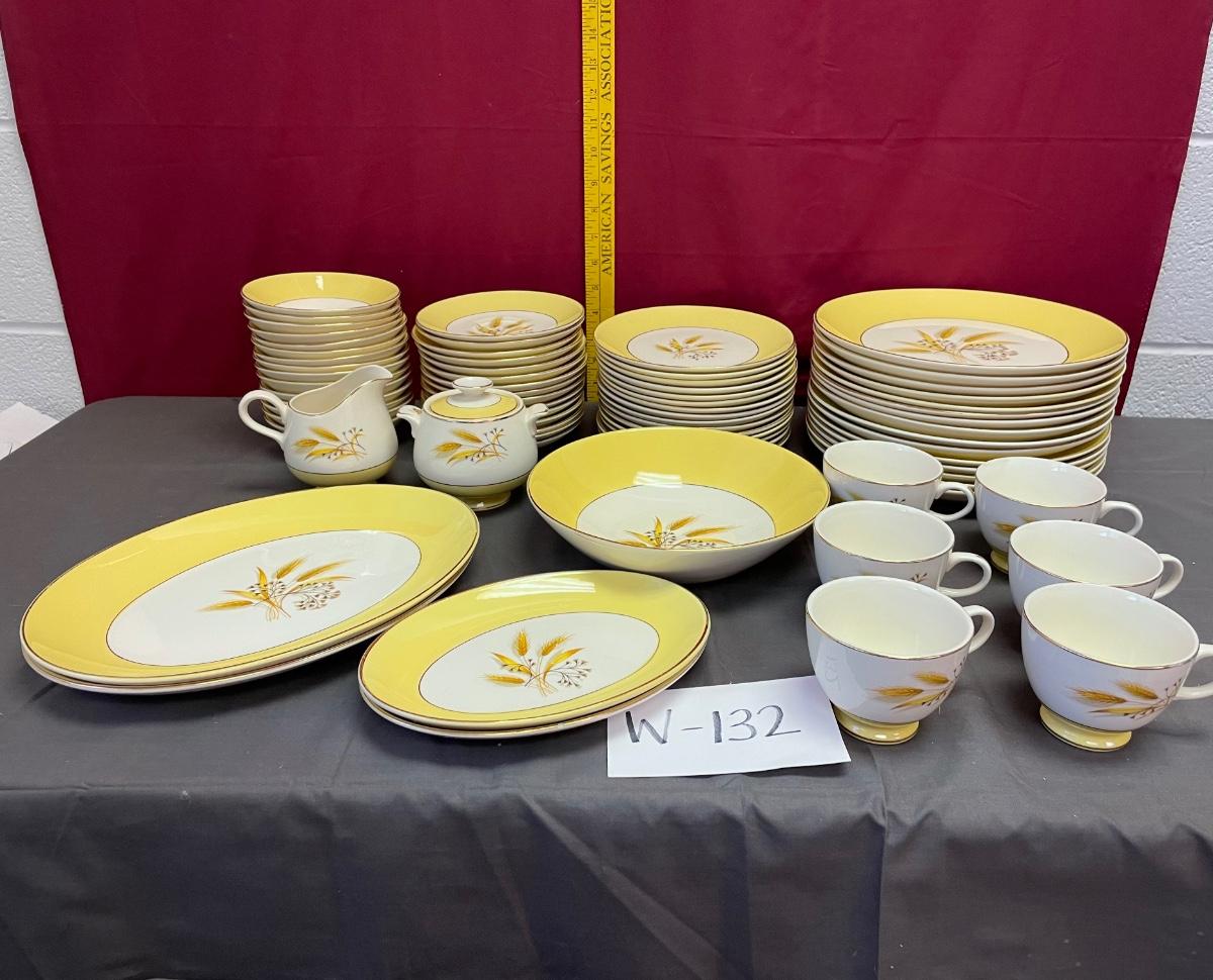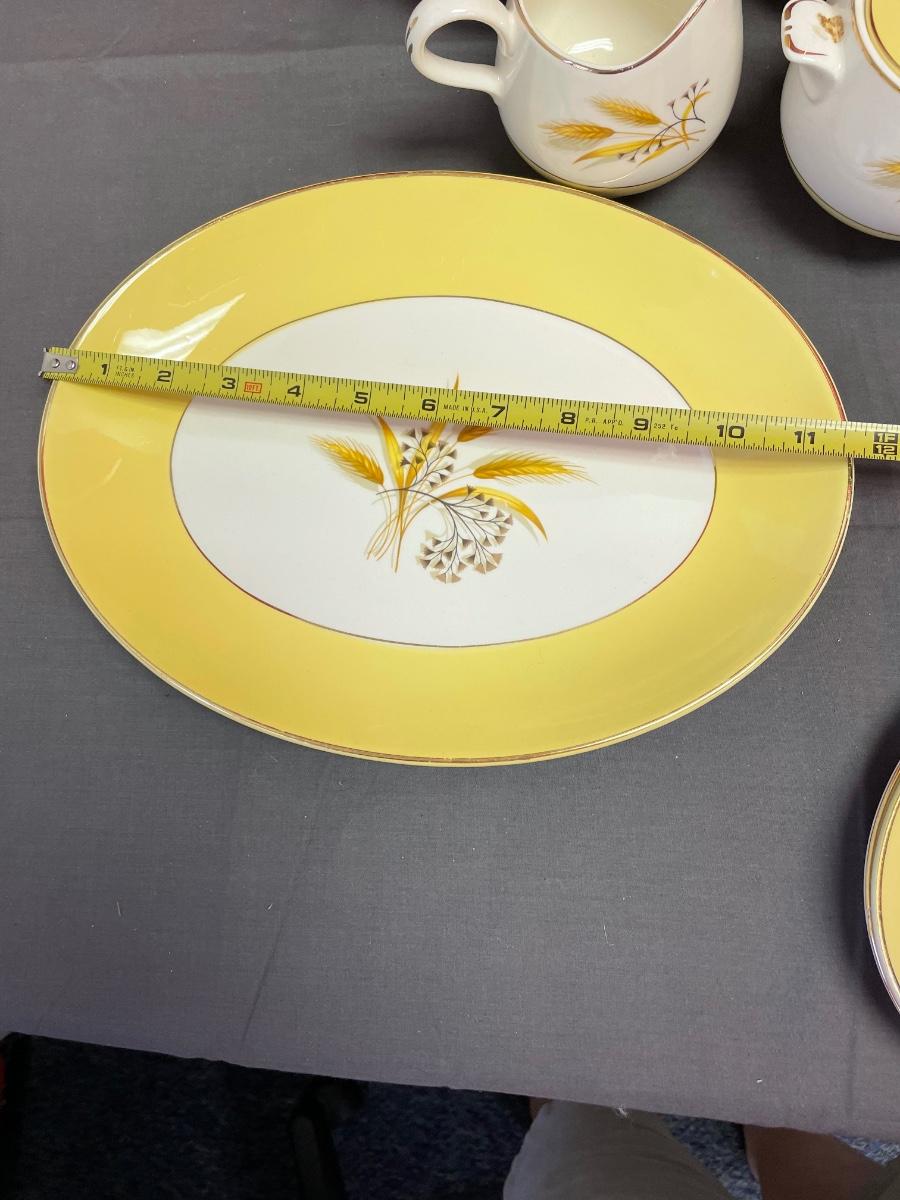 15 dinner plates,15 saucer,7 coffee mugs, salt and pepper,15 dessert, 15 bread & butter,4 serving bowls, cream and sugar,2 large oval, 2 small oval, 3 soup