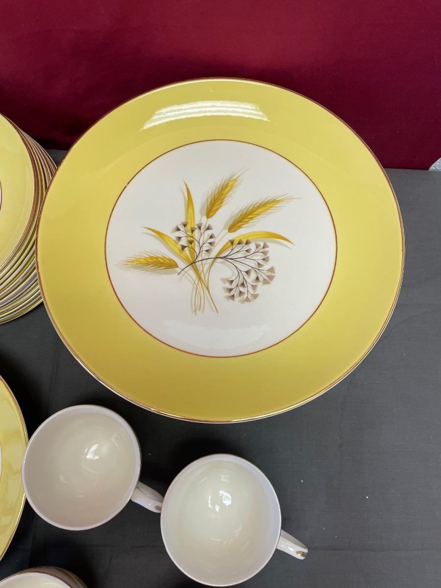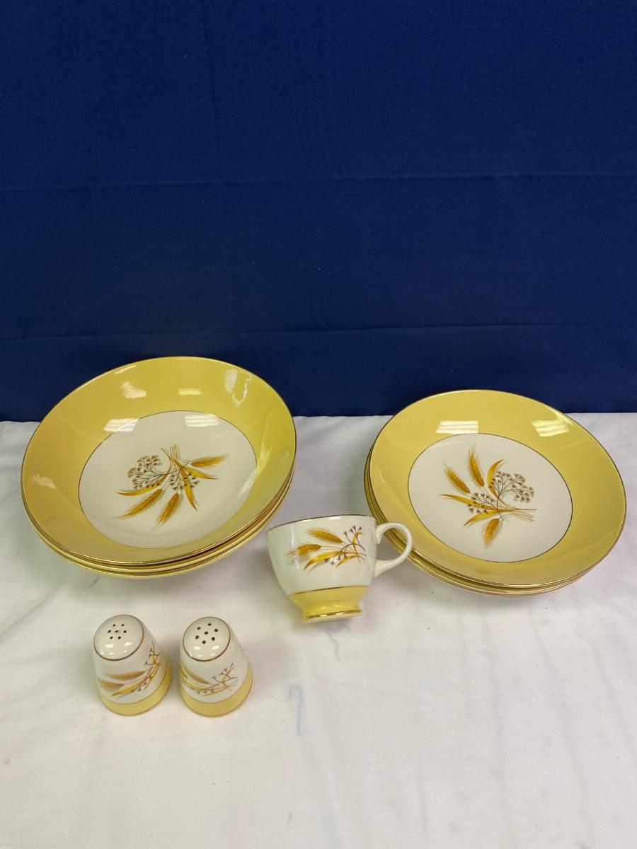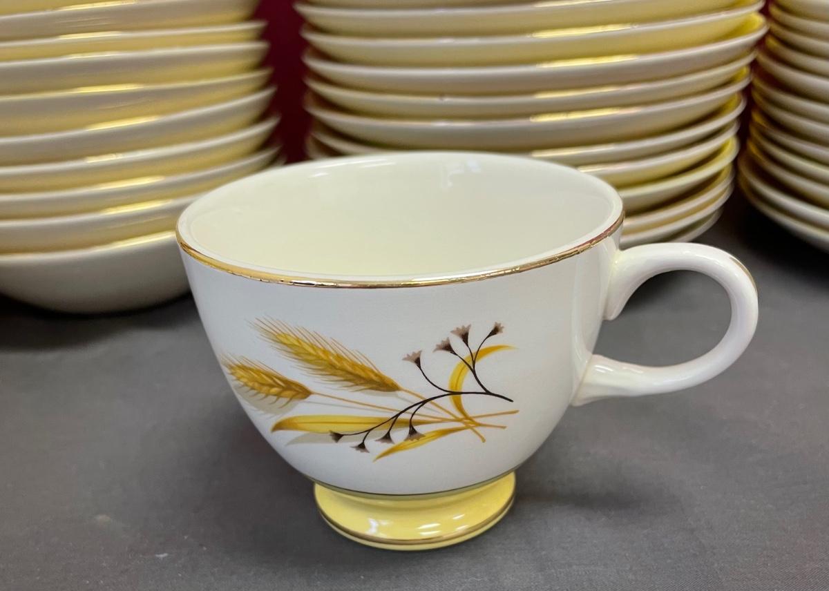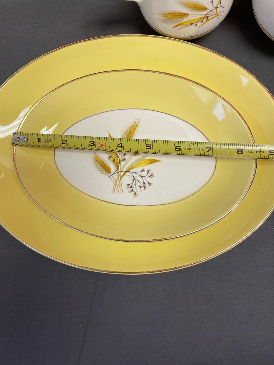15 dinner plates,15 saucer,7 coffee mugs, salt and pepper,15 dessert, 15 bread & butter,4 serving bowls, cream and sugar,2 large oval, 2 small oval, 3 soup