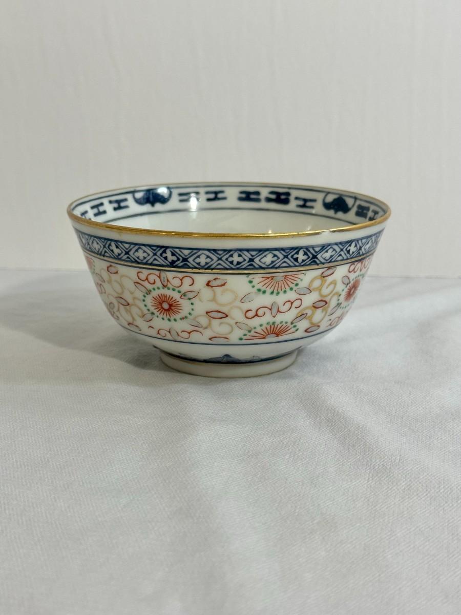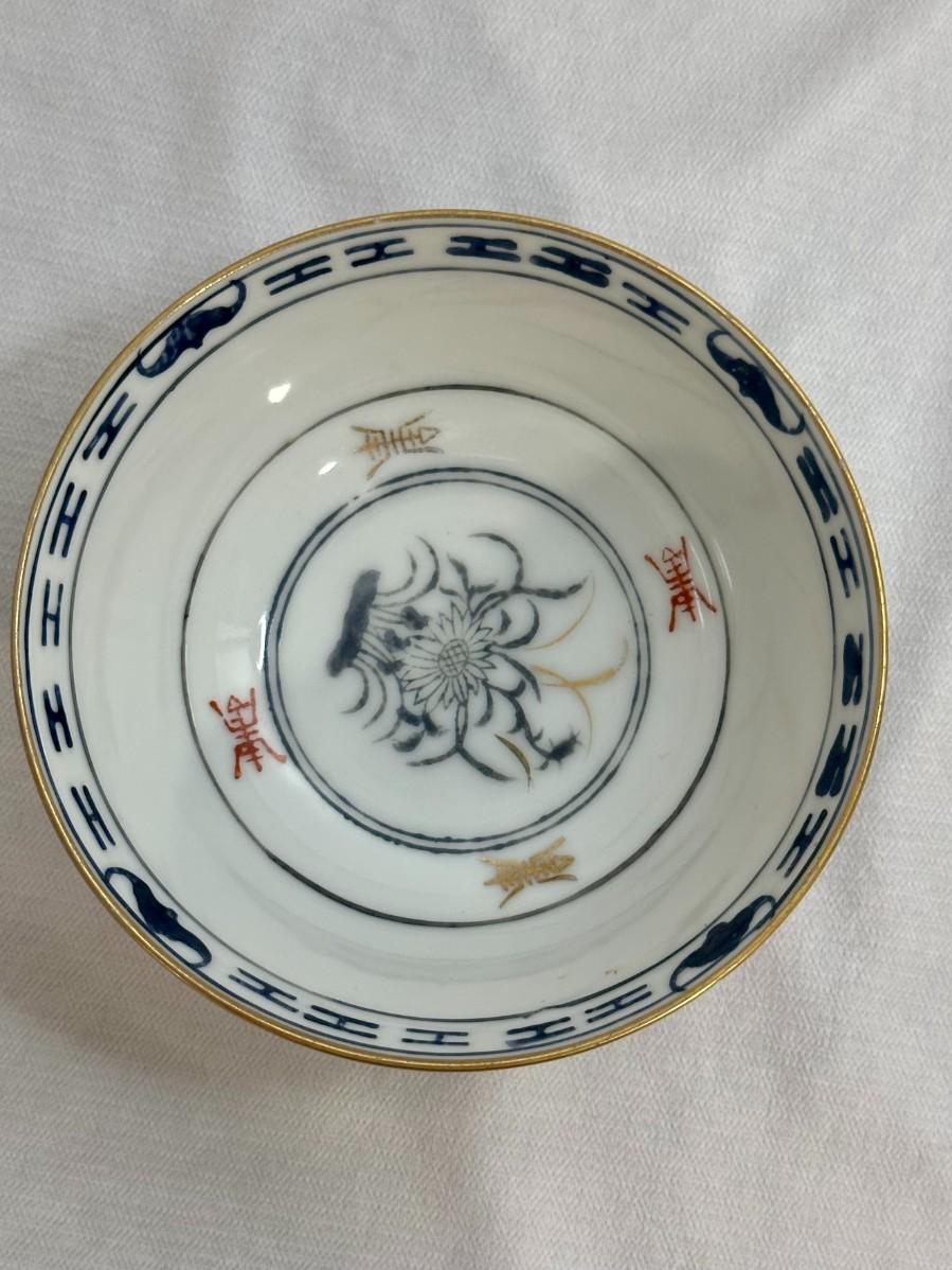7 Chinese symbols rice bowls from 1950's. Some variations in designs.