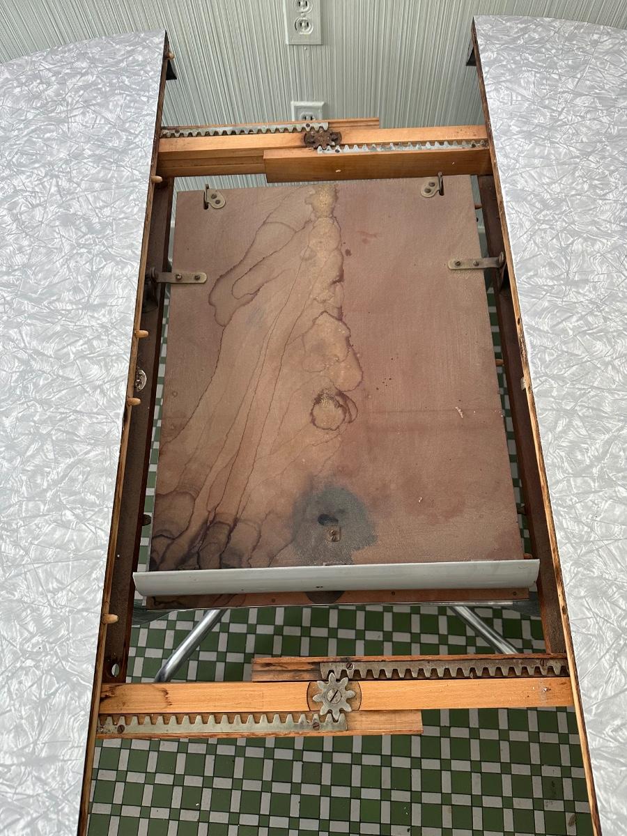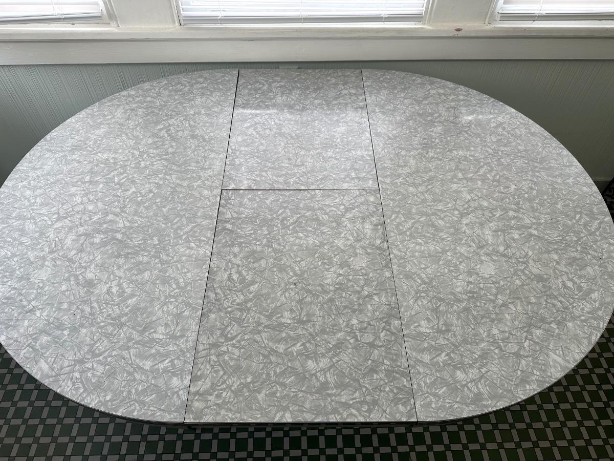 Table expands smoothly! The table pulls apart to easily lift the middle leaf for the table. There are a couple small chips in the surface of the table - see pictures.