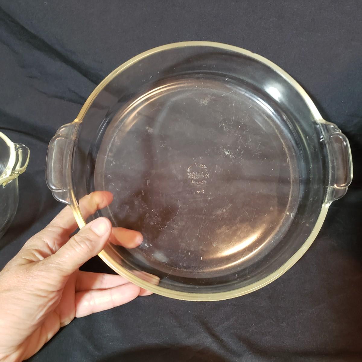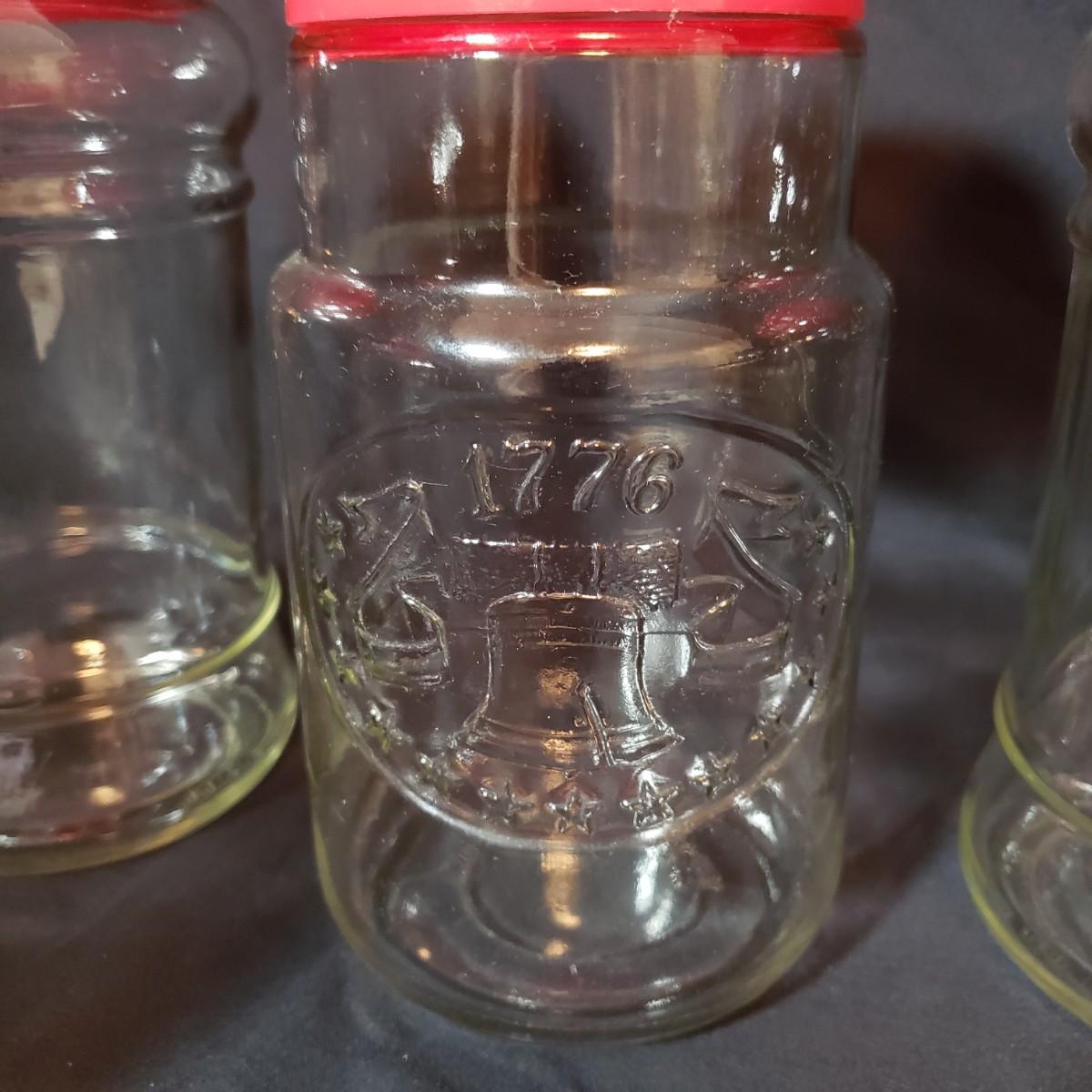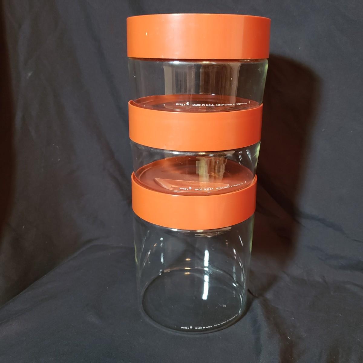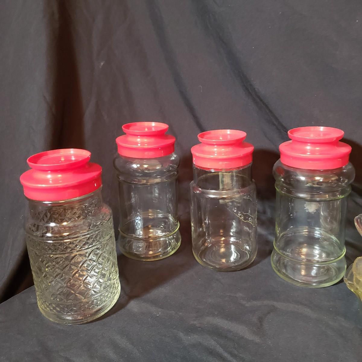 Such nostalgia in this lot! Featured in this lot are a set of three Pyrex canisters with a brown/orange plastic lid. The set can stack! The largest measures 6" x 8"H. The two Cooking Magic books are a conglomerate of little books bound in a binder. There are some classic recipes in there! The four clear jars with red lids all have an anchor stamp on the bottom. The large car glass is a Hazel Atlas collector cup. The four Pyrex pie dishes feature an older style handle.