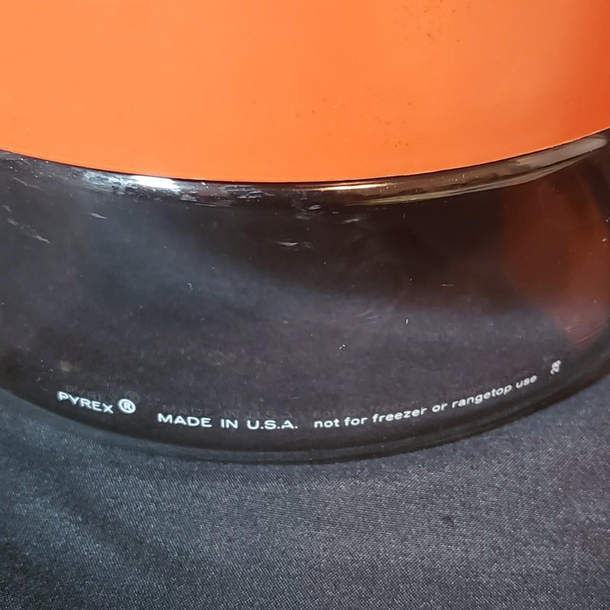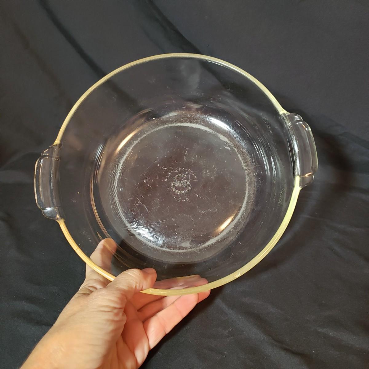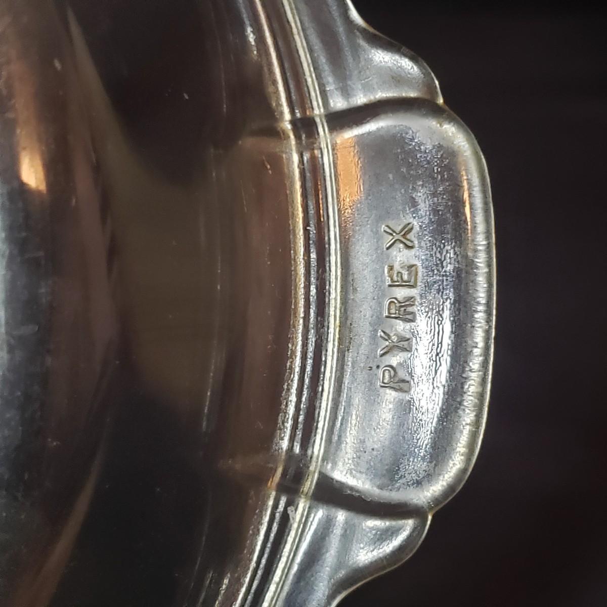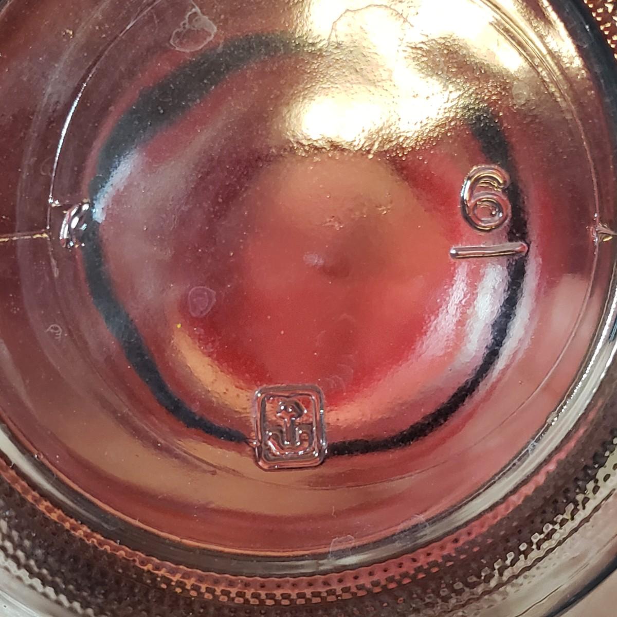 Such nostalgia in this lot! Featured in this lot are a set of three Pyrex canisters with a brown/orange plastic lid. The set can stack! The largest measures 6" x 8"H. The two Cooking Magic books are a conglomerate of little books bound in a binder. There are some classic recipes in there! The four clear jars with red lids all have an anchor stamp on the bottom. The large car glass is a Hazel Atlas collector cup. The four Pyrex pie dishes feature an older style handle.