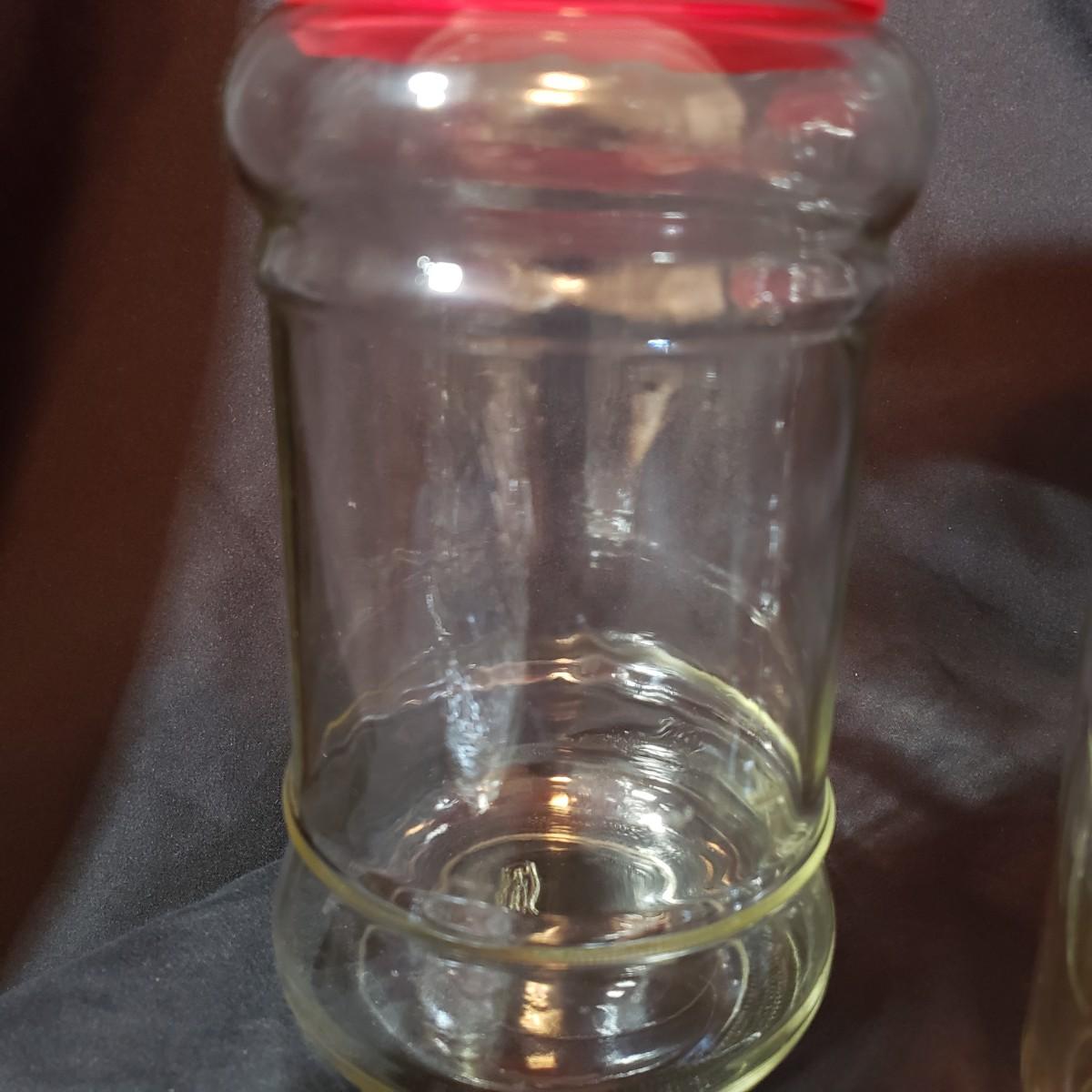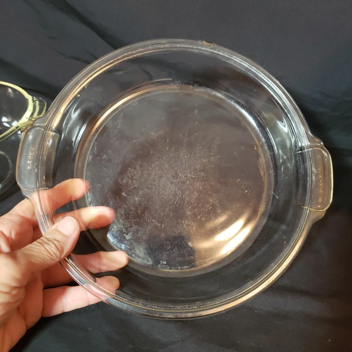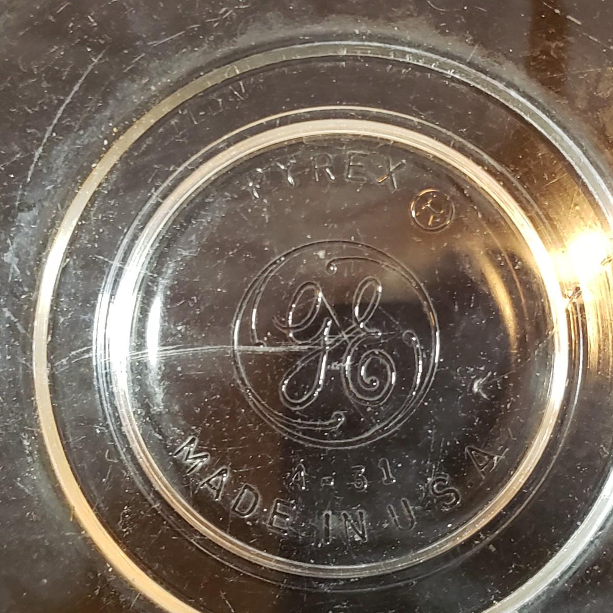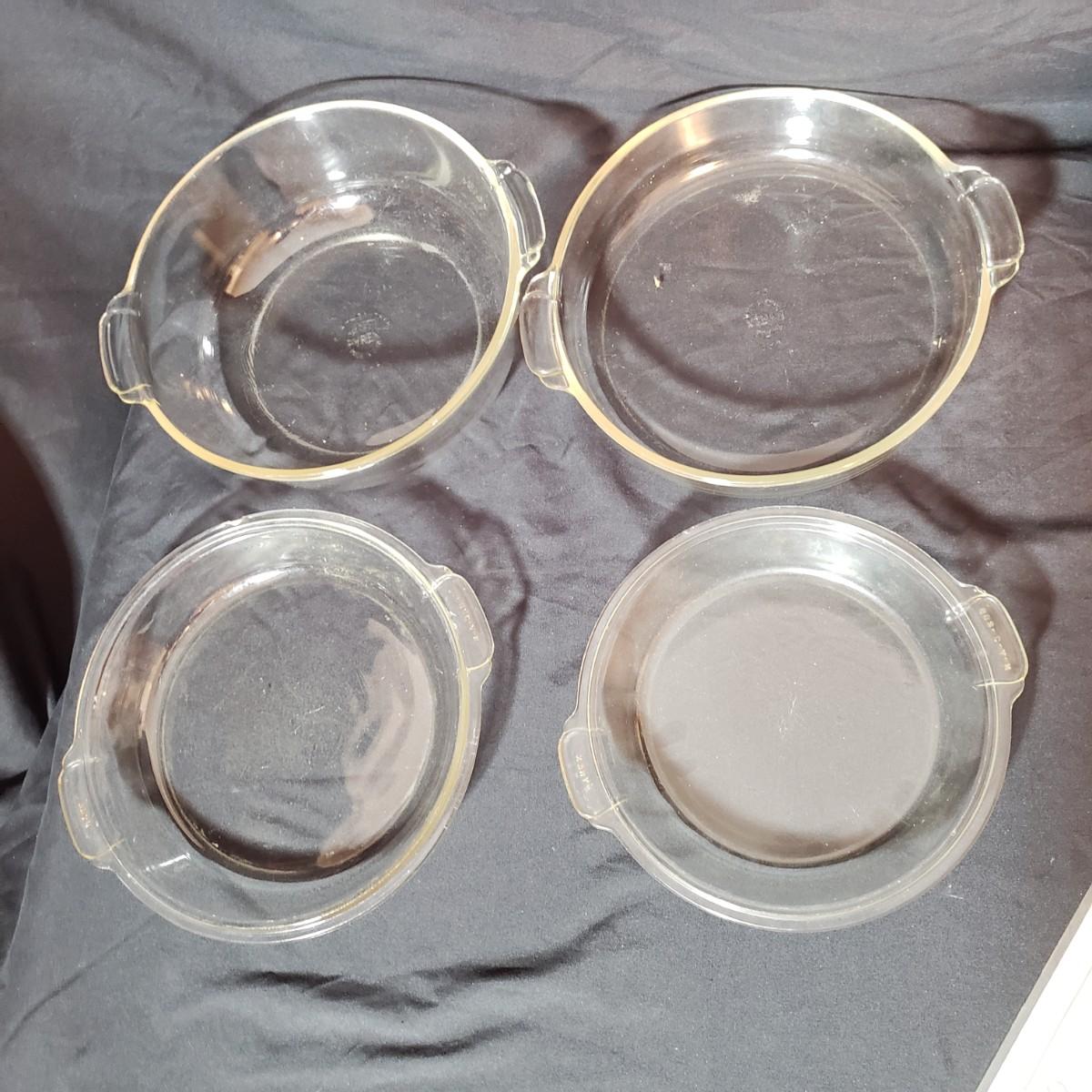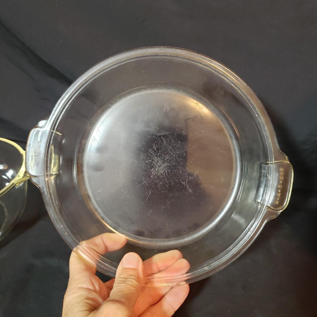 Such nostalgia in this lot! Featured in this lot are a set of three Pyrex canisters with a brown/orange plastic lid. The set can stack! The largest measures 6" x 8"H. The two Cooking Magic books are a conglomerate of little books bound in a binder. There are some classic recipes in there! The four clear jars with red lids all have an anchor stamp on the bottom. The large car glass is a Hazel Atlas collector cup. The four Pyrex pie dishes feature an older style handle.