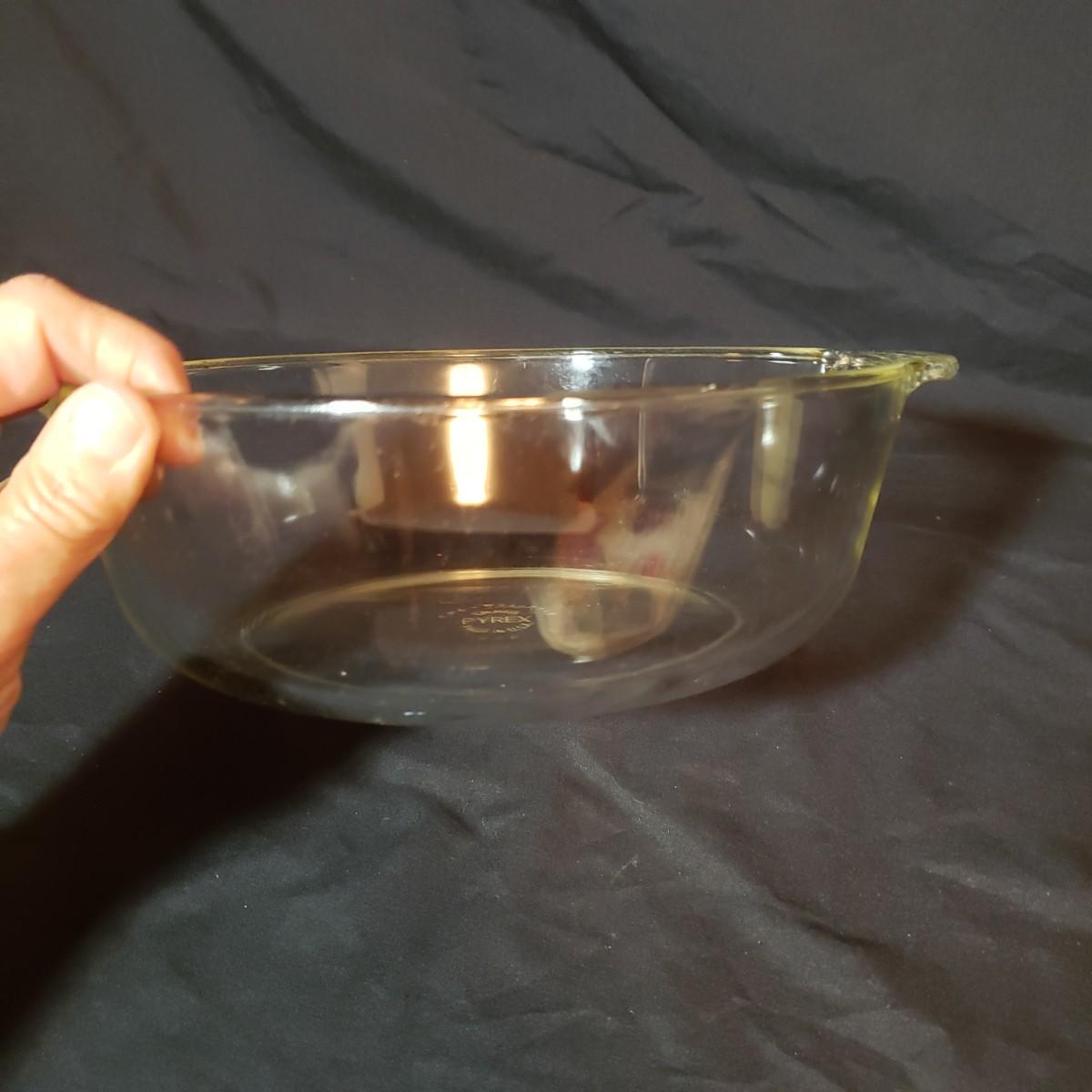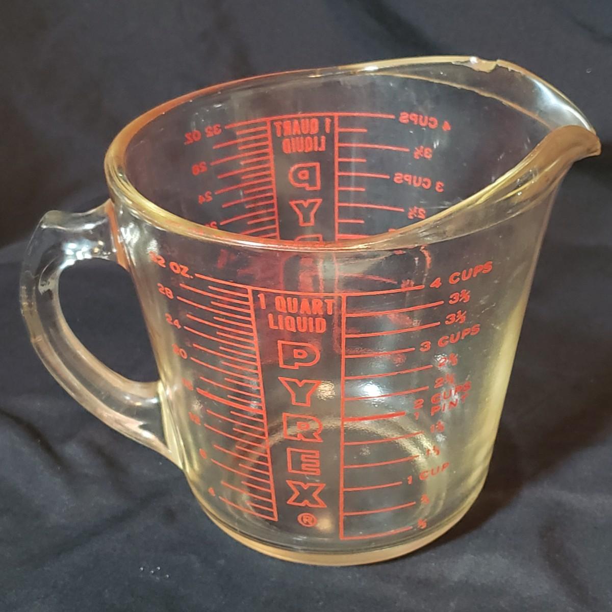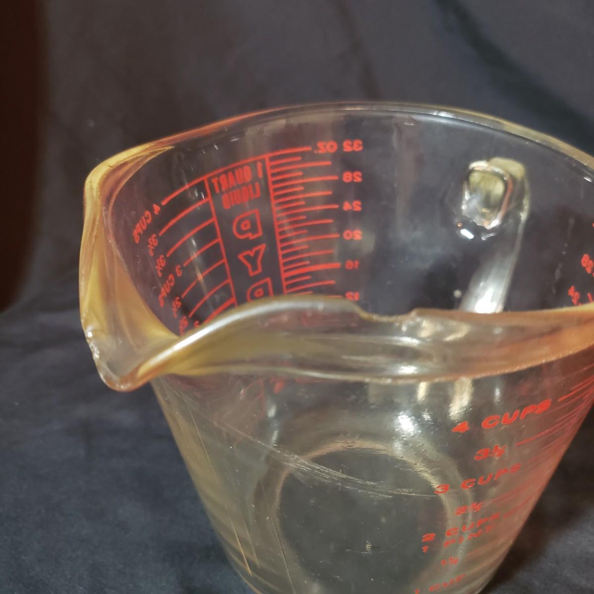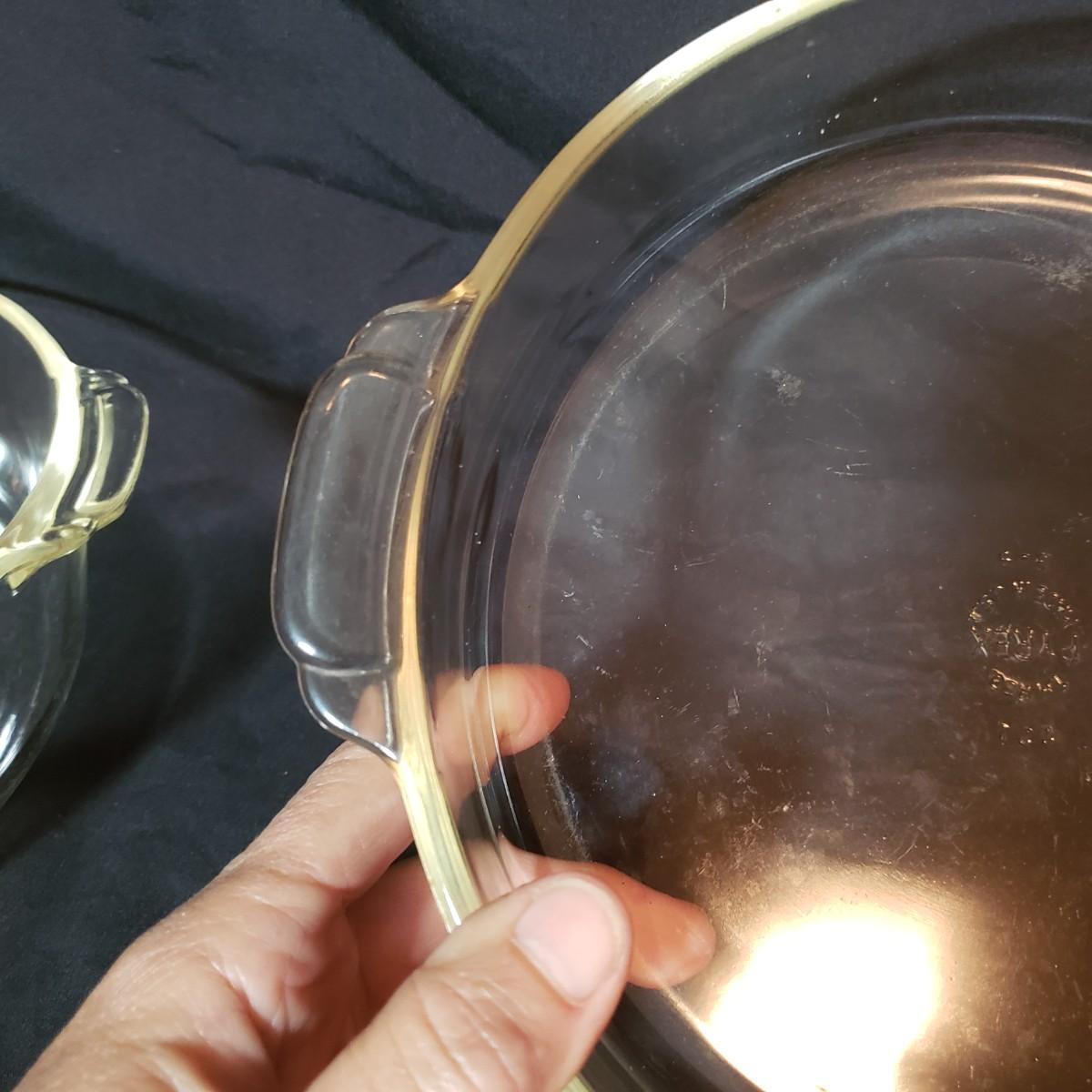 Such nostalgia in this lot! Featured in this lot are a set of three Pyrex canisters with a brown/orange plastic lid. The set can stack! The largest measures 6" x 8"H. The two Cooking Magic books are a conglomerate of little books bound in a binder. There are some classic recipes in there! The four clear jars with red lids all have an anchor stamp on the bottom. The large car glass is a Hazel Atlas collector cup. The four Pyrex pie dishes feature an older style handle.
