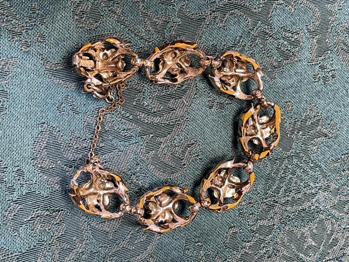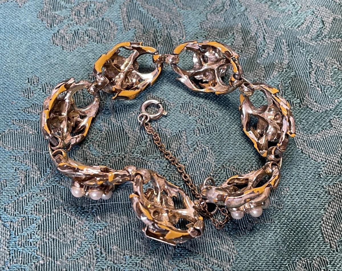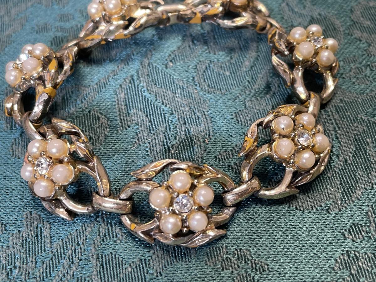 This bracelet is about 7" long and marked Coro. Please see the pictures for the condition of the gold tone metal, all of the stones and faux pearls appear intact.