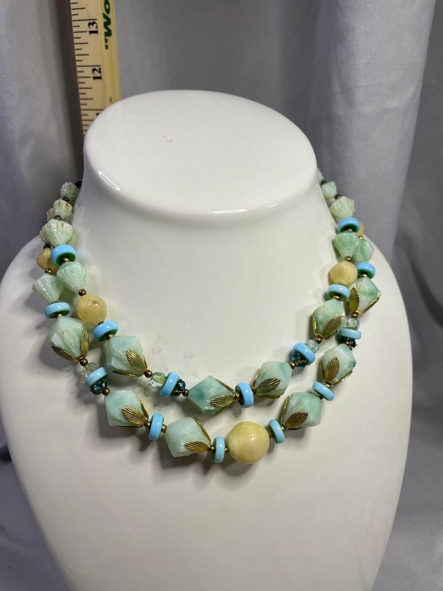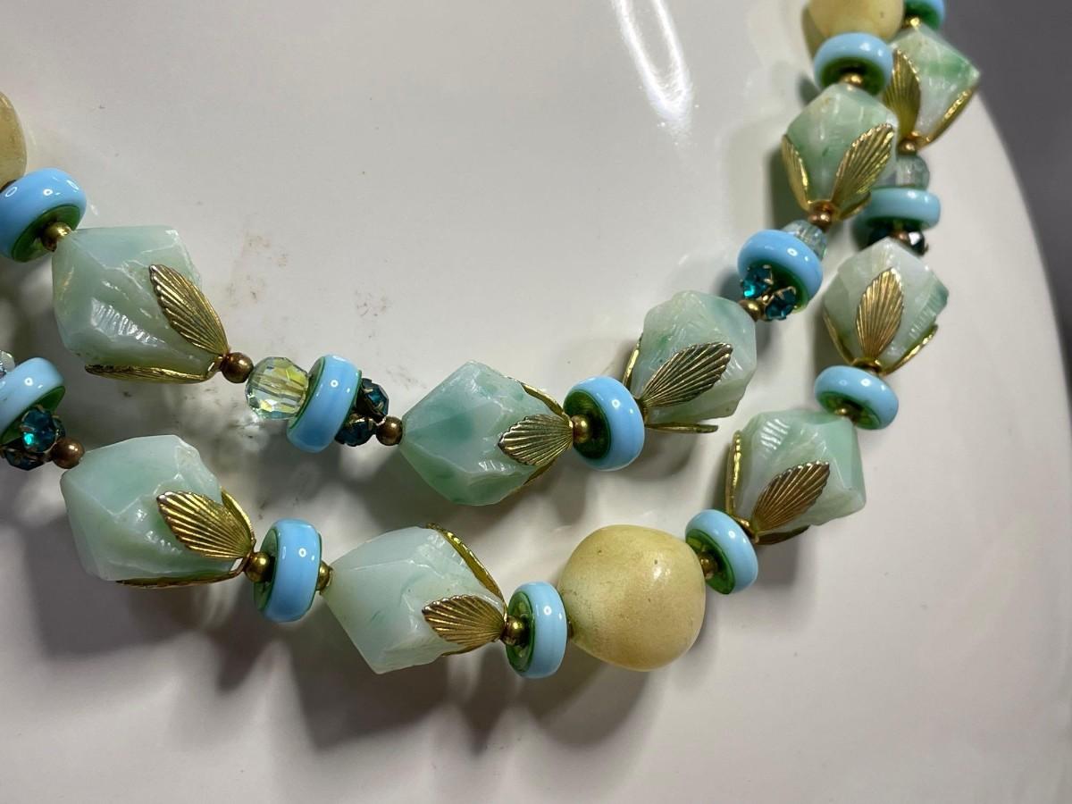 This double strand choker is by Deauville and made circa 1950s. It is made of plastic beads of varying sizes and has a teal or aqua focus color. The shorter strand is about 18.5 inches and the longer strand is about 21 inches.<br />