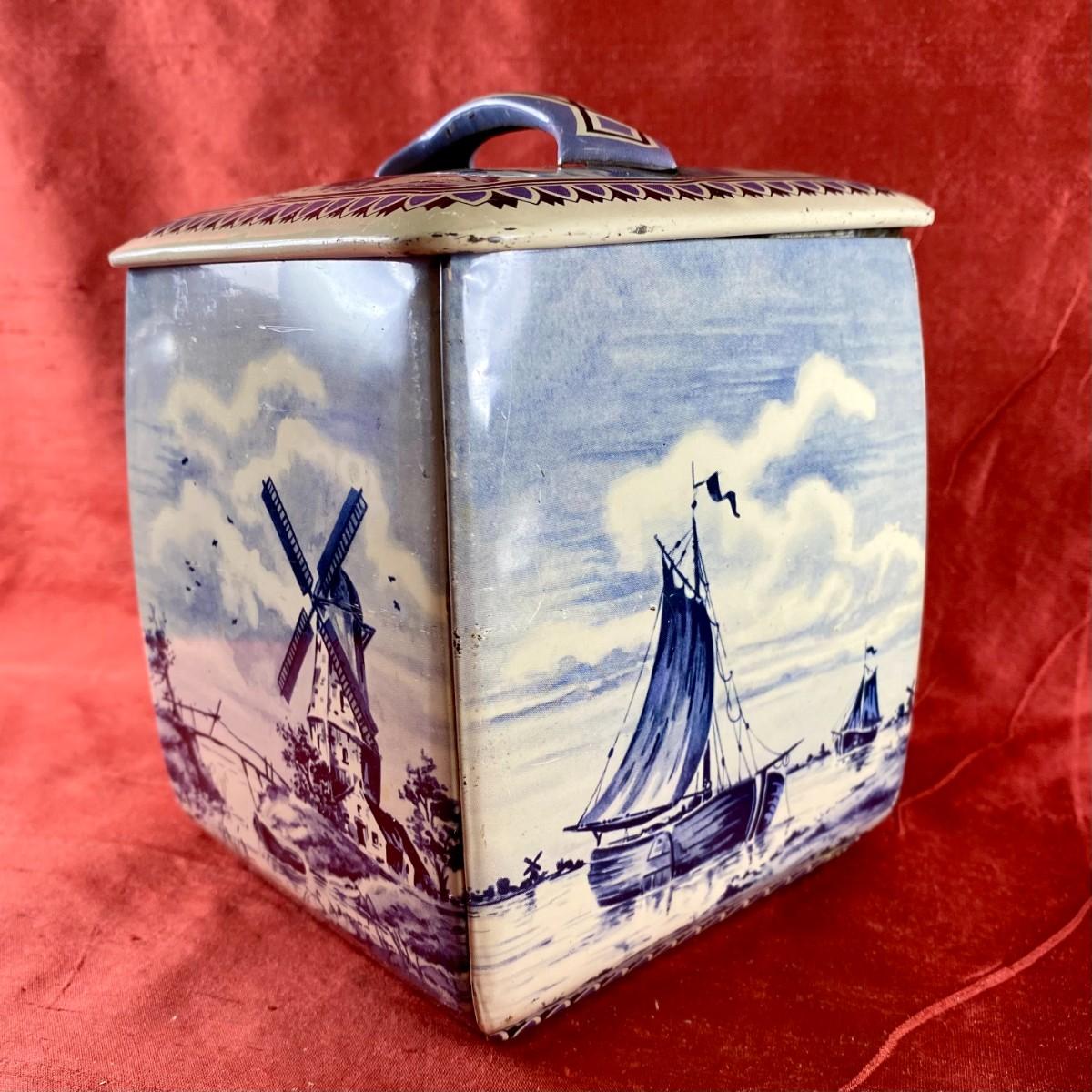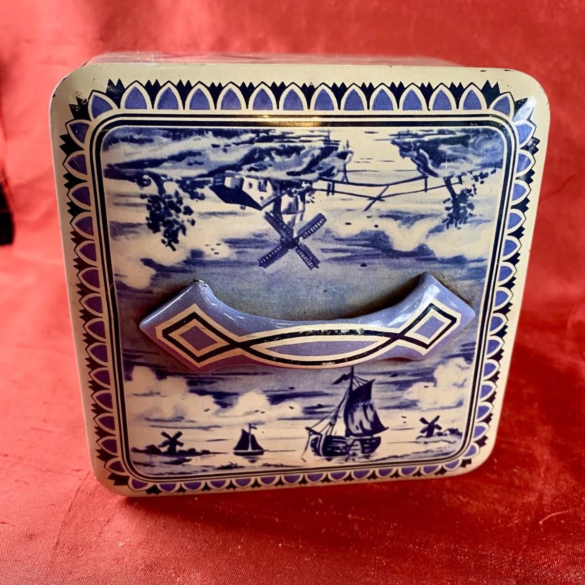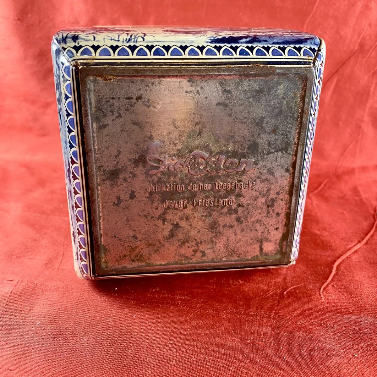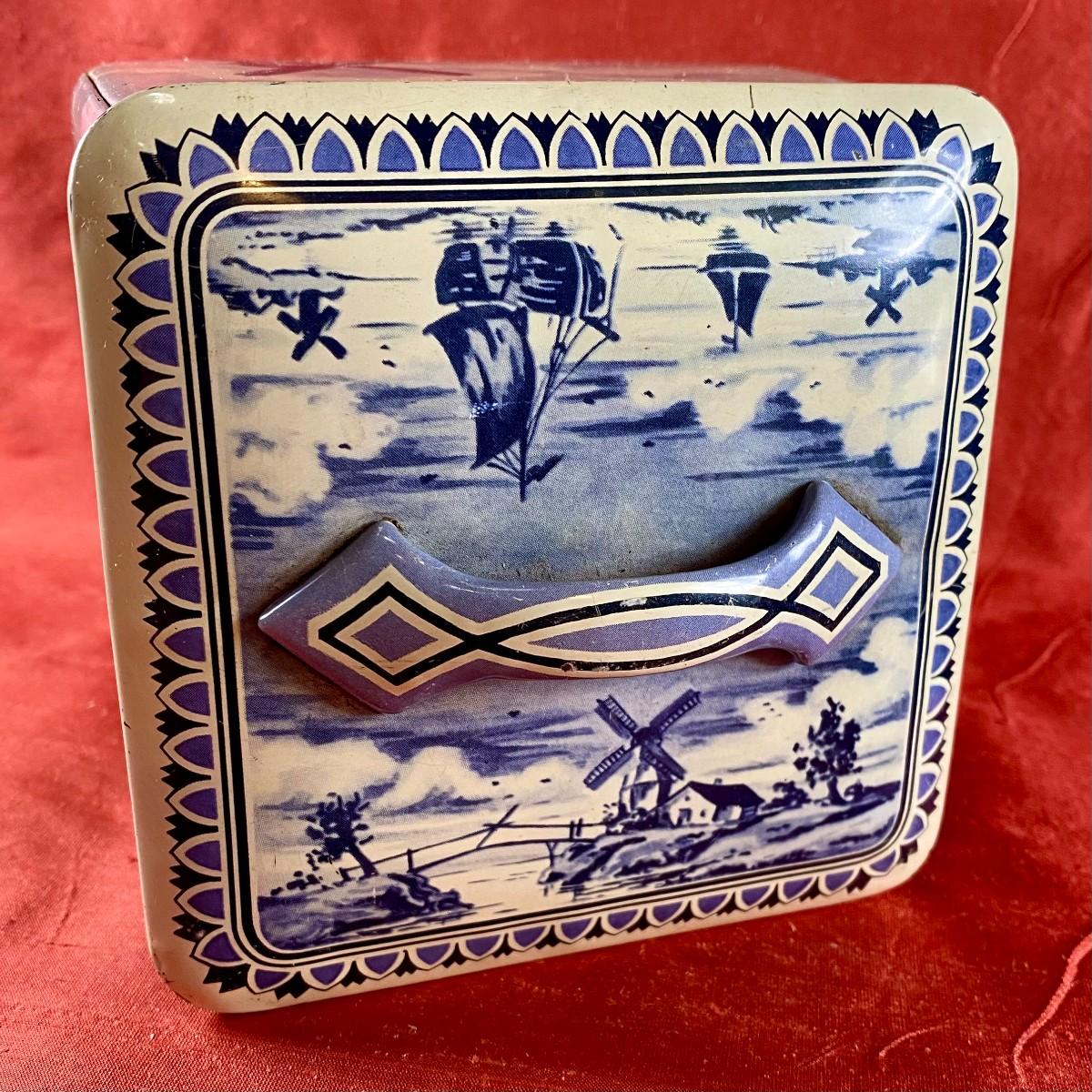 This auction lot is for a 1950's Dirk Eden Delft Style Tin. This great vintage item is a good find. From West Germany - Aburkation Feiner Teegebacke Jever Friesland Biscuit Tin. It measures about 5-inches square. Has a nice fitted lid with handle.