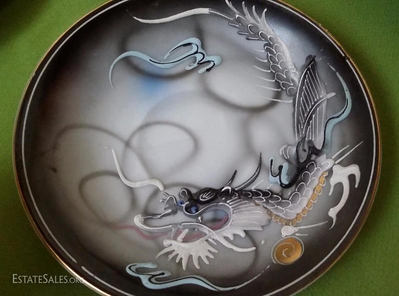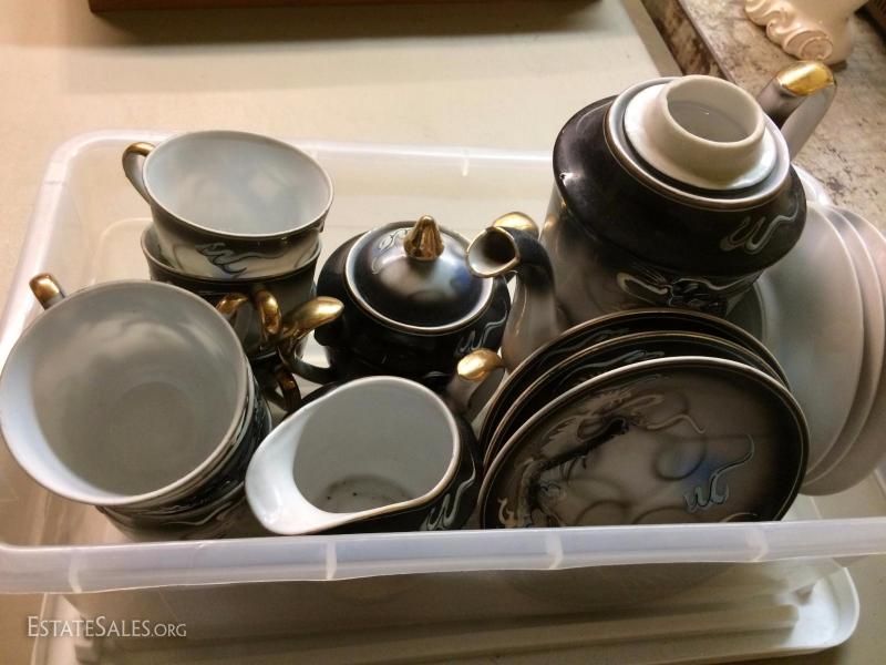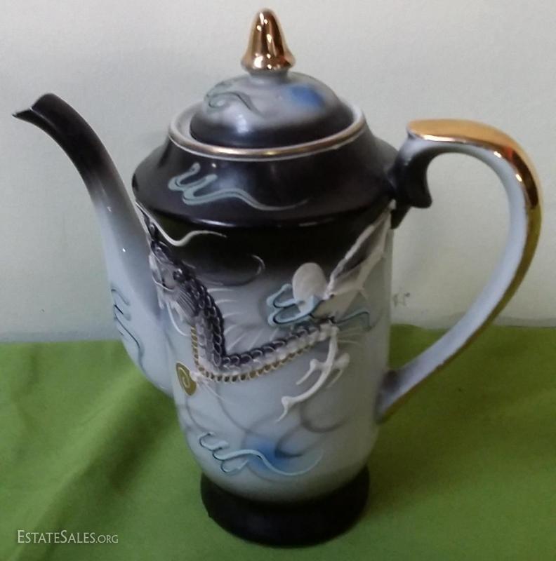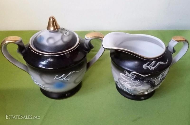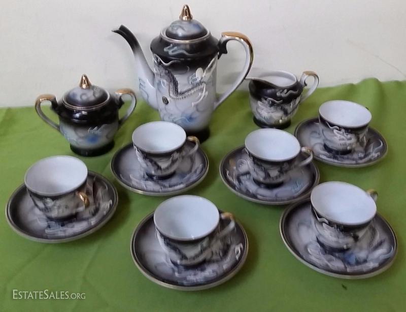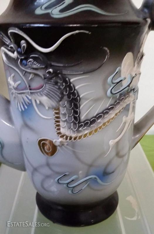 1950's Dragonware tea set with lithophane in the cups. Each Item Exquisitely and Delicately Hand-Painted in Raised Polychrome Enamel, depicting intricately detailed Stylized Dragon figures on a smoky black background. A Work of Art! Includes (1) Teapot (7 1/2 inches tall), (6) Teacups, (cups 2 1/4 inches tall), (6) Saucers (5 inches across), (1) Creamer (3 1/8 inches tall), (1) Sugar bowl with lid (about 4 1/2 inches tall), Condition-None of the pieces are cracked and none have any repairs