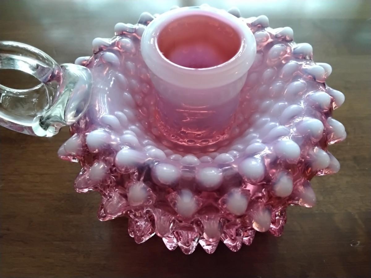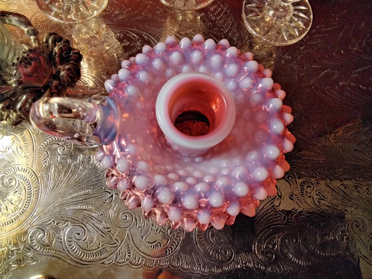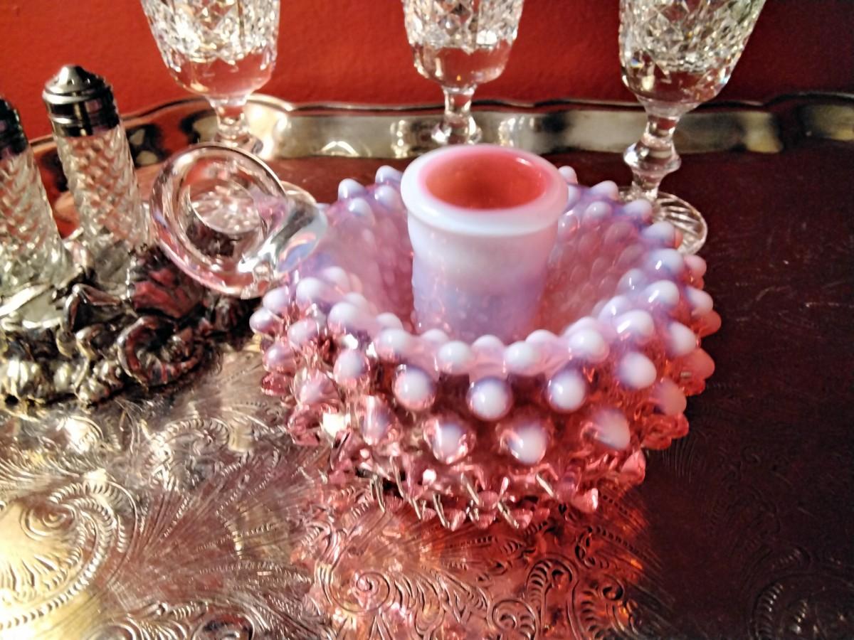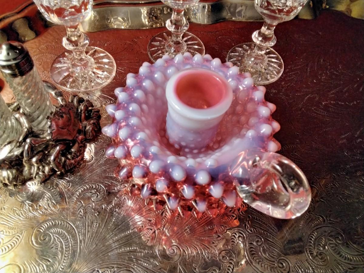 Fenton made Opalescent Hobnail Cranberry Candlestick has an applied clear glass finger grip. No maker's mark found due to Fenton didn't start using "F" till the 1970's. The cranberry color fits many seasons and many occasions.