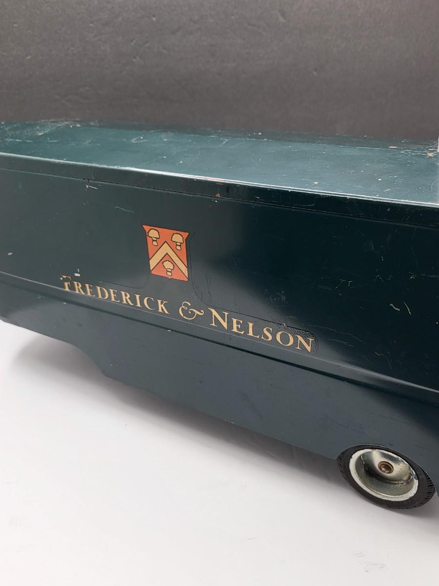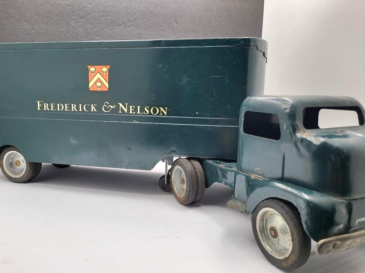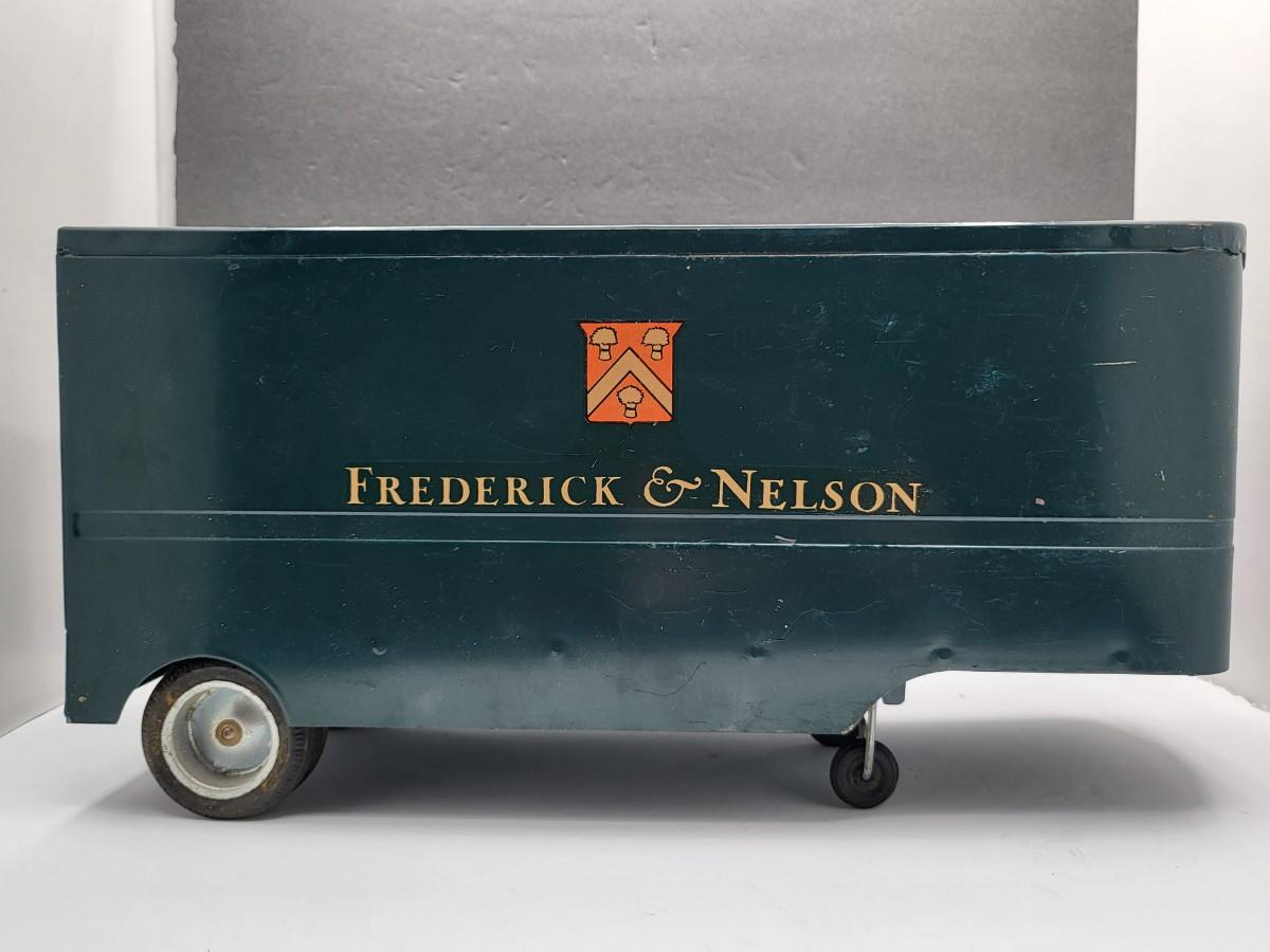 Vintage collectible! Two piece - Cab (9.5" x 6" x 5") and container.(15.5" x 8" x 6"). Found no other markings other than Frederick & Nelson on side. All the tires are intact, some denting. See all photos for condition details. Sold as found.