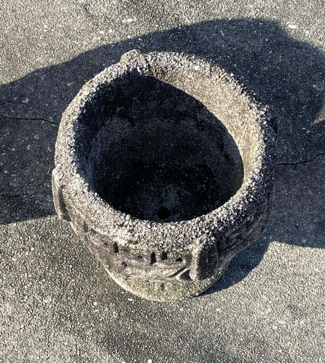 This planter has been with the consignor since the mid 1950s and has always been outside. This one is a little darker than Lot 176 but has less wear. It is 10.25 inches tall and about 9.75 inches wide with a 7 inches diameter interior.