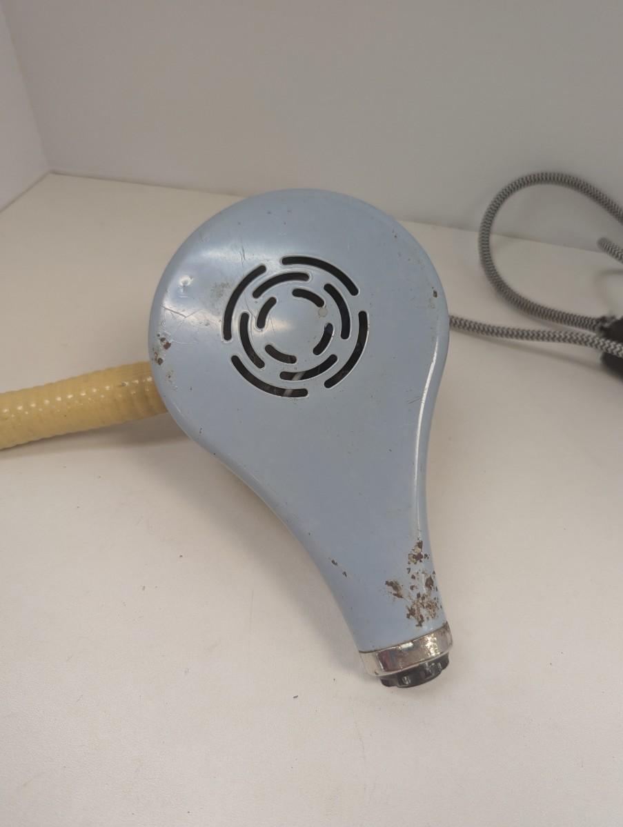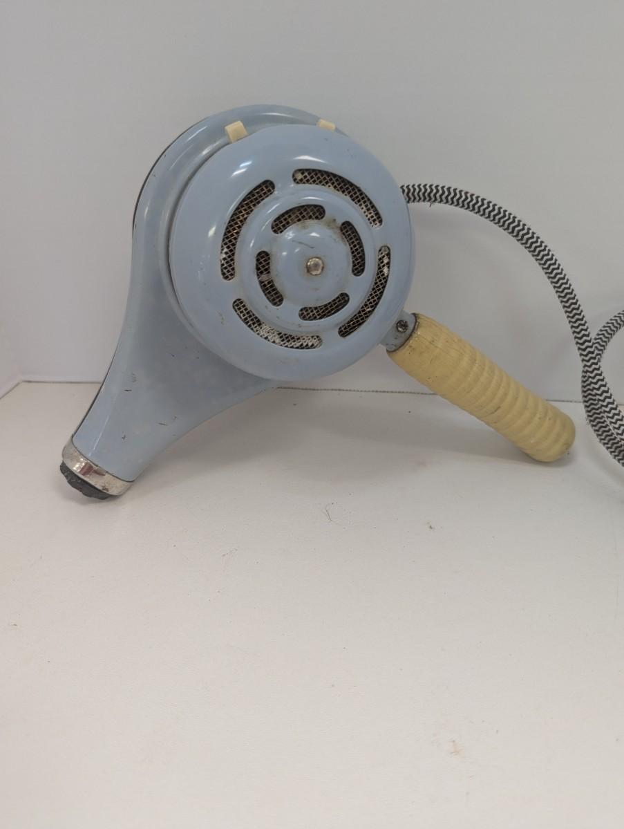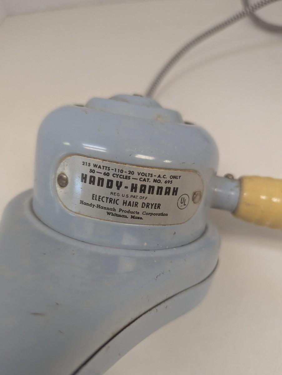 The 1950s Handy Hanna Electric Hair Dryer #695 in light blue is a vintage collectible blow dryer made in the United States during the 1950s. This retro mid-century has not been tested. A valuable addition to any collection of vintage hair styling tools. With its classic design and nostalgic appeal, this electric hair dryer is sure to be a conversation starter for collectors interested in the fashion and style of the 1950s era.