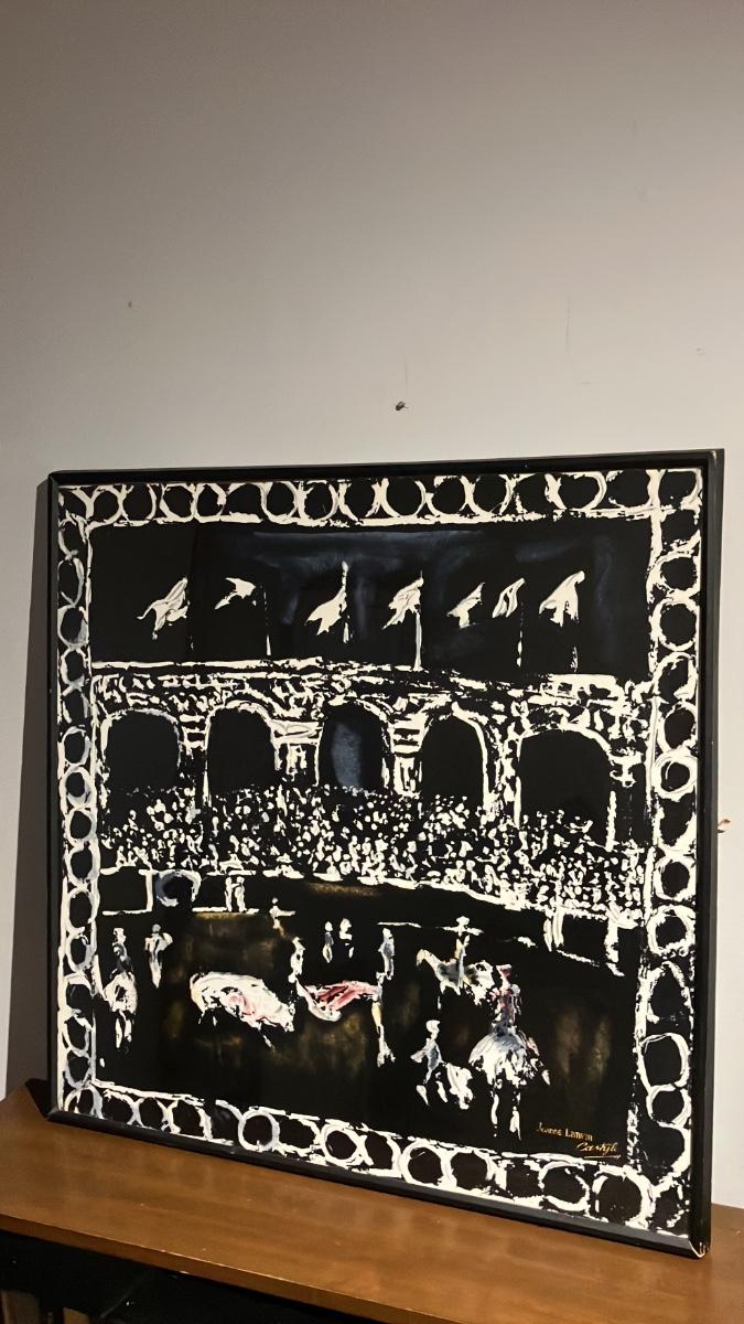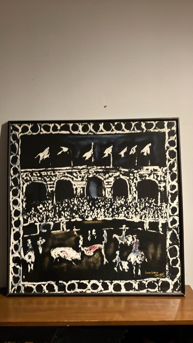 1950s Jeanne Lanvin Castillo Silk Scarf – Framed Bullfight Corrida Arena Scene, Signed, 30.5" Square