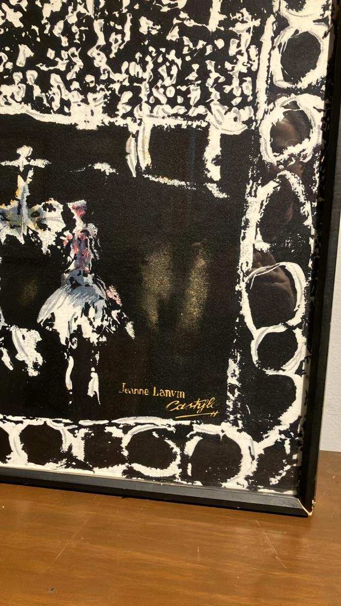 Beautiful and rare vintage framed silk scarf artwork by Jeanne Lanvin Paris, designed by Antonio Castillo (1950s era). Signed in the lower right 'Gene Lanvin' with cursive 'Castillo' underlined—classic authentic signature from this iconic collaboration.