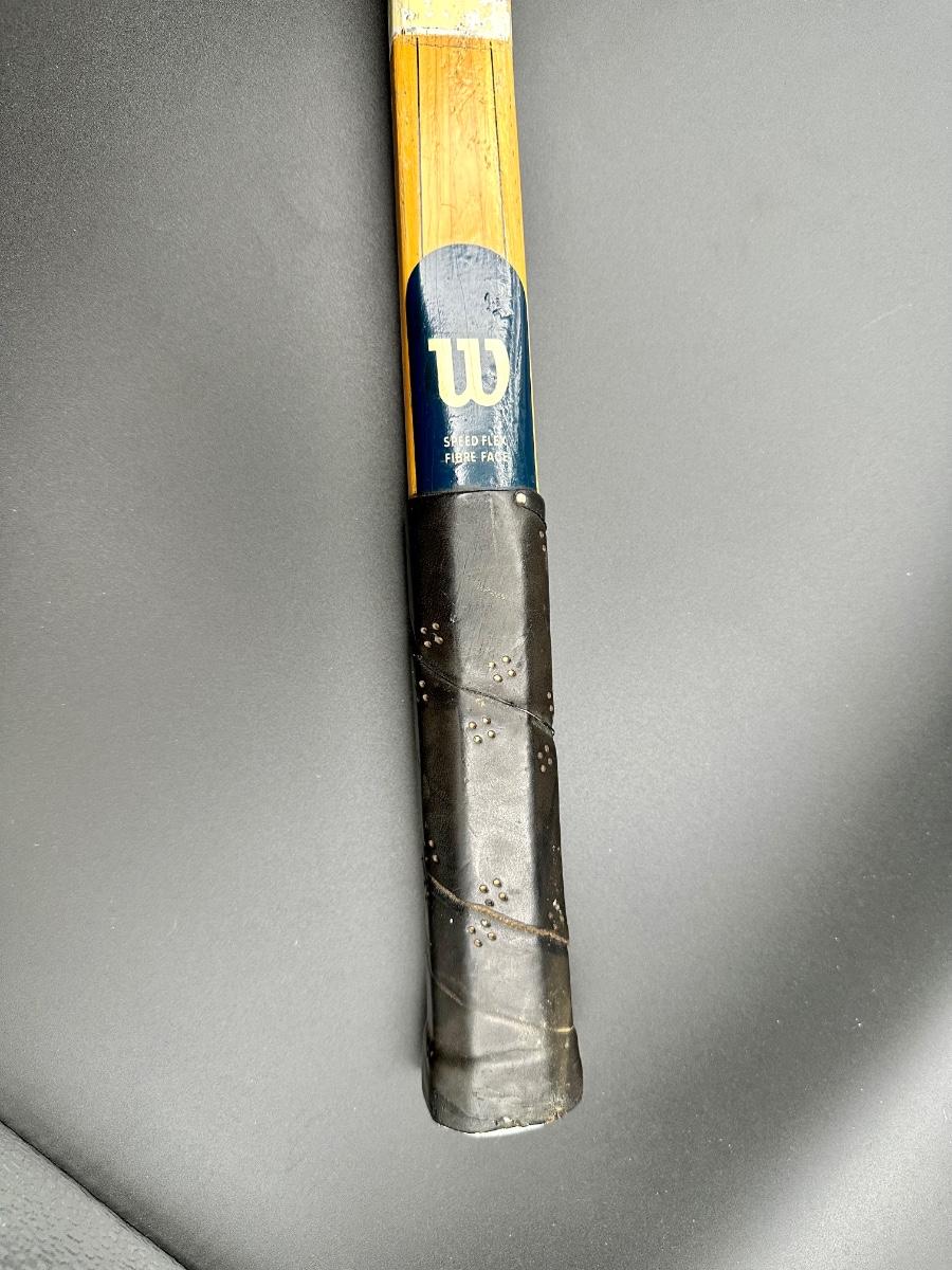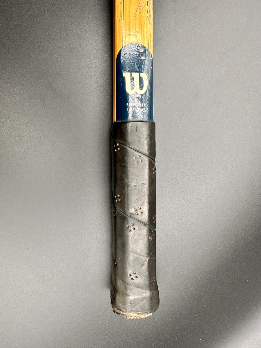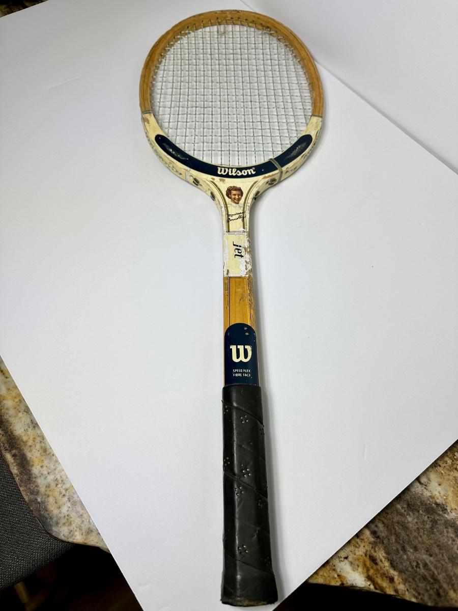 “Autograph series” wooden racket with picture of Maureen Connolly (Little Mo) and labeled “Jet”. Original strings and leather grip.