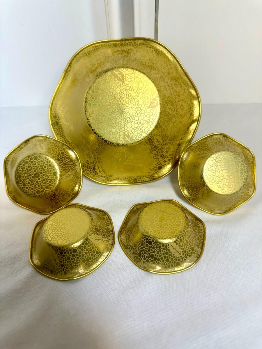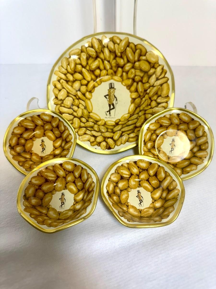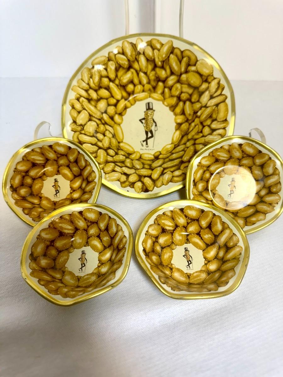 A total of 5 bowls showing the class Mr. Peanut character. Larger bowl is 6" in diameter. Smaller bowls are 3". For age and being made out of tin, they are in very good condition with little fading and scratches.