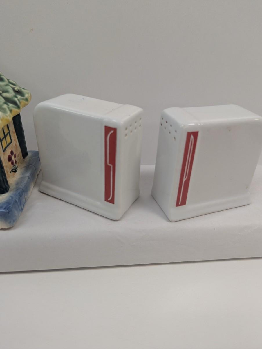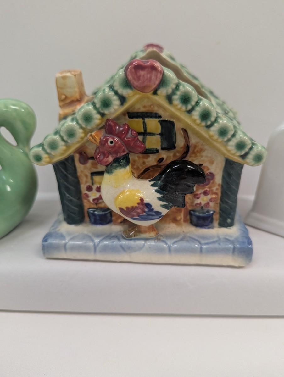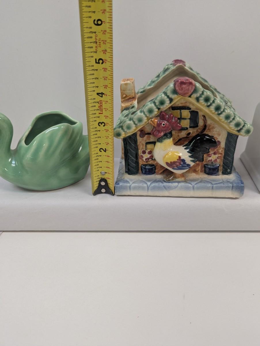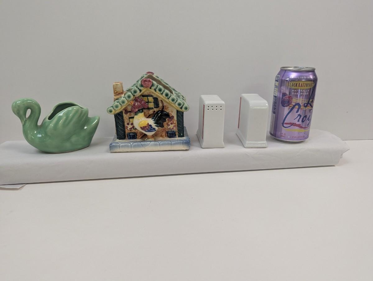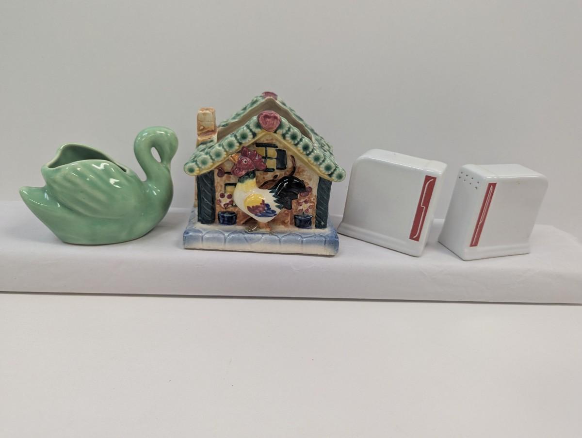 1950's O Keefe & Merrit White & Red Ceramic Stove Top Salt & Pepper Shakers Miniature Green Swan Planter 1940's Roster Planter