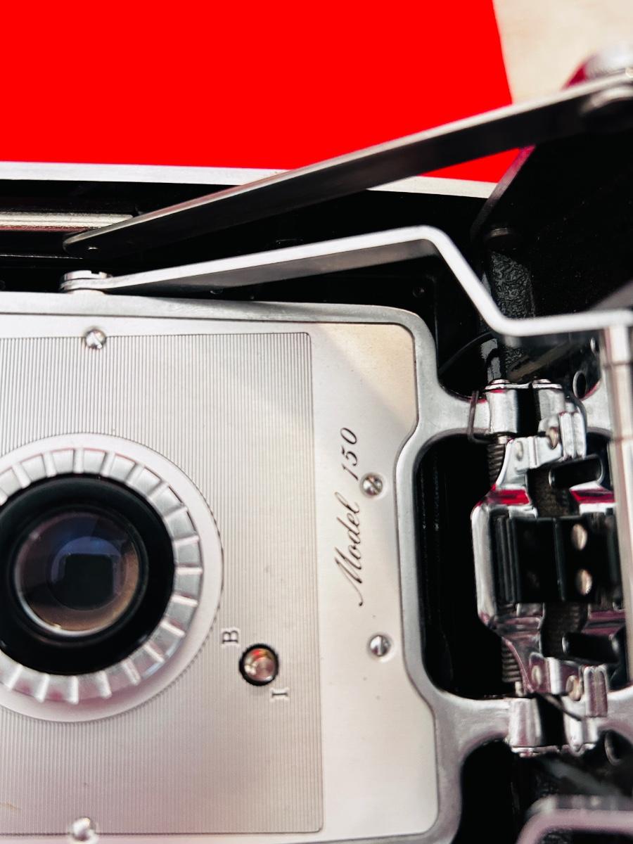 The Polaroid Land Camera Model 150 is a vintage, folding instant camera from the late 1950s, known for its robust build and early roll film technology (Type 40 film), featuring a dual-window rangefinder/viewfinder, exposure meter, and a classic design, though it's primarily a collector's item today as the original film is long discontinued, requiring conversions for modern use.