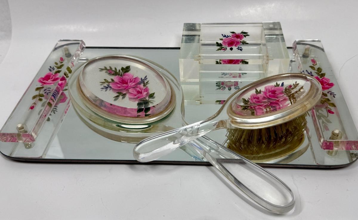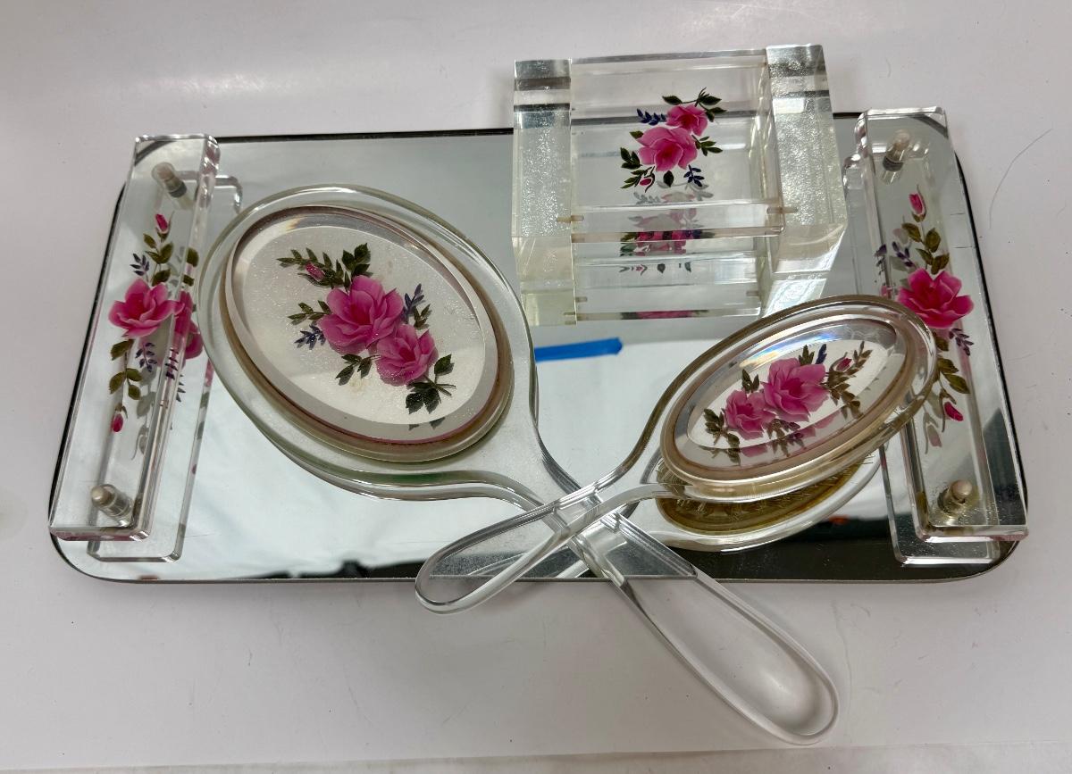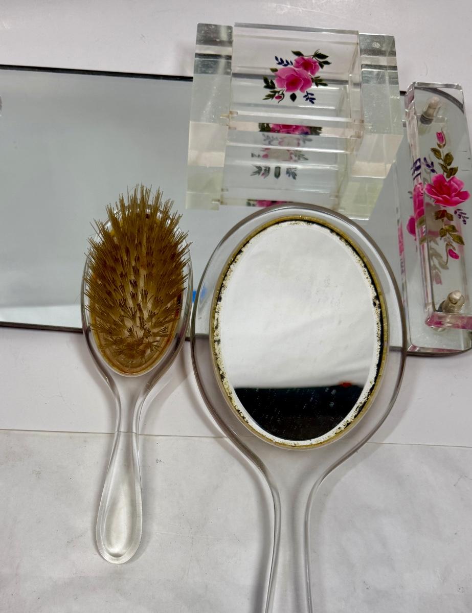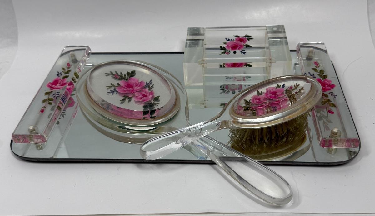 1950’s Pressed Flower Lucite Vanity Set - Lucite Mirrored Tray, Hair Brush, Handheld Mirror and Lidded Vanity Trinket Box