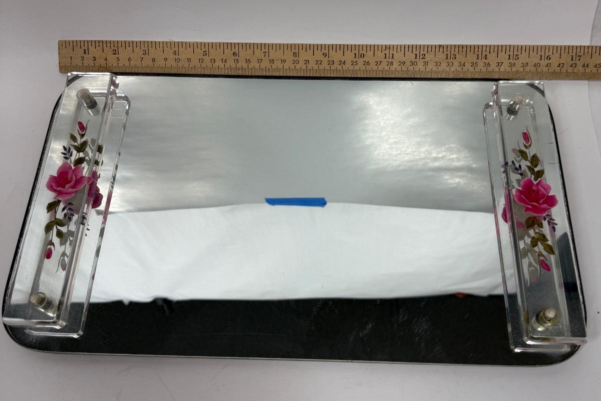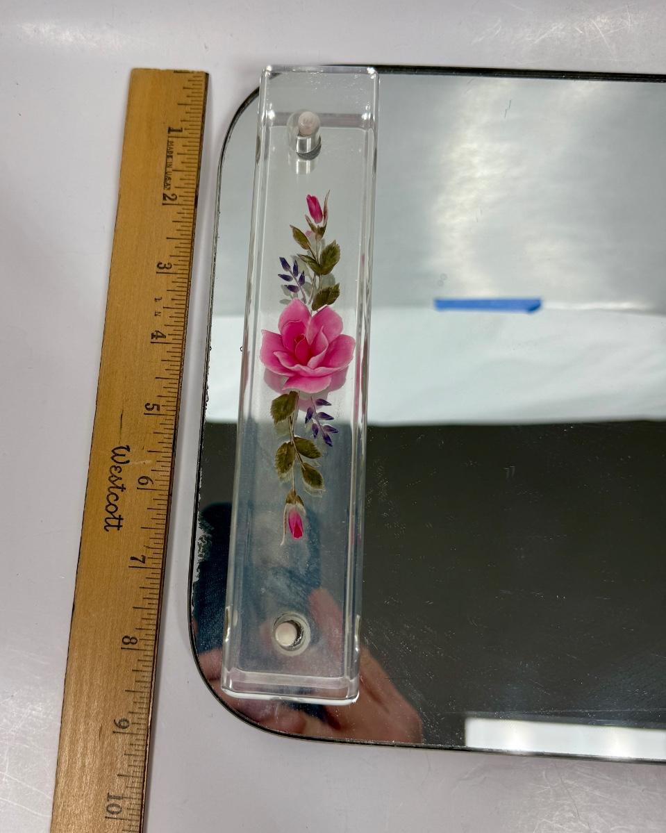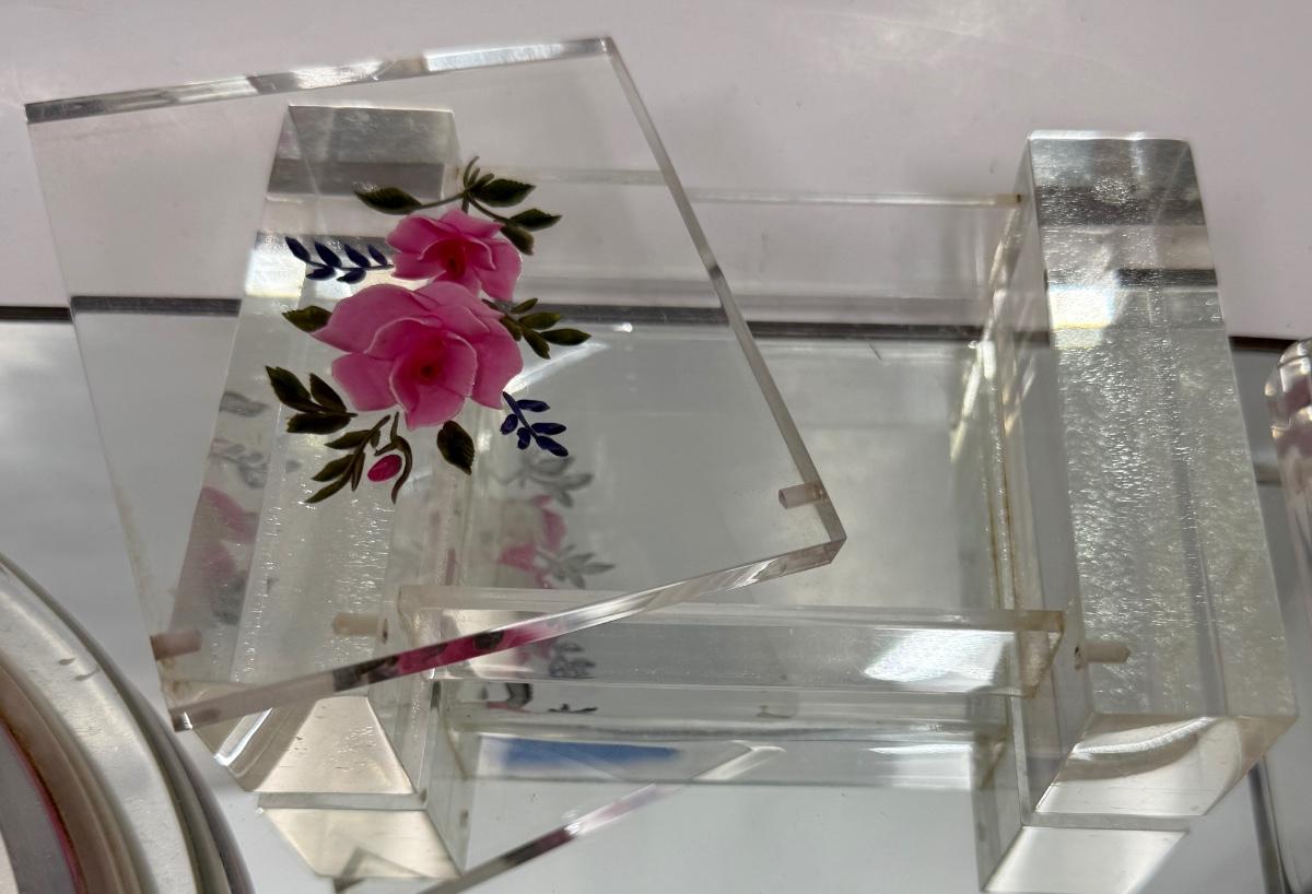 1950’s Pressed Flower Lucite Vanity Set - Lucite Mirrored Tray, Hair Brush, Handheld Mirror and Lidded Vanity Trinket Box