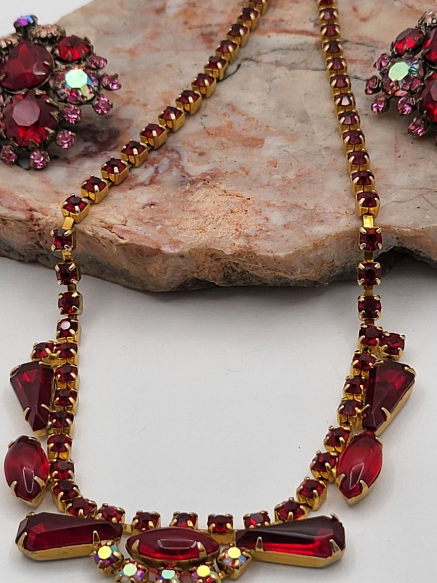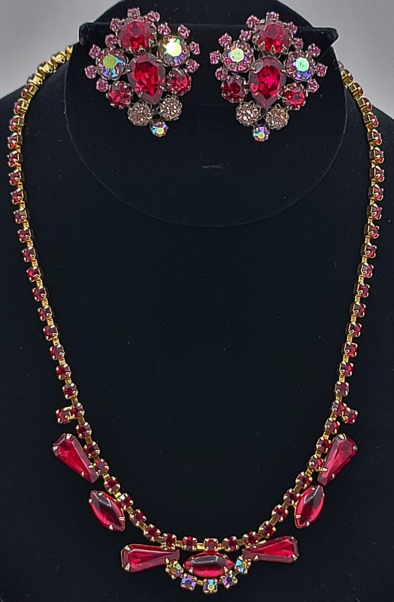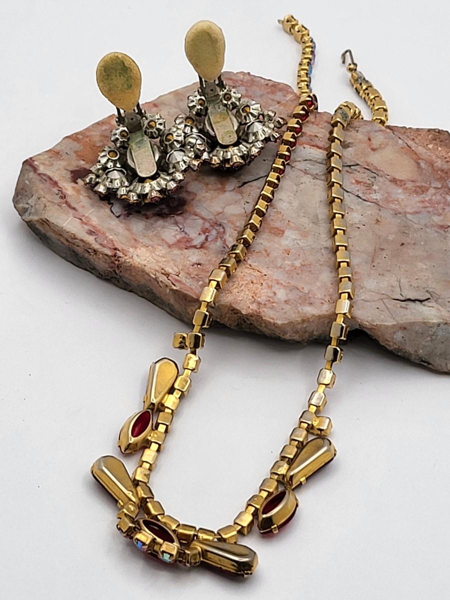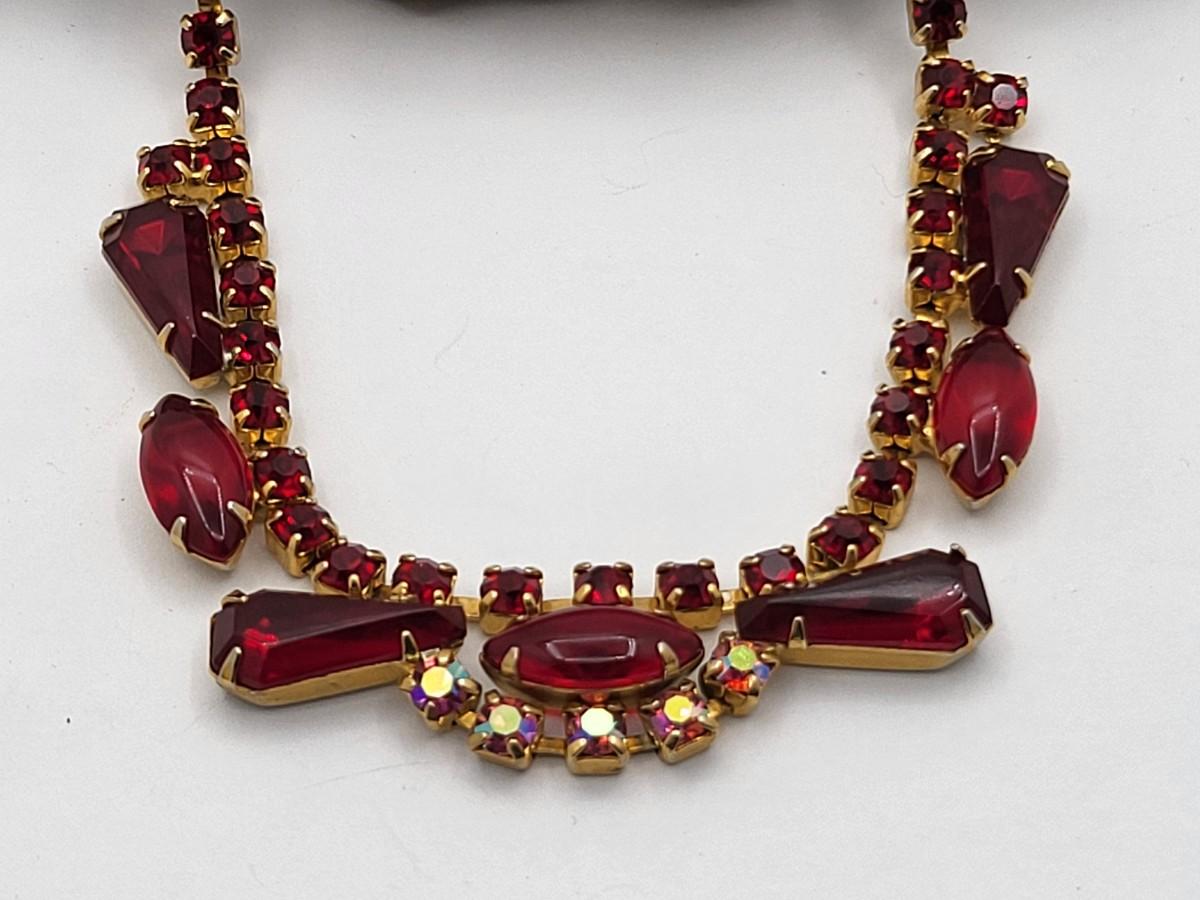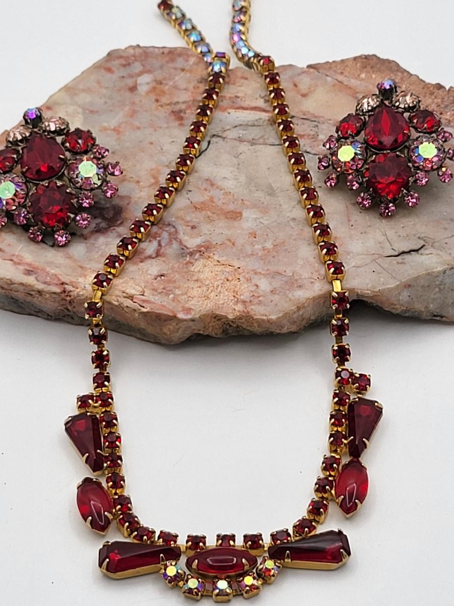 Beautiful ruby red rhinestones and Aurora Borealis Rhinestone choker necklace and clip earrings. Necklace measures 18.5" and the earrings measure 1.25" x 1.5".