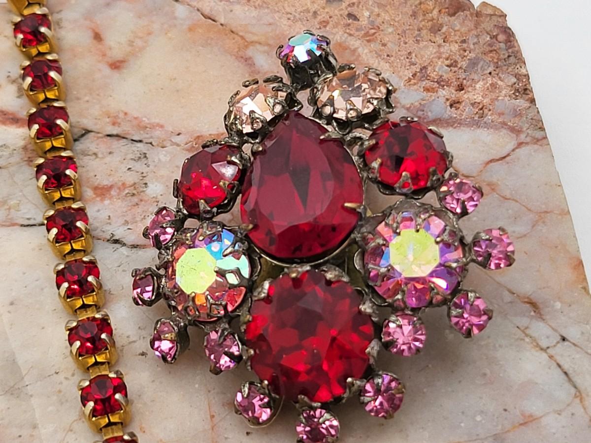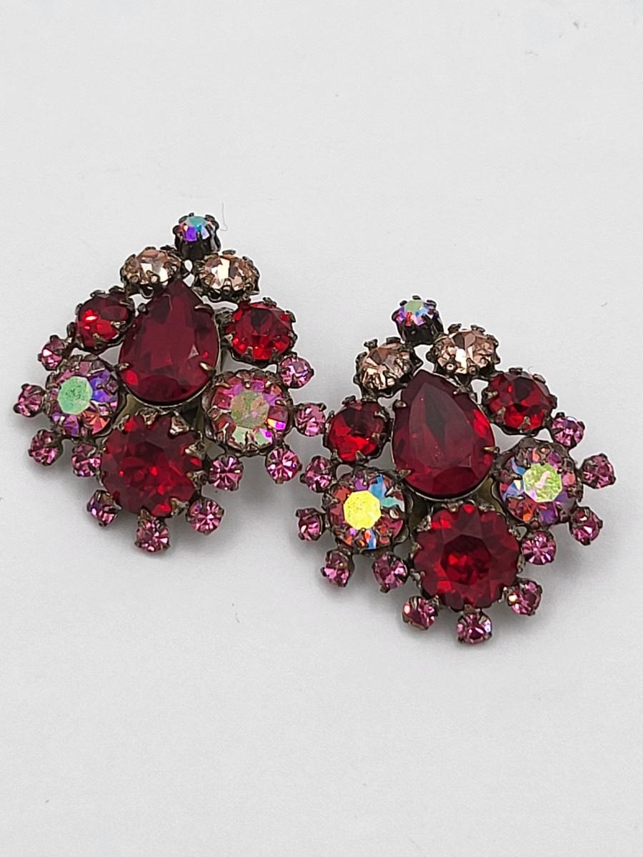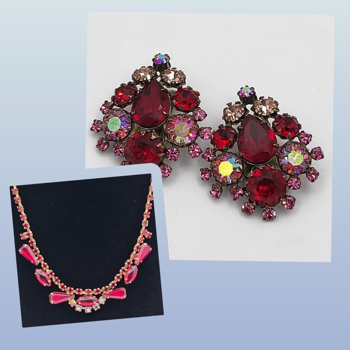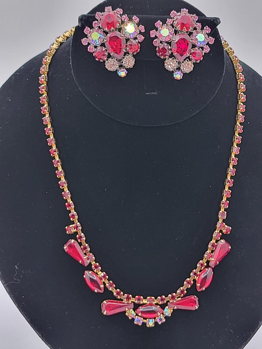 Beautiful ruby red rhinestones and Aurora Borealis Rhinestone choker necklace and clip earrings. Necklace measures 18.5" and the earrings measure 1.25" x 1.5".