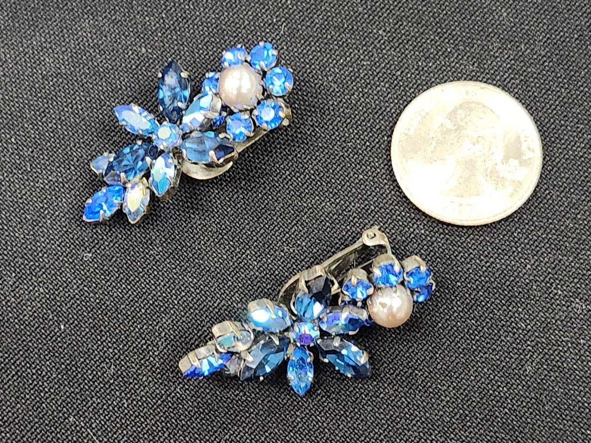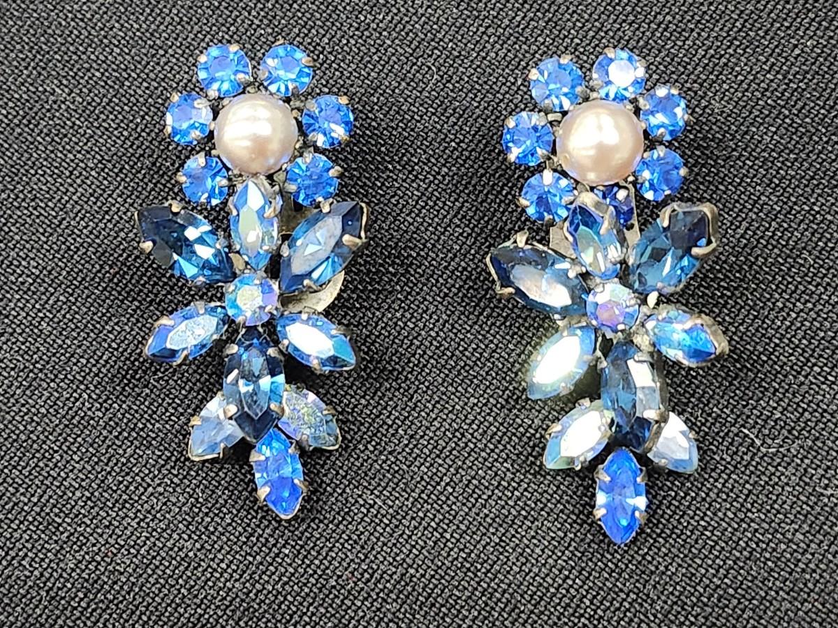 Iridescent blue rhinestones set off a 7.5 mm pearl in these lovely vintage earrings, made in Austria. Excellent condition.