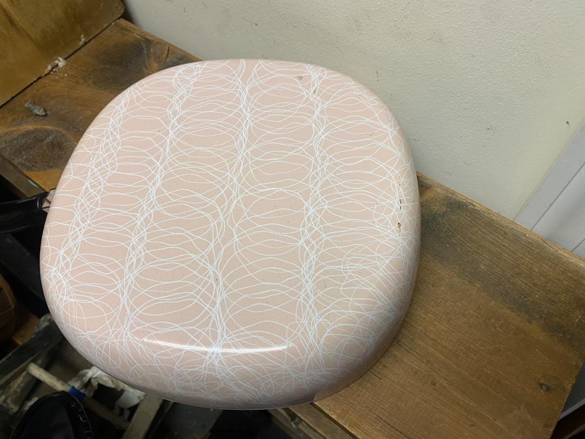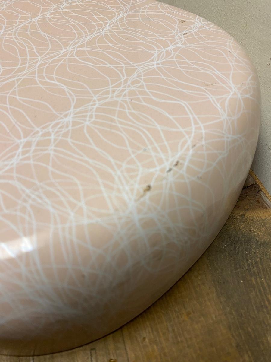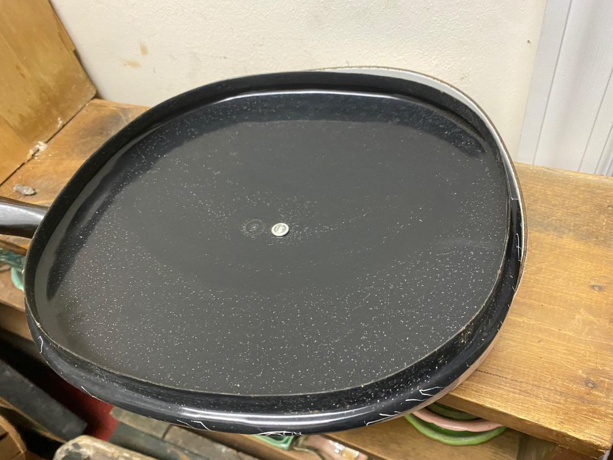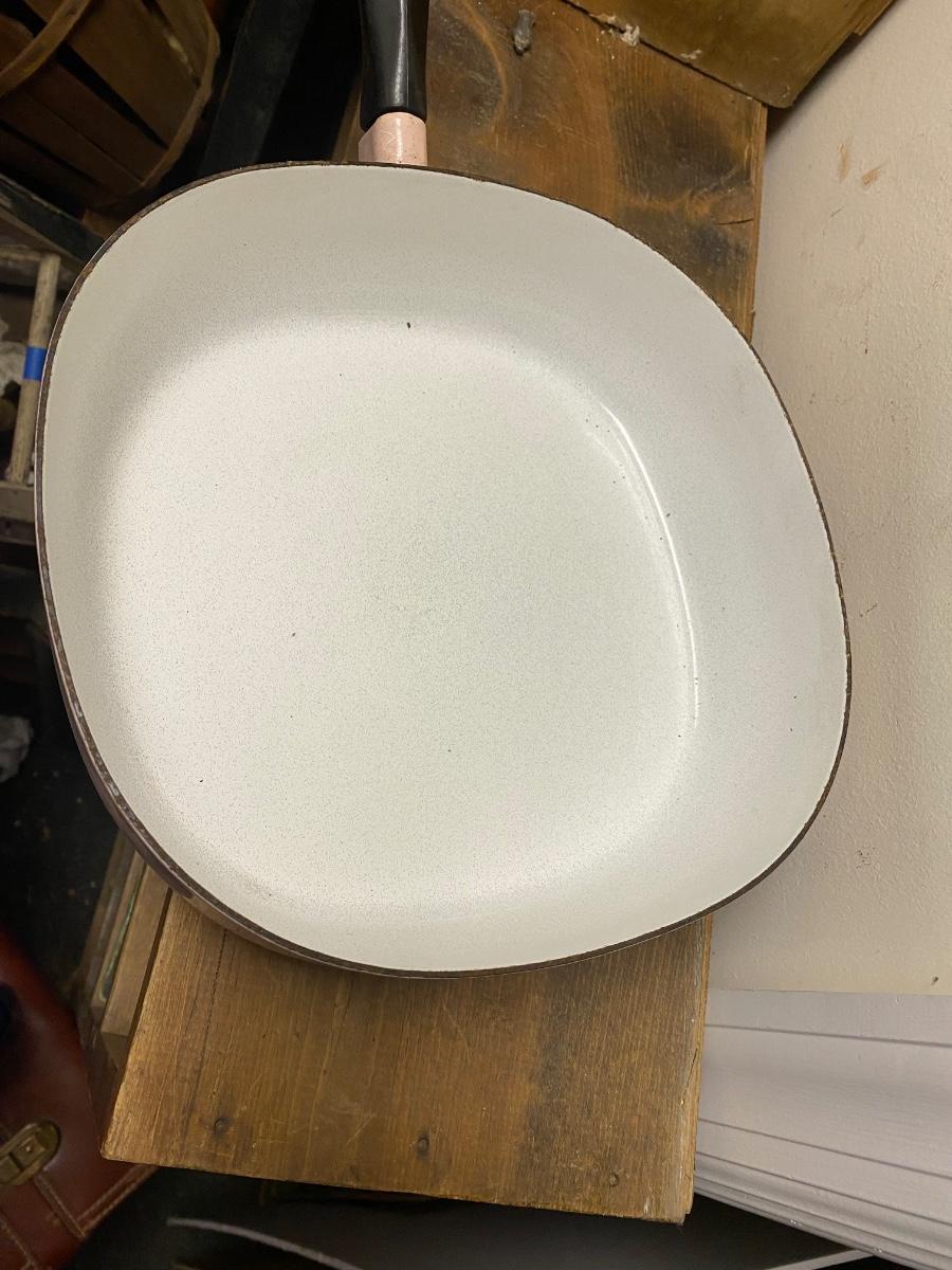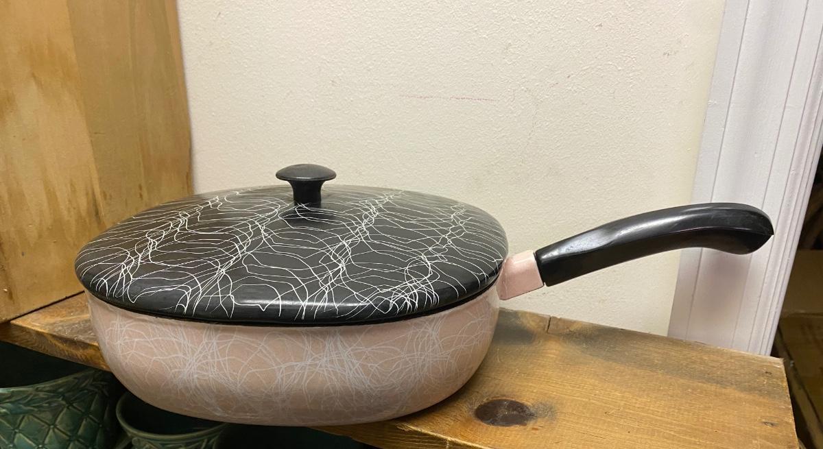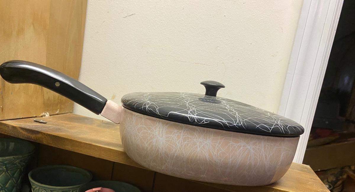 Doesnt' looklike it was ever used though small scuff marks on bottom from storage. Mid-century modern 1950s Serendipity pink and black spaghetti enamel frypan and lid. It has that mix of atomic, modern and kitsch. The spaghetti swirl design gives this utilitarian kitchen item a fun designed look. This pink and black enamel pan has a nice vibrant color.