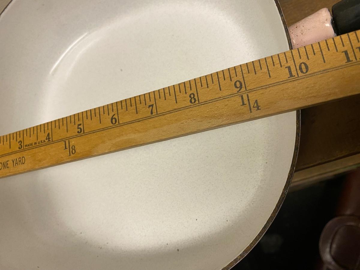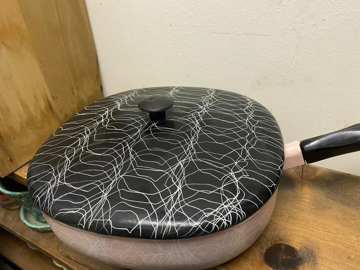 Doesnt' looklike it was ever used though small scuff marks on bottom from storage. Mid-century modern 1950s Serendipity pink and black spaghetti enamel frypan and lid. It has that mix of atomic, modern and kitsch. The spaghetti swirl design gives this utilitarian kitchen item a fun designed look. This pink and black enamel pan has a nice vibrant color.