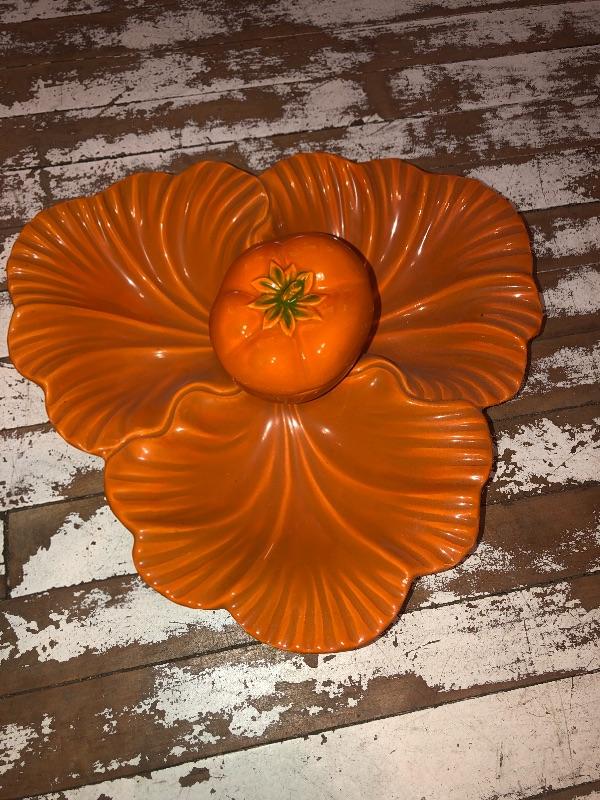 What a fun relish tray for all my MCM lovers out there with the tomato on the top there is a chip on the inside of the tomato and we will show you that in the pictures