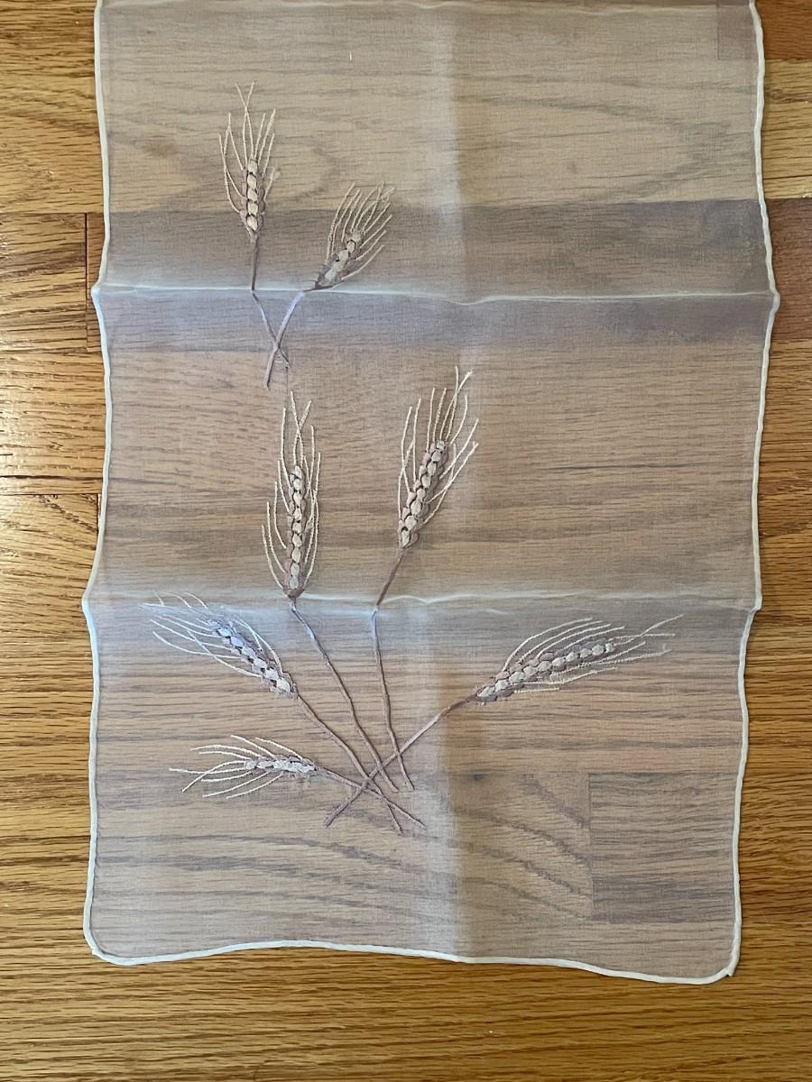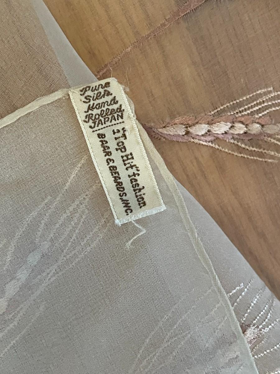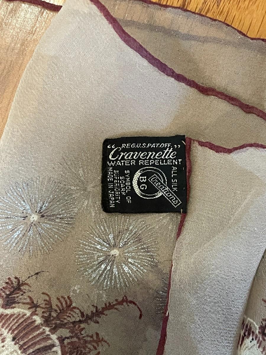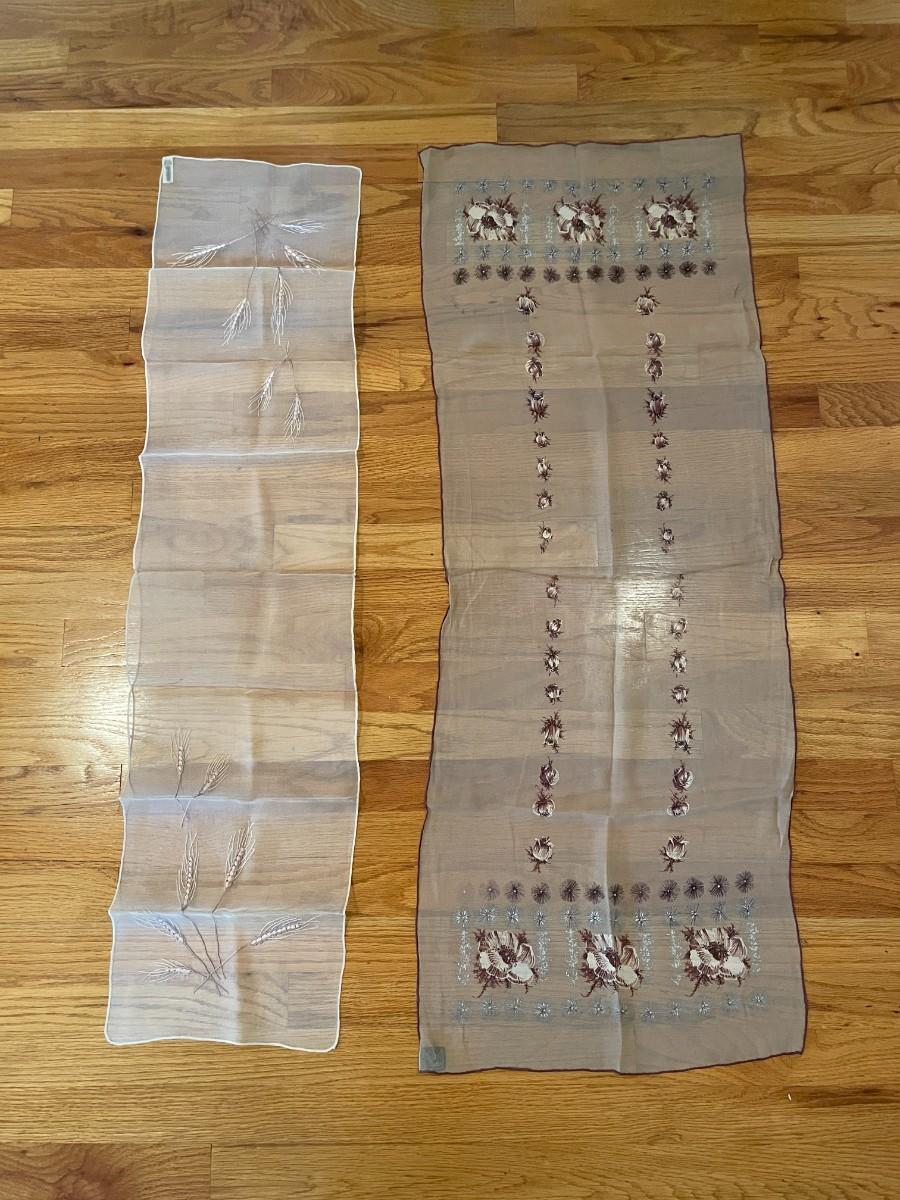 The darker scarf is a Cravenette water repellant all silk scarf by BG Creations made in Japan and is about 17 inches by 45 inches. The design is painted onto the scarf. The smaller scarf is Top Hit Fashion by Baar and Beards Inc and measures about 10.5 inches by 46 inches. It is pure silk, hand rolled, made in Japan and the wheat design is embroidered into the silk. Both scarves are in excellent condition.