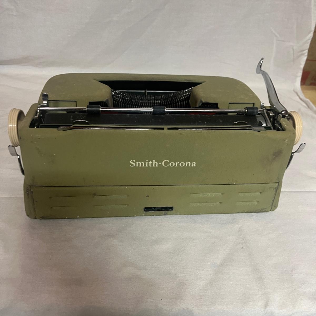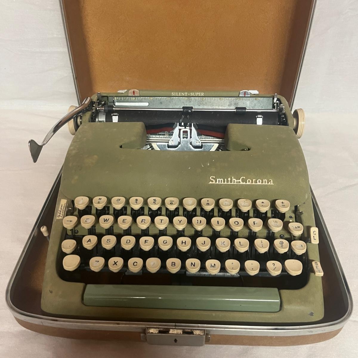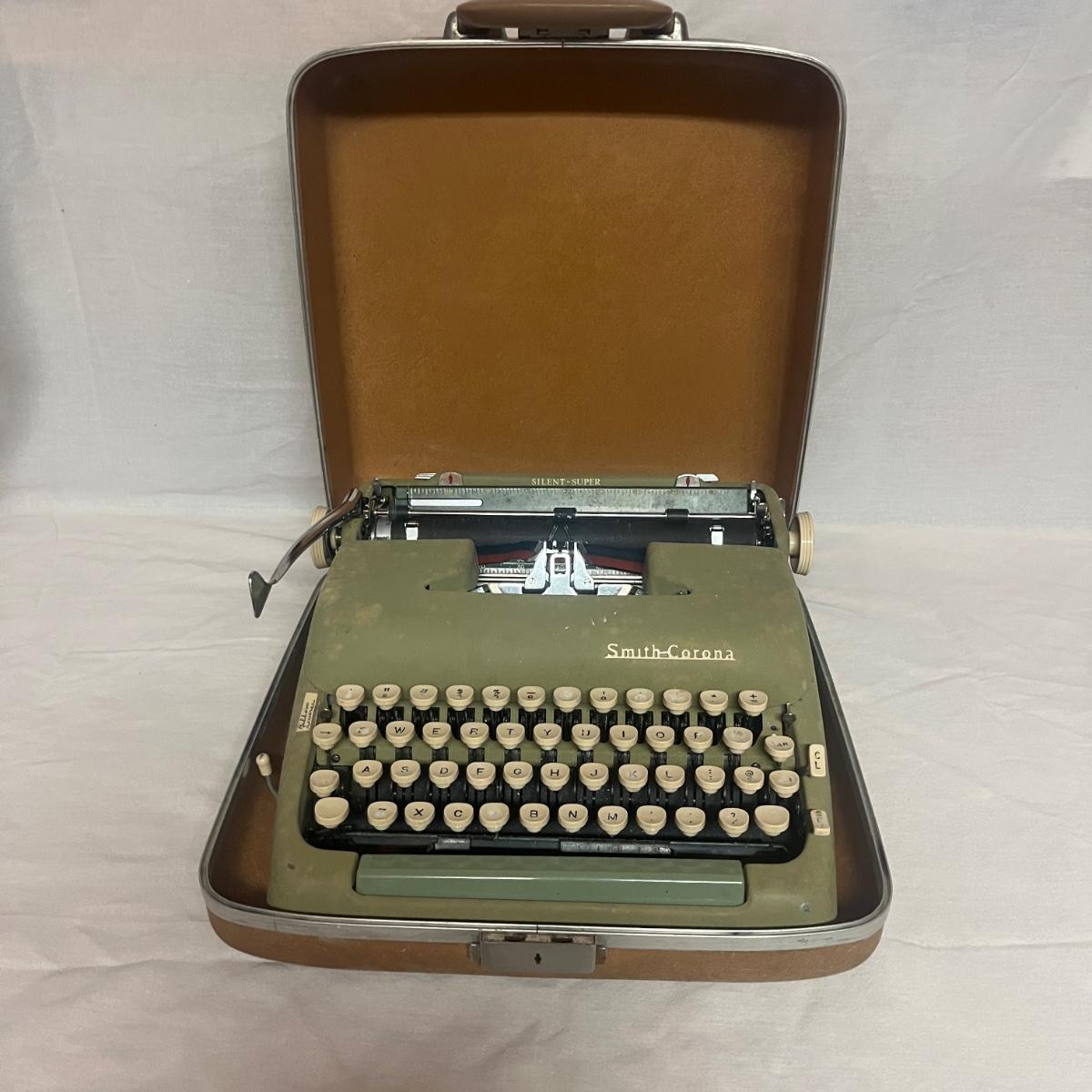 Lot includes a Smith Corona Silent-Super portable typewriter in case. Case measures 13” x 13” x 6”H. Typewriter keys moved freely when pushed, but ribbon appears to need to be replaced.