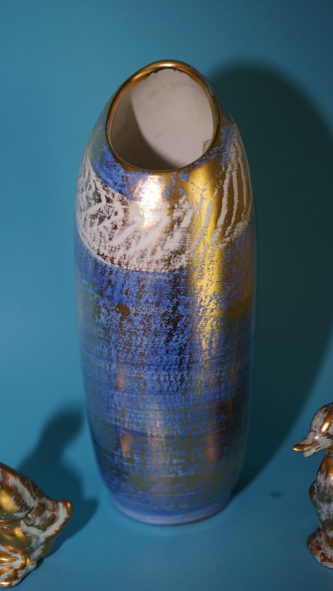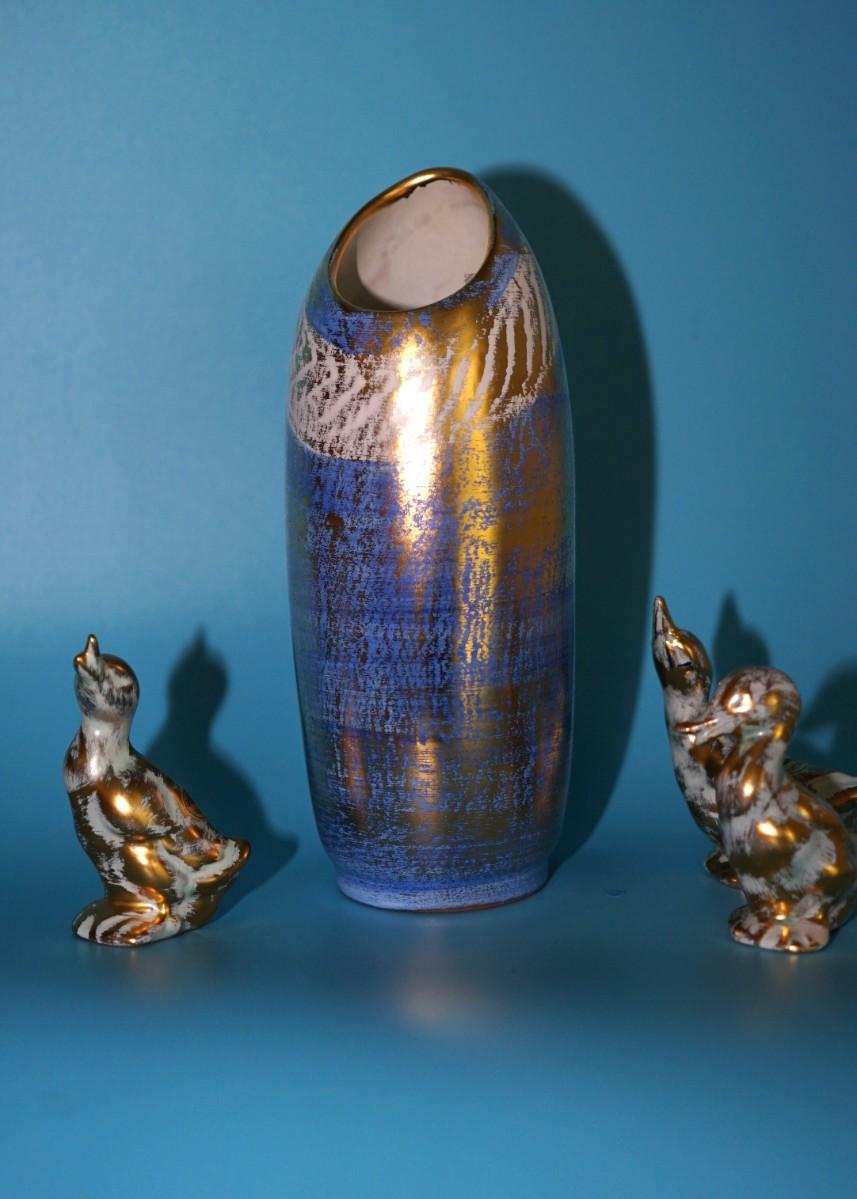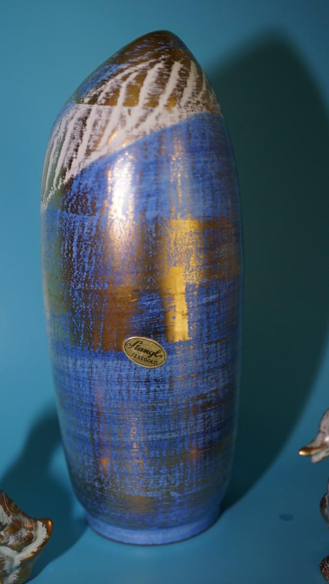 a fun MCM grouping of a classic blue glazed vase with gold and white decoration.