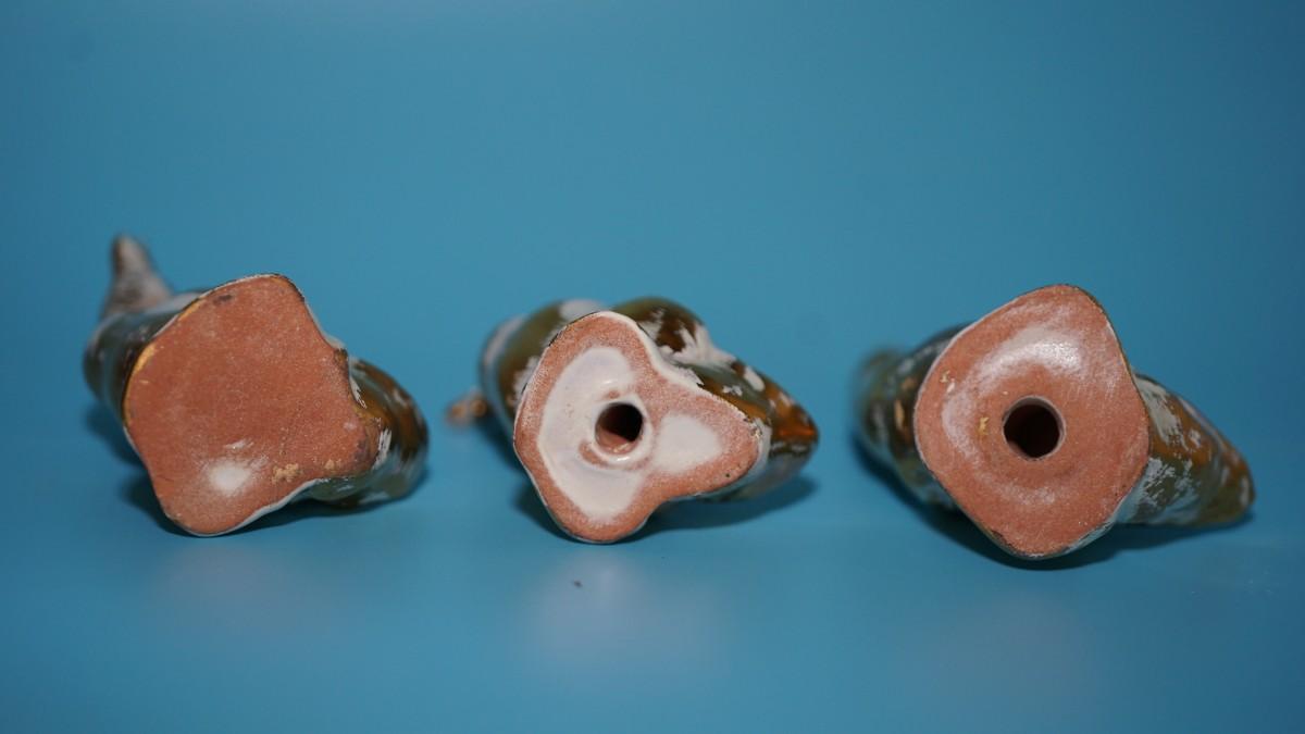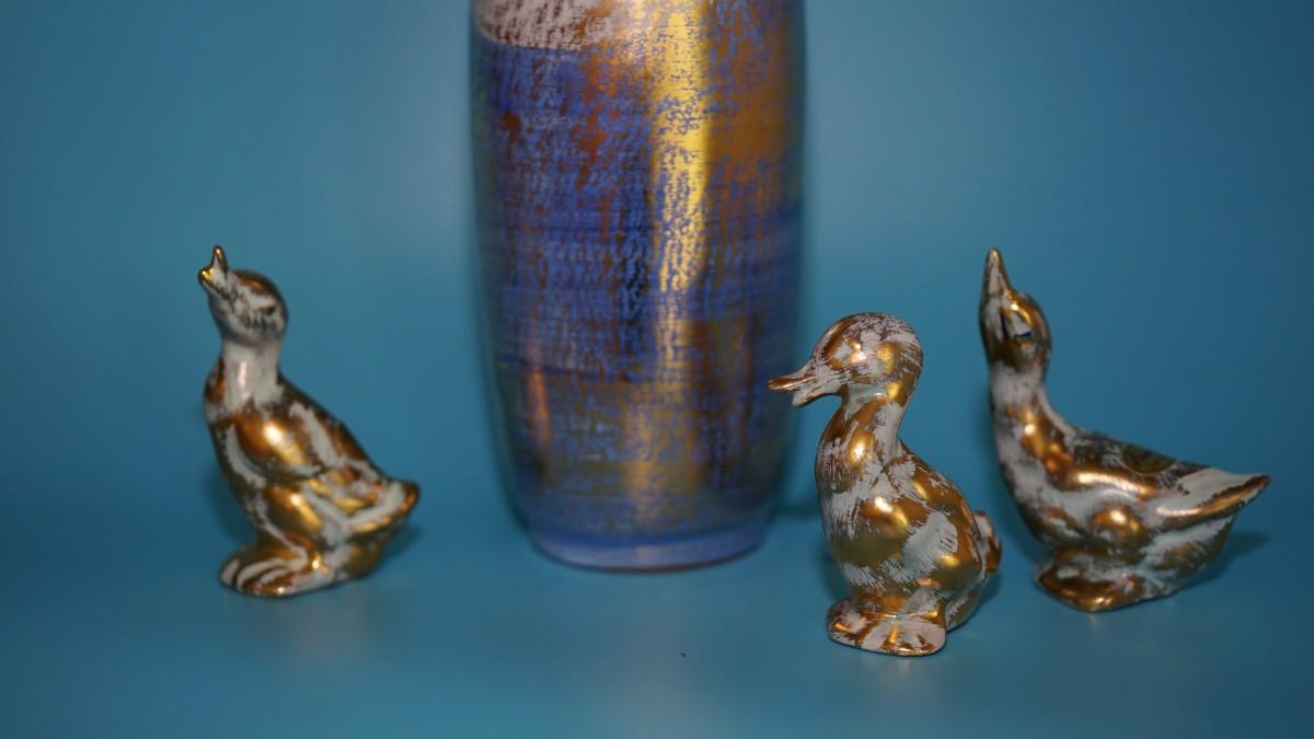 1950's STANGLE BLUE W/ GOLD VASE W/ THREE CERAMIC 3 3/4" DUCKS OF WHITE WITH GOLD.