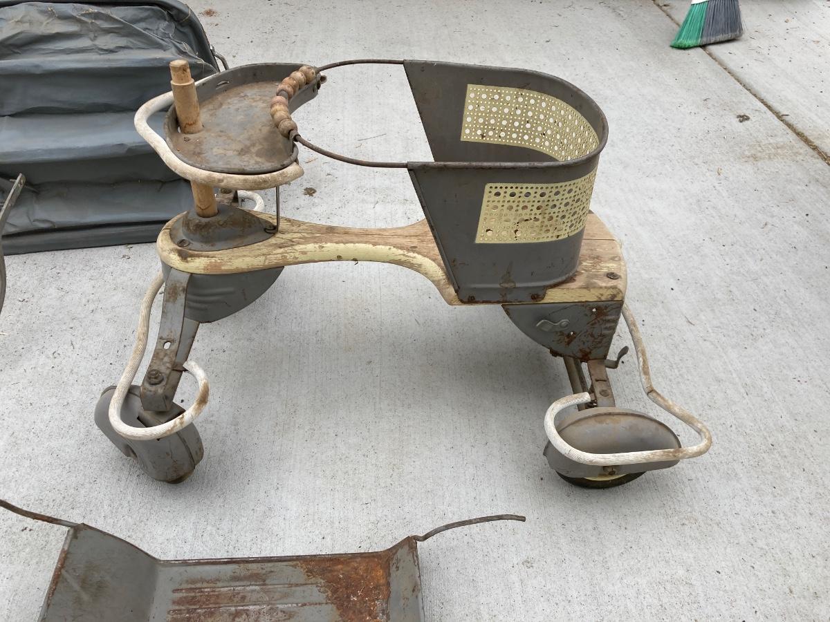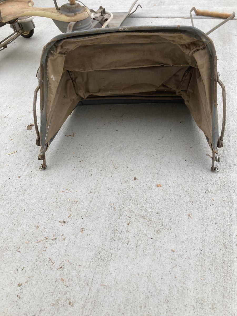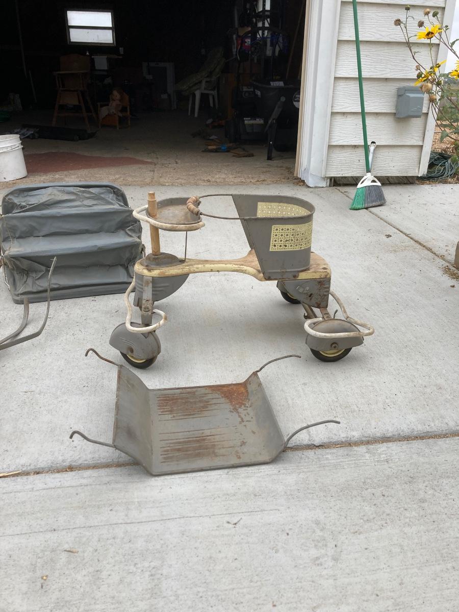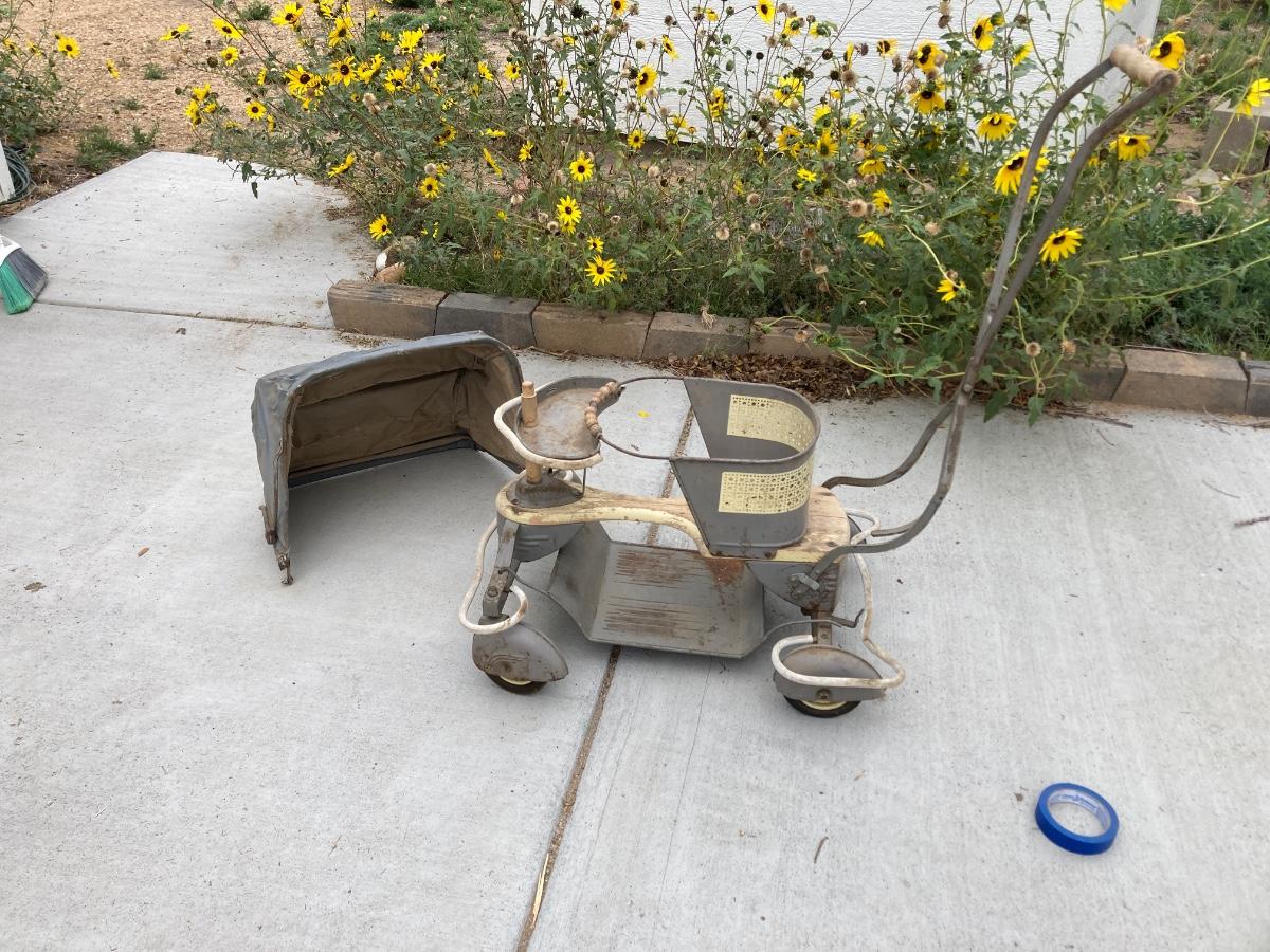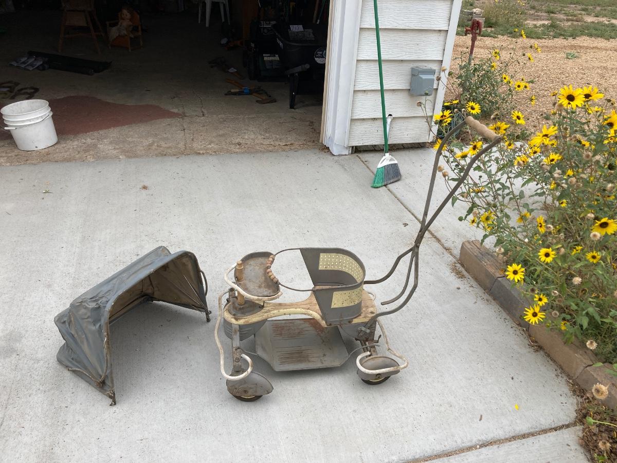 TOTALLY COOL OLD STROLLER, NOT SURE HOW THR CANOPY SHOULD BE ATTACHED OR IF IT INDEED REALLY GOES WITH THIS PIECE BUT THE COLOR MATCHES AND THEY WERE FOUND TOGETHER.