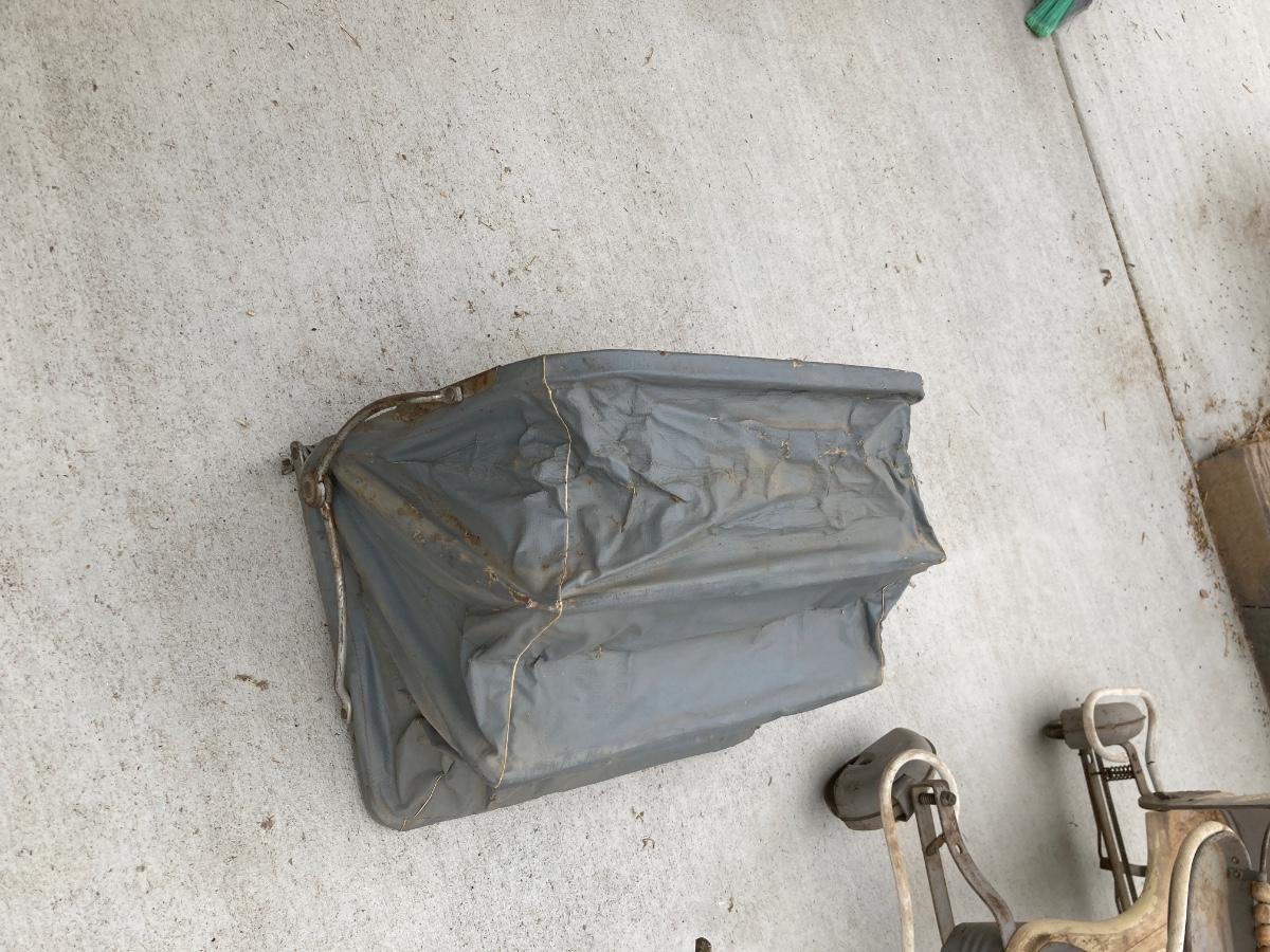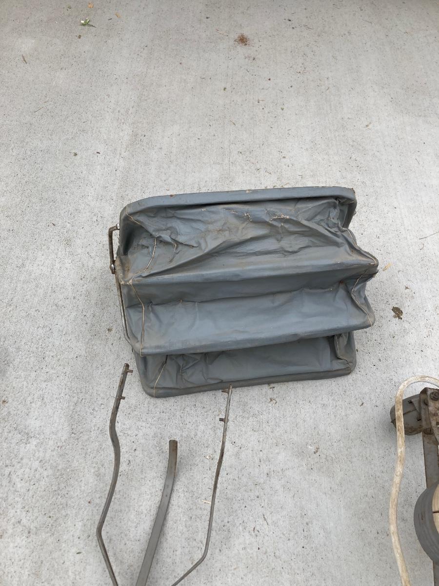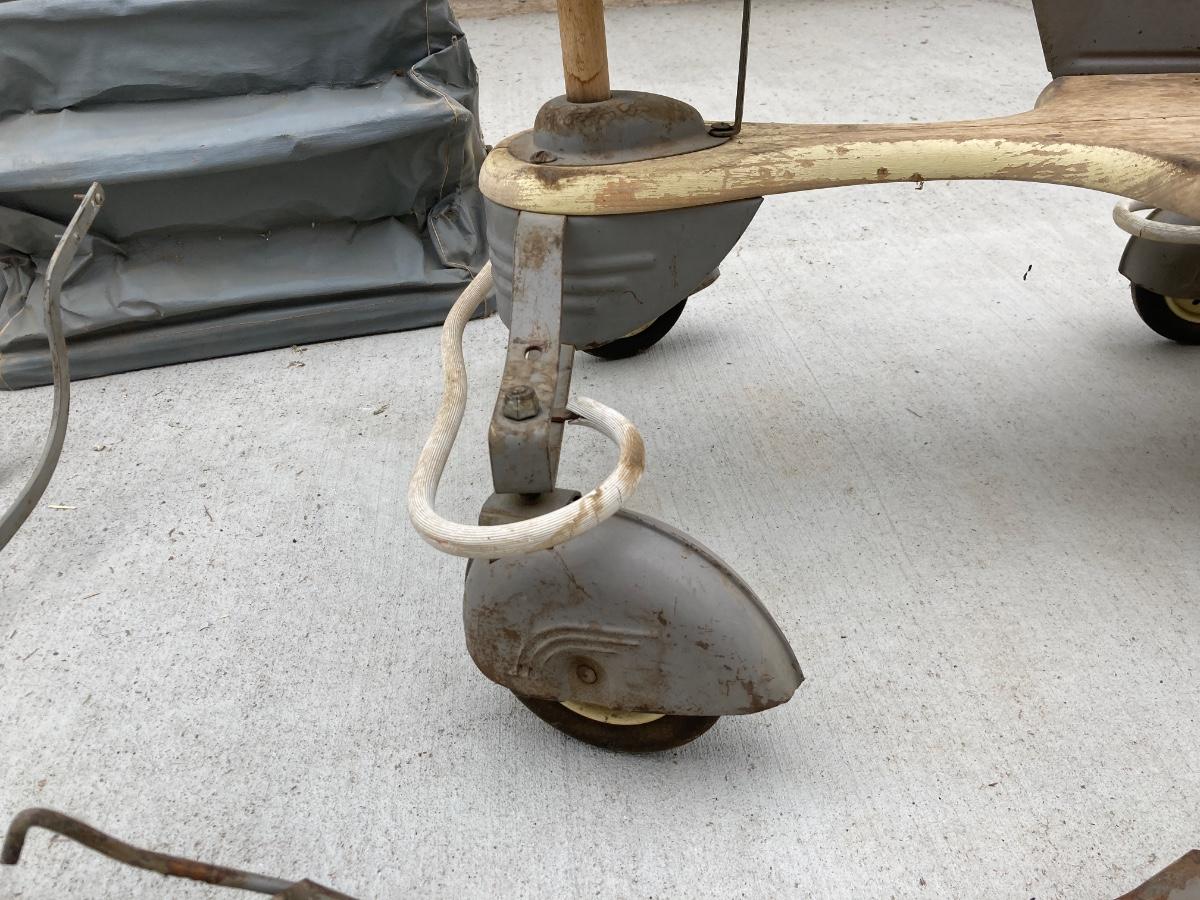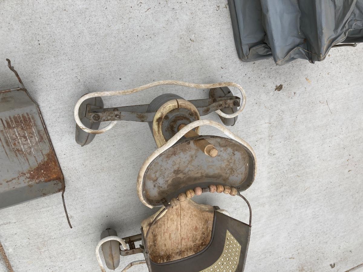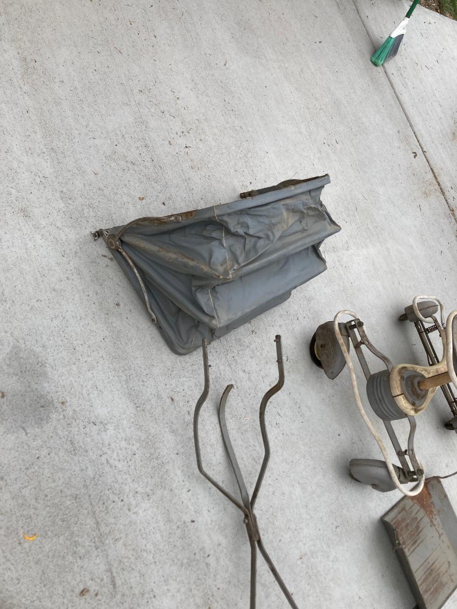 TOTALLY COOL OLD STROLLER, NOT SURE HOW THR CANOPY SHOULD BE ATTACHED OR IF IT INDEED REALLY GOES WITH THIS PIECE BUT THE COLOR MATCHES AND THEY WERE FOUND TOGETHER.