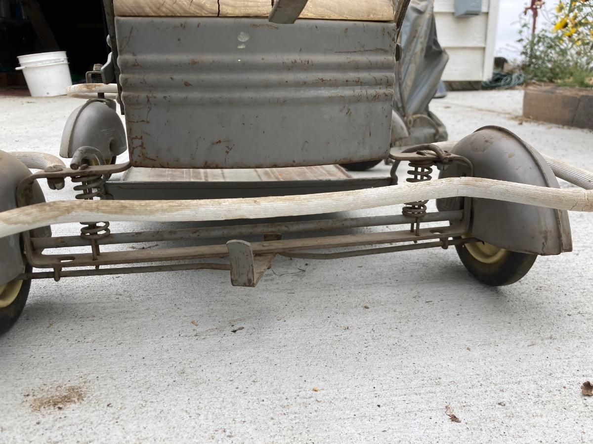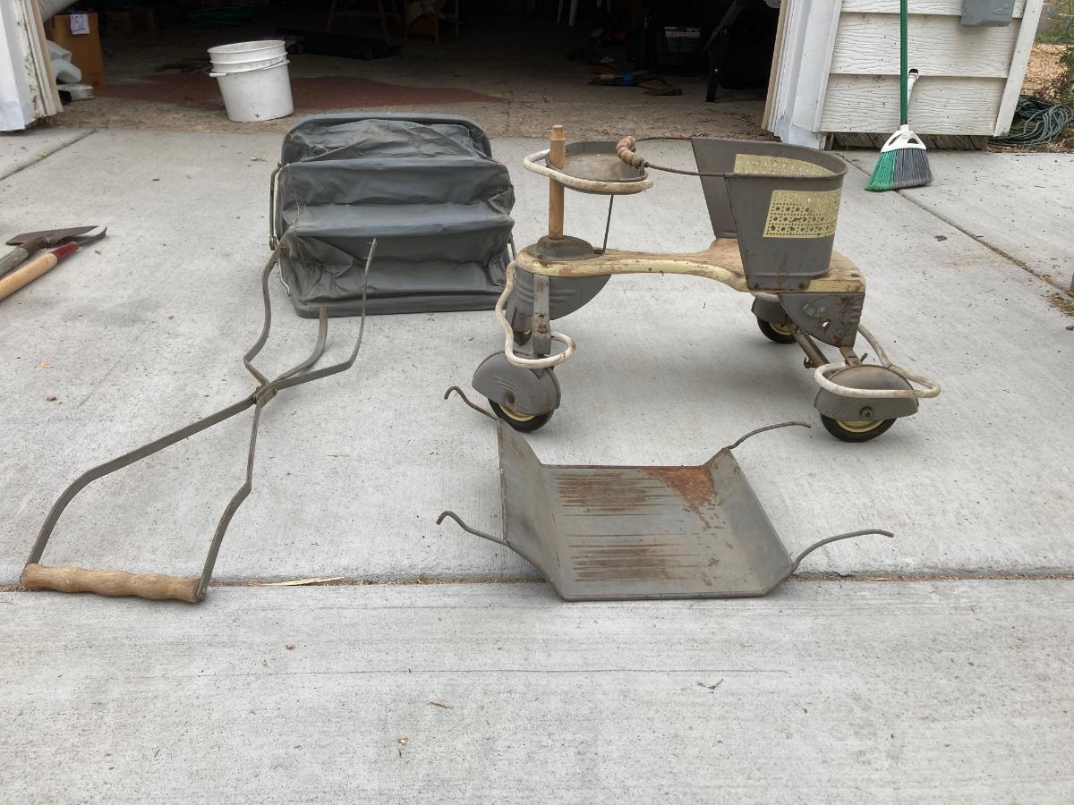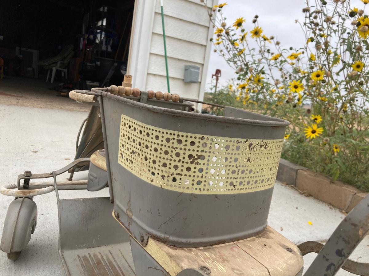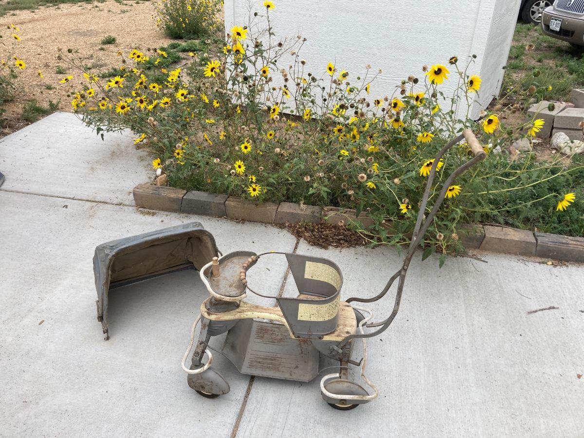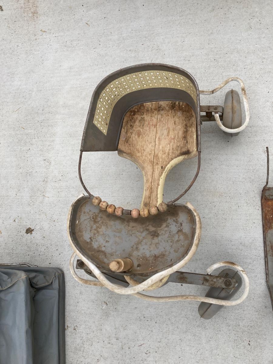 TOTALLY COOL OLD STROLLER, NOT SURE HOW THR CANOPY SHOULD BE ATTACHED OR IF IT INDEED REALLY GOES WITH THIS PIECE BUT THE COLOR MATCHES AND THEY WERE FOUND TOGETHER.