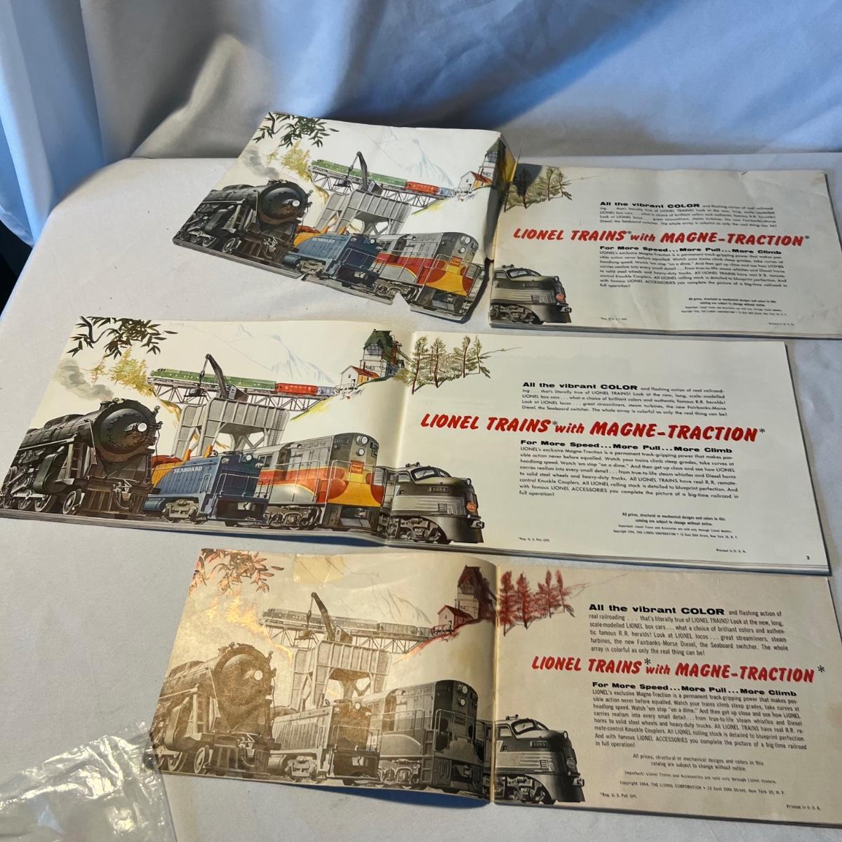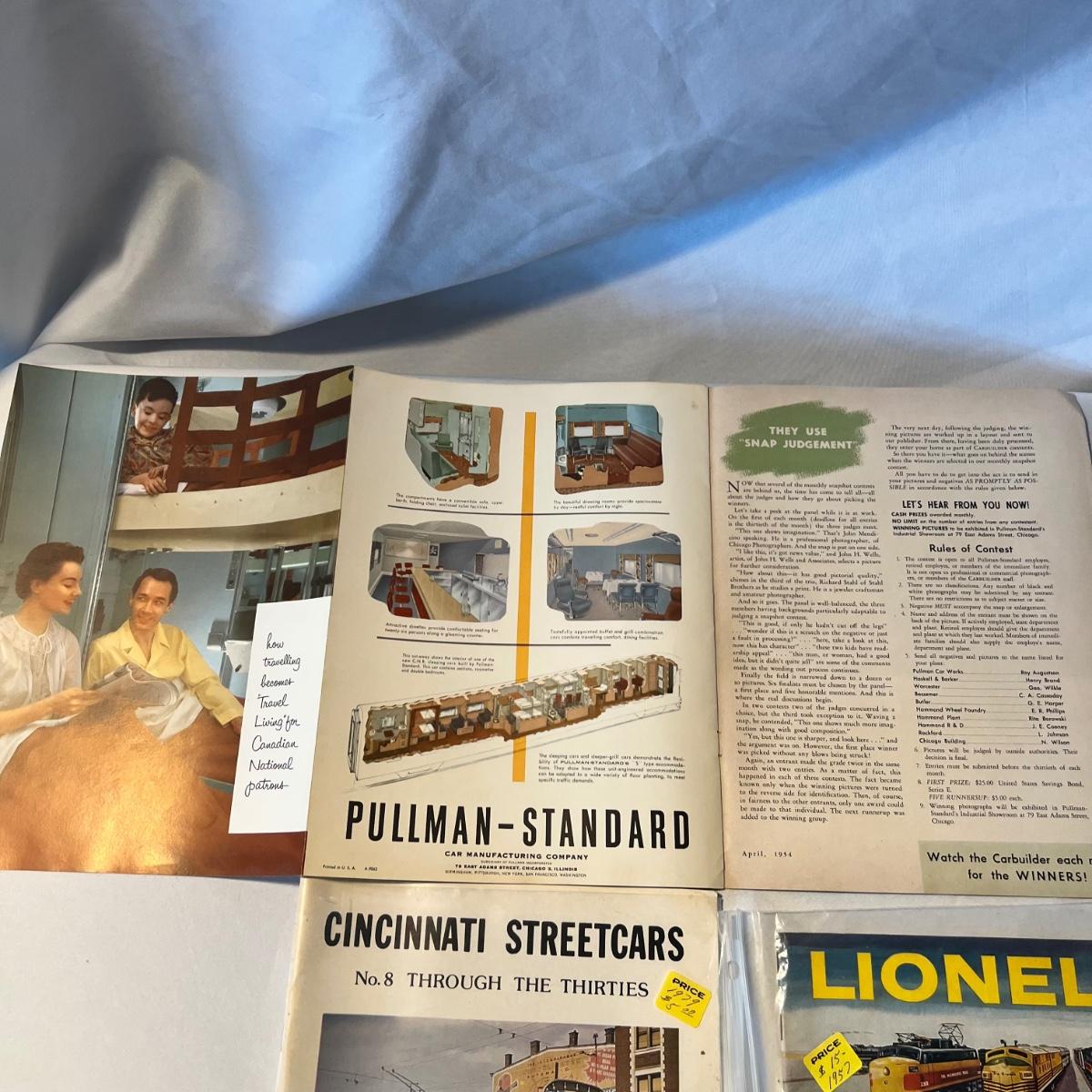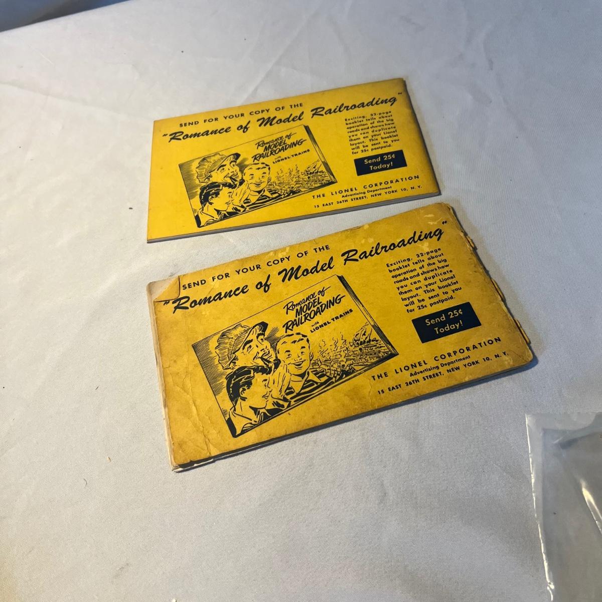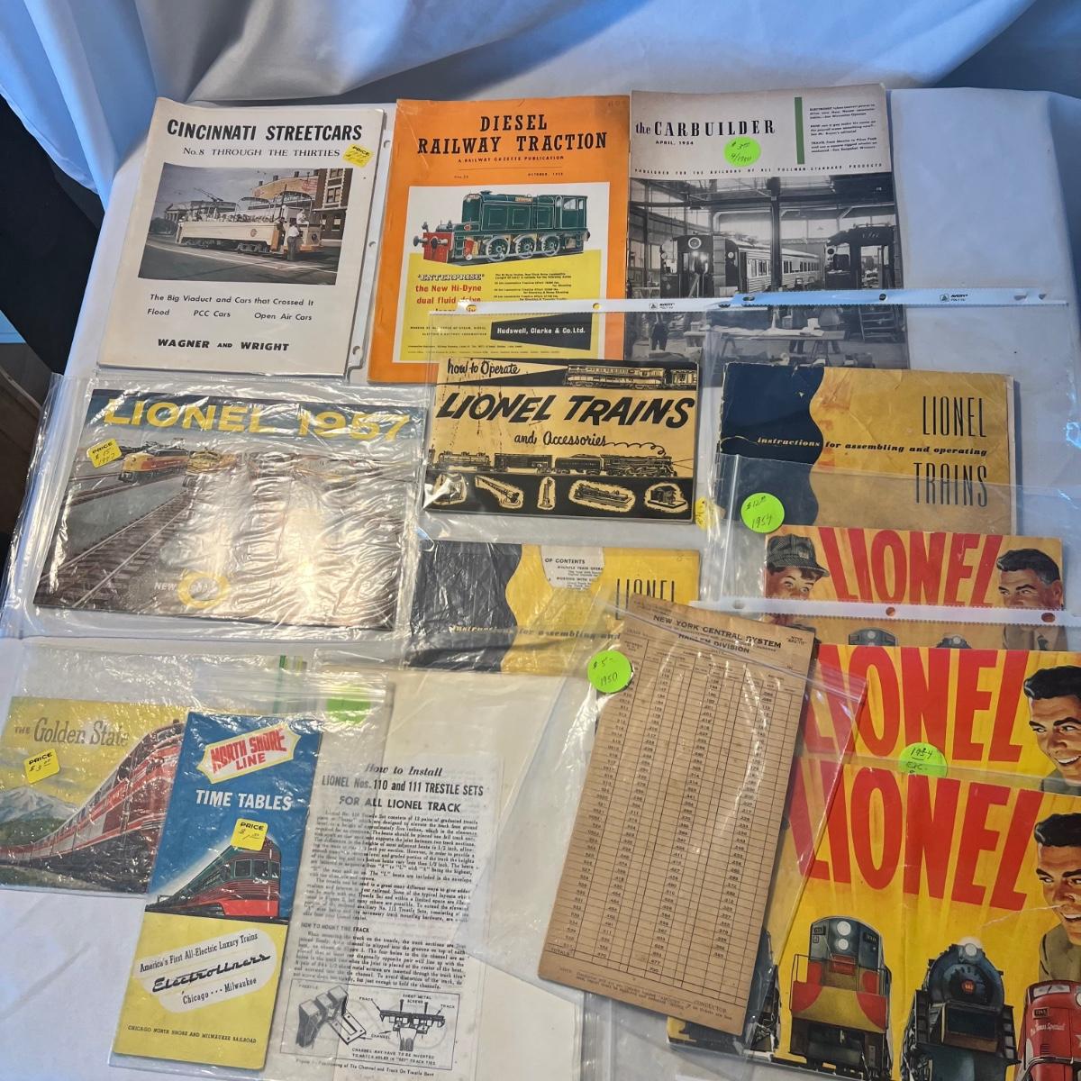 This nostalgic assortment of mostly 1950’s vintage items includes brochures, timetables and more. See photos for full inventory and note the condition of some items. There are three duplicates of the Lionel brochures with yellow background; two are larger and of these, one is in much better condition. Most items have been stored in individual plastic sleeves. Please note that any price tag seen on an item was not put there by Sterling Transitions and does not reflect the current value of the item.