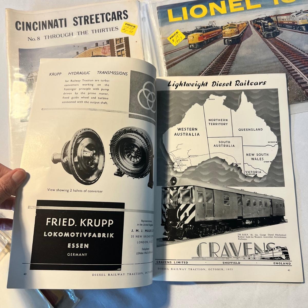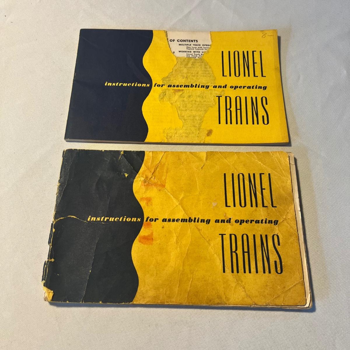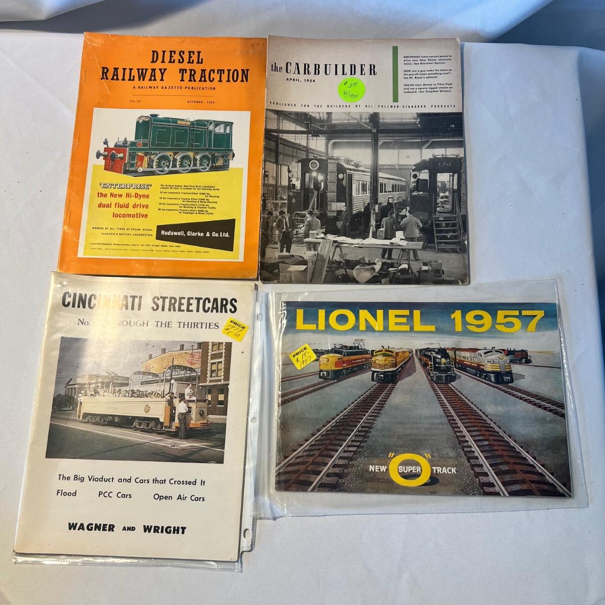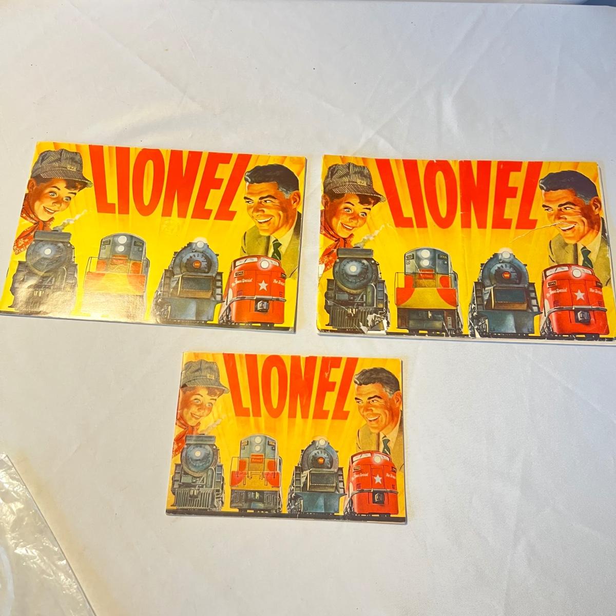 This nostalgic assortment of mostly 1950’s vintage items includes brochures, timetables and more. See photos for full inventory and note the condition of some items. There are three duplicates of the Lionel brochures with yellow background; two are larger and of these, one is in much better condition. Most items have been stored in individual plastic sleeves. Please note that any price tag seen on an item was not put there by Sterling Transitions and does not reflect the current value of the item.