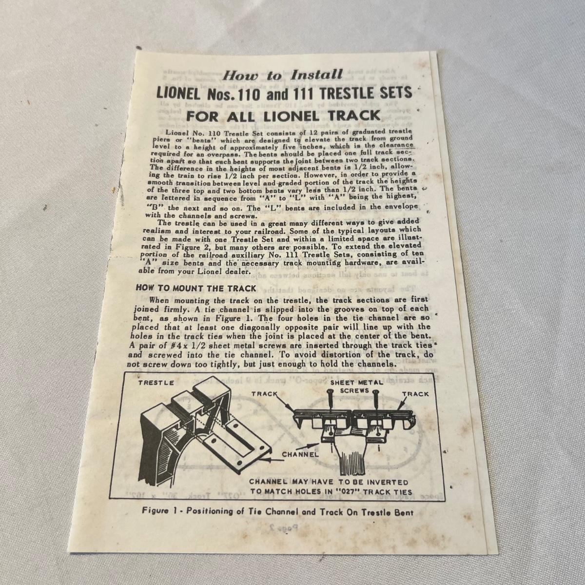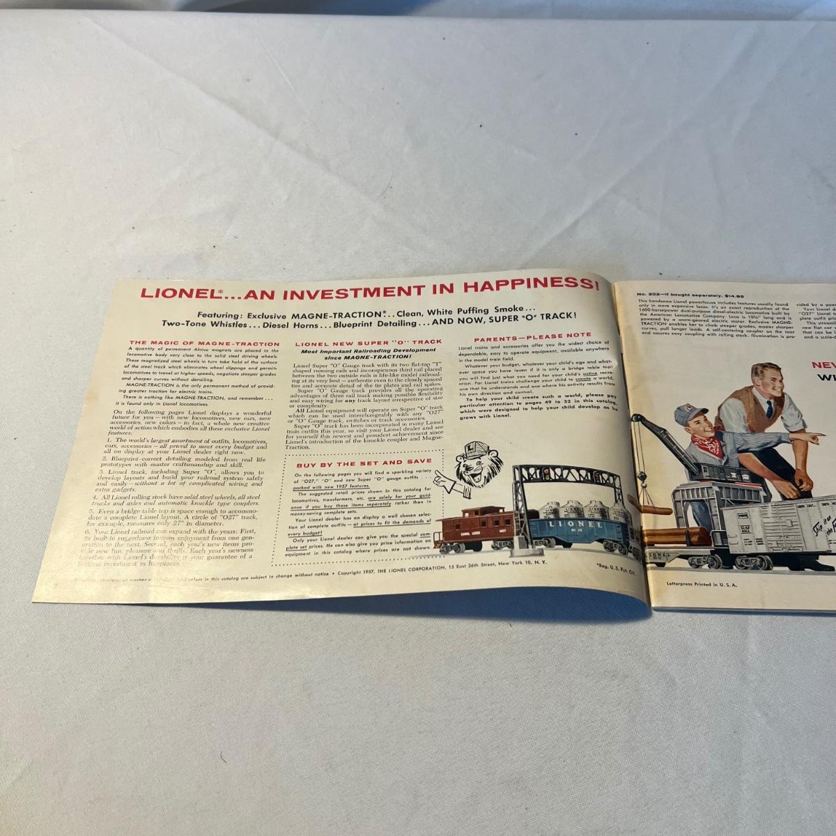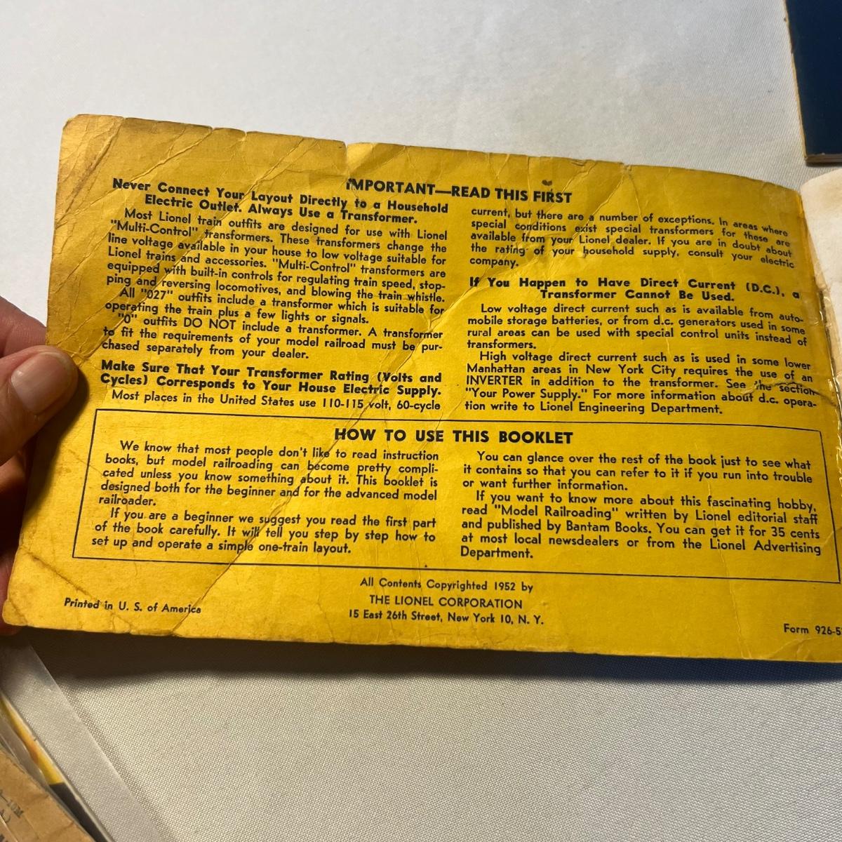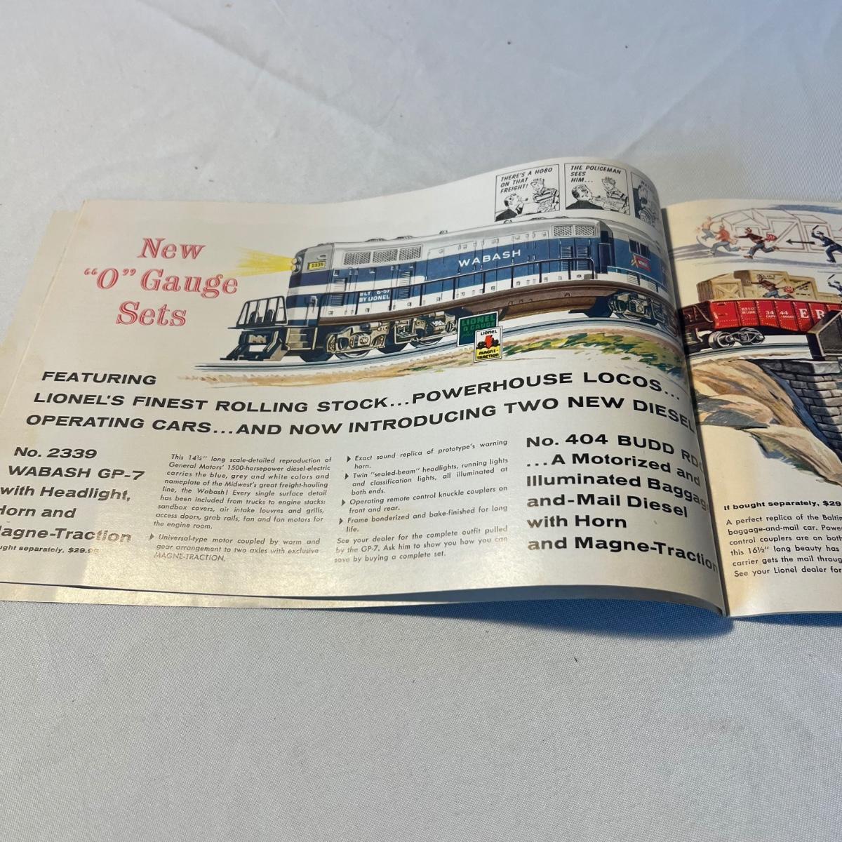 This nostalgic assortment of mostly 1950’s vintage items includes brochures, timetables and more. See photos for full inventory and note the condition of some items. There are three duplicates of the Lionel brochures with yellow background; two are larger and of these, one is in much better condition. Most items have been stored in individual plastic sleeves. Please note that any price tag seen on an item was not put there by Sterling Transitions and does not reflect the current value of the item.