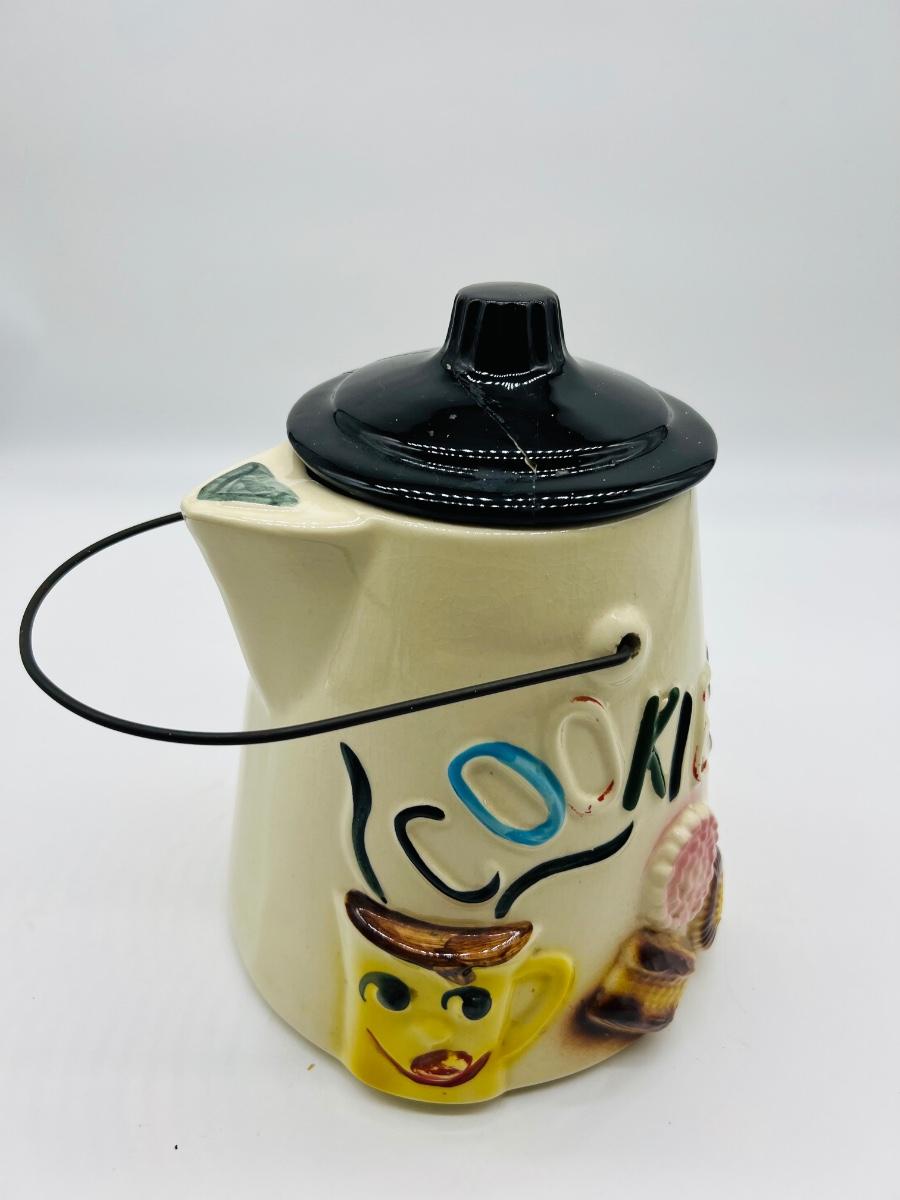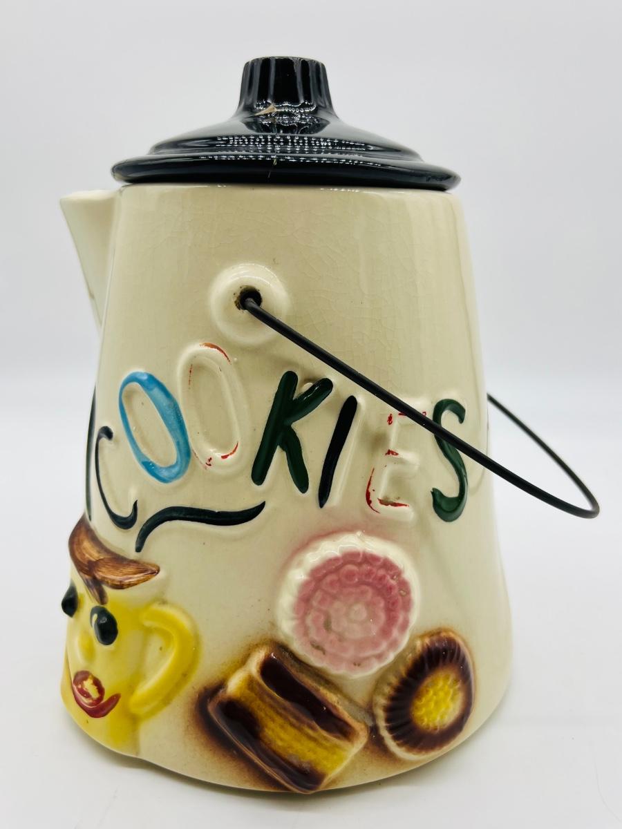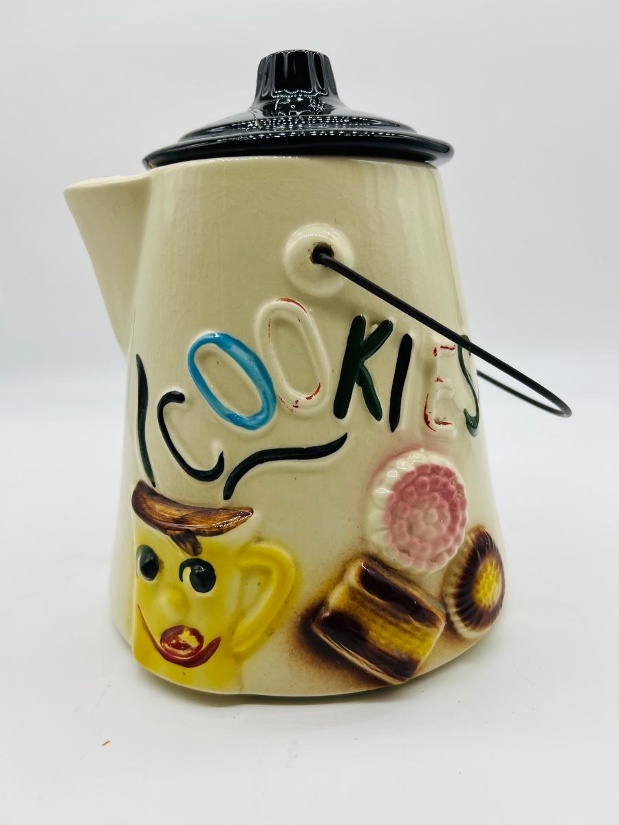 Vintage Cookie Jar Coffee Pot 1950s - American Bisque measures 10 inches tall and approximately 9 inches wide. Lid does have a chip/crack see pictures.
